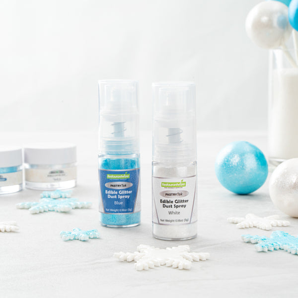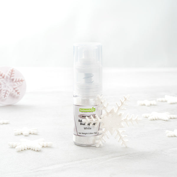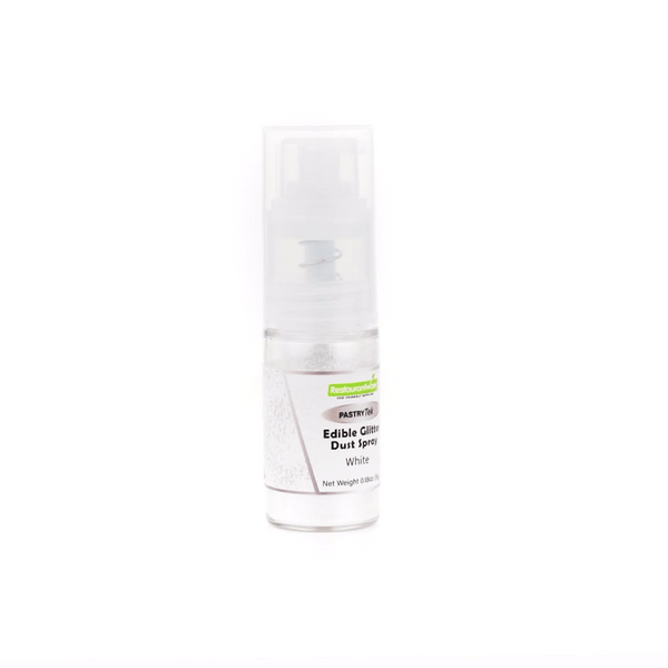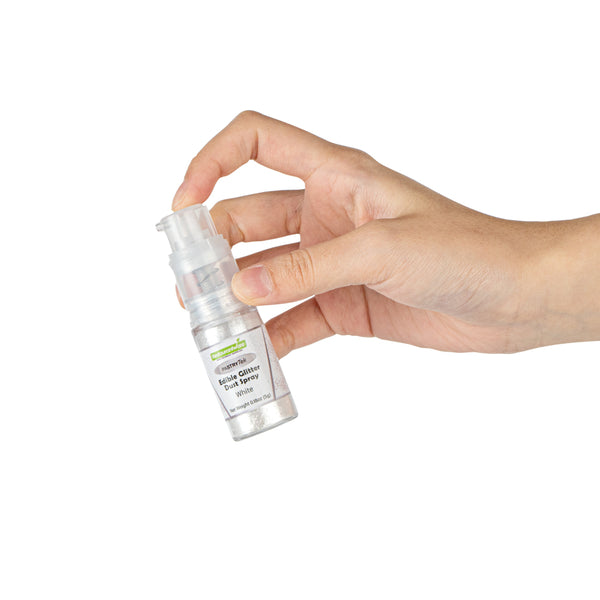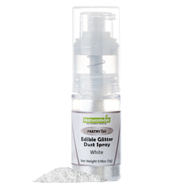 Easily upgrade any dessert or beverage using our Pastry Tek 5-Gram White Edible Glitter Dust Spray. To sprinkle on any hot or cold food and drink, this glitter spray is edible. Plus, this edible glitter spray is water-soluble to effortlessly combine with various wet ingredients. Constructed with a non-aerosol pump spray, this shimmer spray for cakes is easy-to-use for dusting any kind of fare. This edible glitter spray for cakes is FDA-approved, kosher-certified, and vegan to meet customers' dietary needs. To maintain its high quality, store it in a cool, dry environment away from direct sunlight. Featuring a classic white shimmer finish, this glitter spray complements the appearance of any drink or cookie. This edible glitter spray has a capacity of 5 grams, ideal for any large edible project. Sold in a 1 count box.