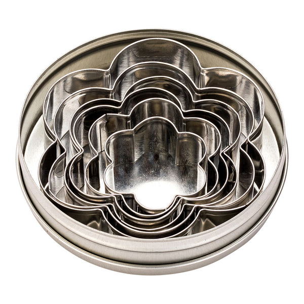 6-PIECE METAL FLOWER COOKIE CUTTER SET IN ROUND TIN BOX