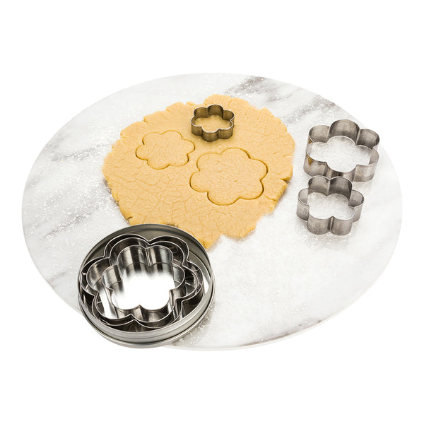 Bake a bouquet of beautiful flower-shaped cookies using our Pastry Tek 6-Piece Metal Flower Cookie Cutter Set in a Round Tin Box. With daisy designs, this set of flower-shaped cookie cutters adds an eye-catching look to your delicious baked goods that your guest are sure to enjoy. The cutters of this daisy flower cookie cutter set come in graduated sizes and easily fit into one another for easy storage. Featuring a metal construction, this daisy cookie cutter set can easily cut through thick dough to effortlessly make your delicious oatmeal cookies, sugar cookies, and butter cookies. This daisy-shaped cookie cutter set includes a round tin box to protect against possible damage and loss. The round tin box of this flower pastry cutter is 1 inch tall and has a diameter of 3.9 inches. From smallest to largest, the length of the cutters is as follows: 1.75 inches, 2 inches, 2.45 inches, 2.75 inches, 3.25 inches, 3.5 inches. Each order is sold with a set of 6 cookie cutters in 1 round tin box.