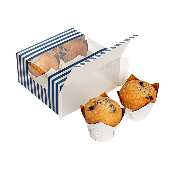 Proudly present your baked delights using our Pastry Tek Blue and White Stripe Paper Pastry / Cake Boxes. These pastry boxes feature a clear window offering optimal visibility for an efficient and attractive dessert display. Made with grease-resistant properties, these treat boxes protect against oil leakage. These bakery boxes are recyclable, providing a simpler approach to curbing waste in your cafe or bakery. The striking blue and White stripe pattern of these cake boxes adds a touch of sophistication, enhancing the appeal of the enclosed treats. Shipped flat for easy storage, these disposable cake boxes are conveniently assembled. Each confection box measures 6.25 inches in length by 6.25 inches in width by 3.25 inches in height. Sold in a 100 count box.
