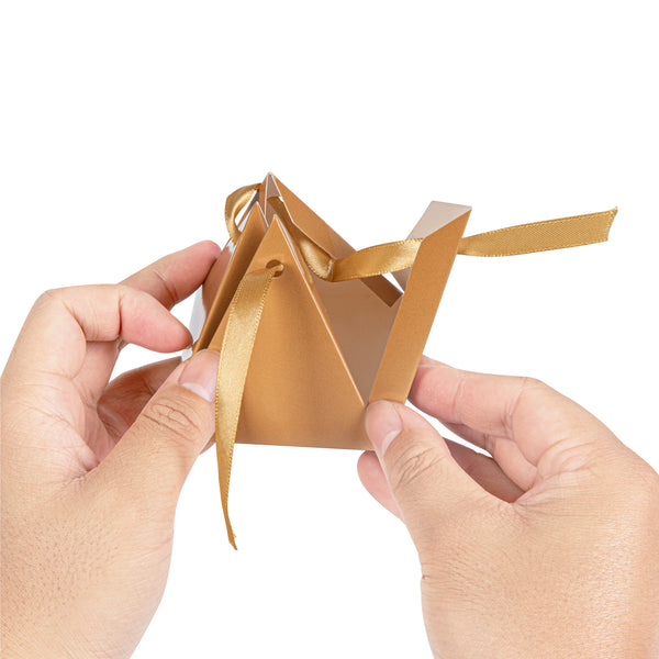 Hand out elegant party favors with our Pastry Tek Brown Pyramid Paper Candy and Gift Boxes. These one-of-a-kind party favor containers have a stylish pyramid design that adds a chic touch to the packaging. The chocolate brown finish on these biodegradable pyramid favor boxes complements your rich chocolate truffles, candies, and gifts. Featuring a bronze satin ribbon, the sides of these pyramid gift boxes are easily tied or unraveled to reveal your gourmet treats. Designed from premium paper, these recyclable brown party favor boxes are durable to hold bite-sized treats. After large events, these favor boxes are conveniently disposable. These candy favor boxes are shipped flat to save you space. These favor containers measure 3 inches long by 3 inches wide and 3 inches tall. Ships in a 100 count box. This item will only degrade outside of the traditional solid waste stream.