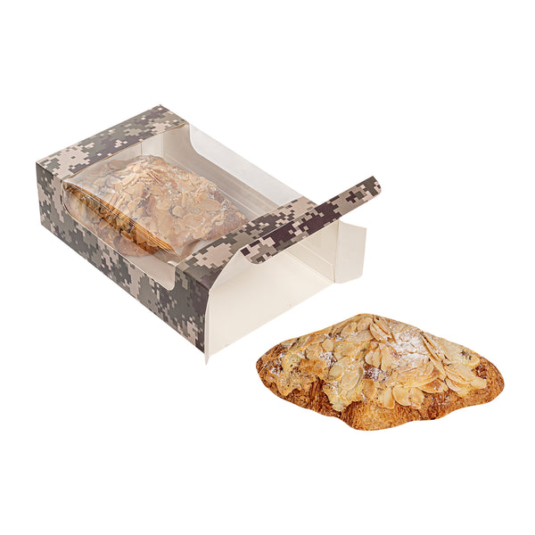 Accentuate your sweet treats with our Pastry Tek Camouflage Paper Pastry / Cake Boxes. These cake boxes feature a clear window, offering remarkable visibility for easier identification and presentation of your pastries. Impervious-to-grease to keep oil stains away, these pastry boxes preserve the neatness of your dessert packaging. These disposable cake boxes are recyclable and provide an effortless and practical way to reduce waste in your bakeshop. Featuring a unique camouflage finish, these paper treat boxes bring a touch of adventurous style to your presentation while highlighting the contents of the box. Delivered flat for efficient storage and easy assembly, these camouflage pastry boxes measure 7.75 inches in length by 4.75 inches in width by 2.25 inches in height. Sold in a 100 count box.