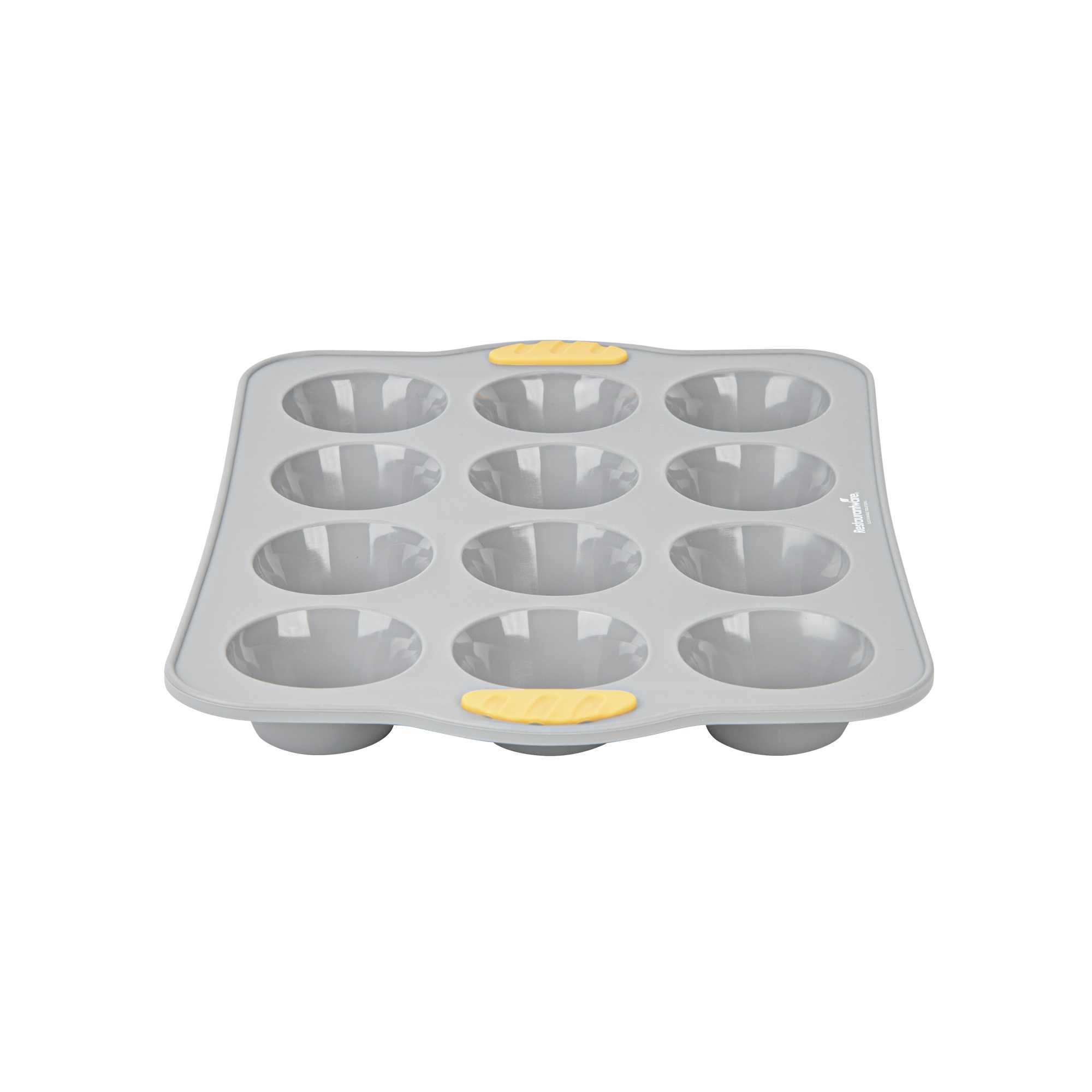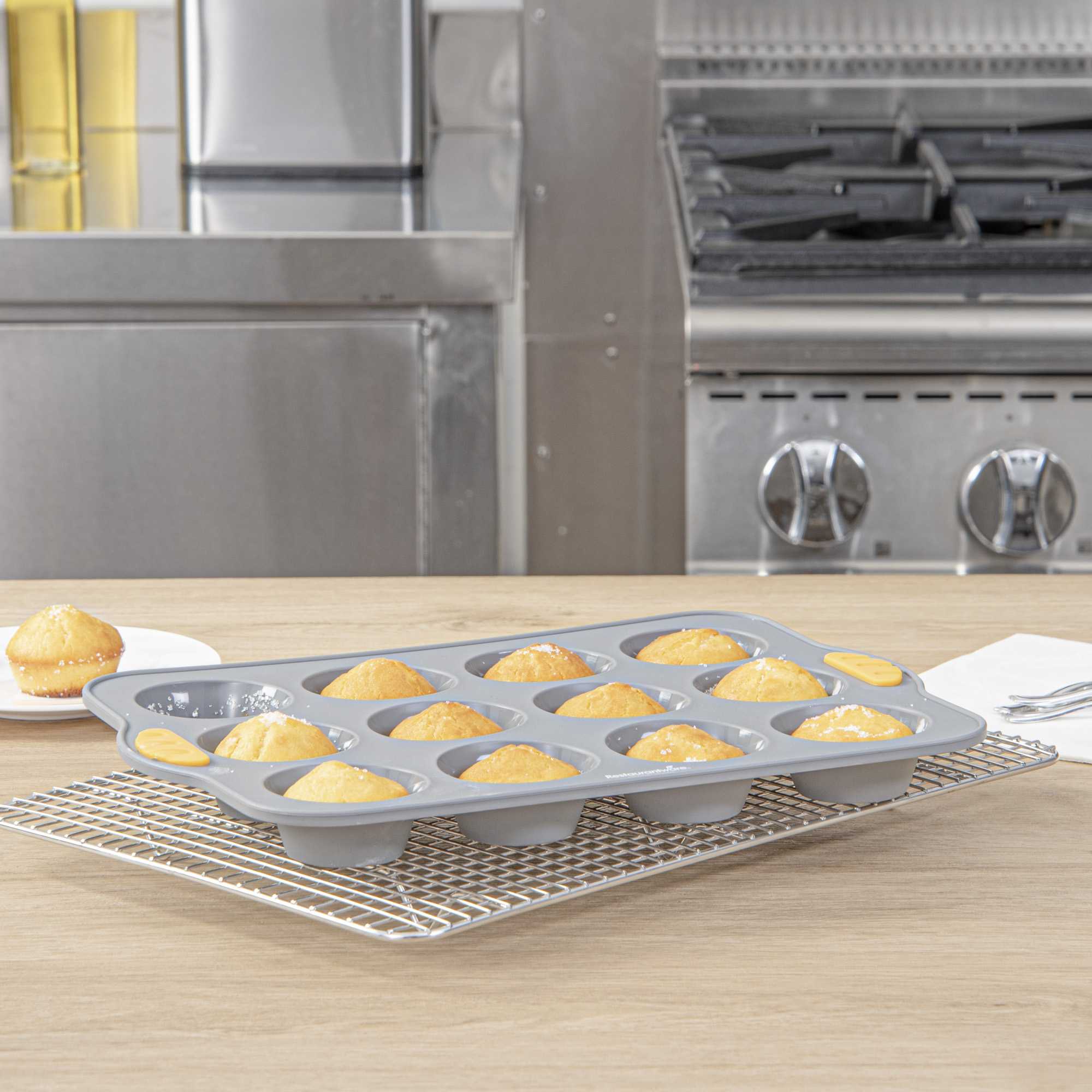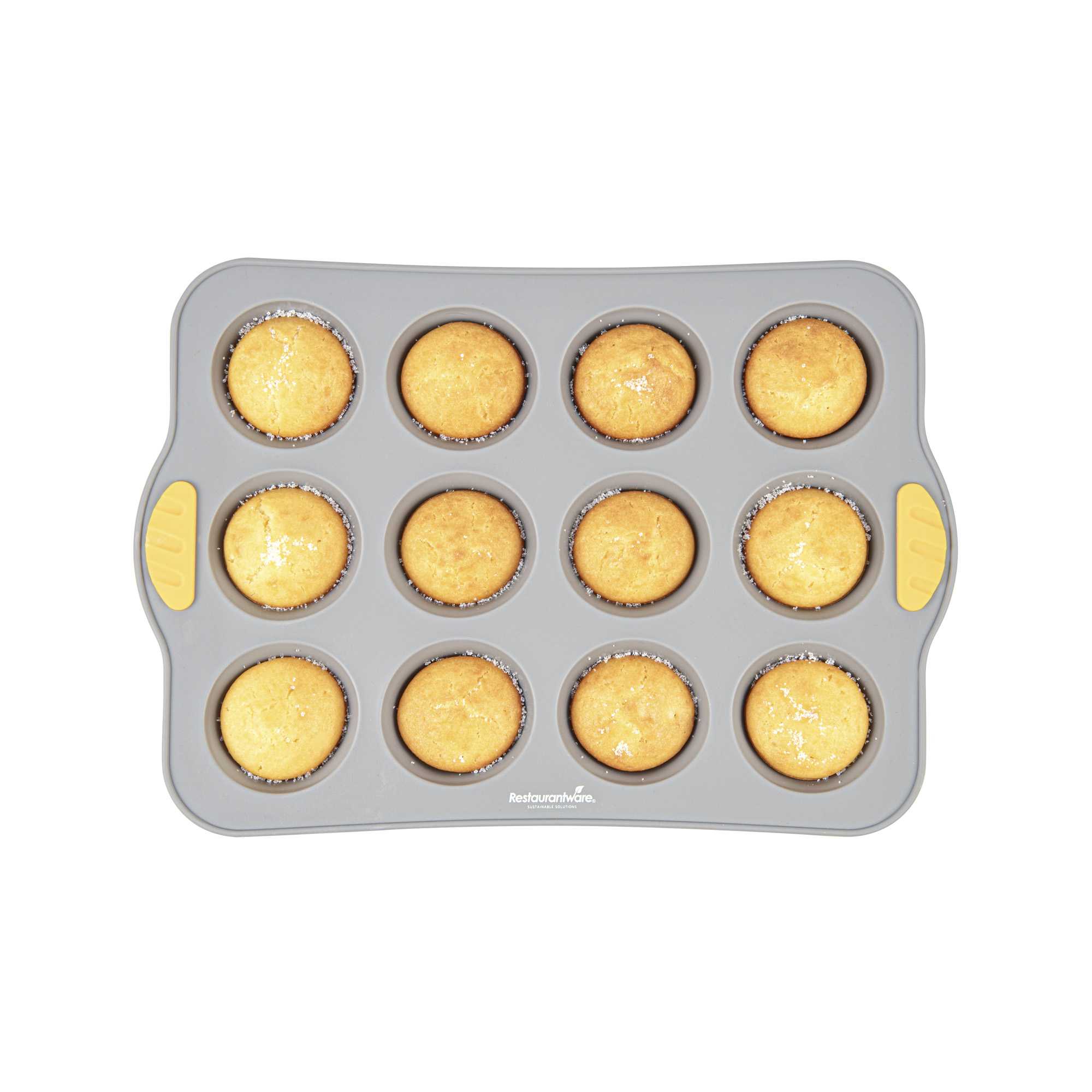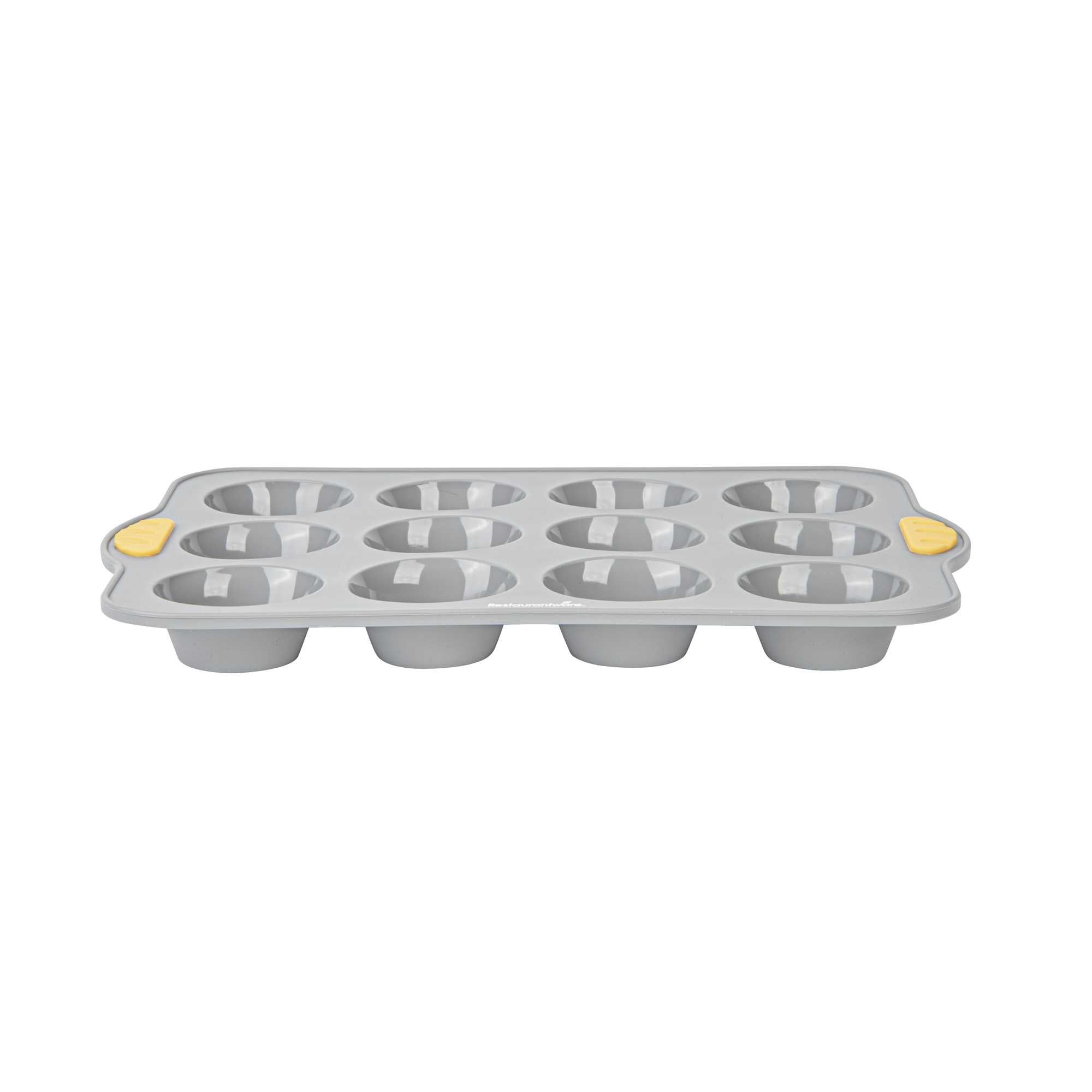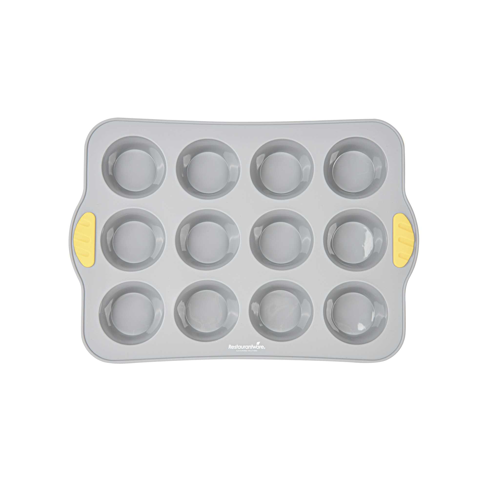 Simplify high-volume baking with our Pastry Tek Gray Silicone Muffin / Cupcake Pan. Featuring 12 compartments, this silicone cupcake mold is made with a non-stick interior that promotes smooth food release. Made to handle temperatures from -40F to 446F, its oven- and freezer-friendly construction supports both hot and cold food prep. Reinforced with integrated metal support, this muffin pan offers enhanced stability, making it easier to handle during busy kitchen operations. Crafted from food-grade, BPA-free silicone, it delivers reliable performance for commercial or home use. Outfitted with convenient side handles, this silicone muffin tray ensures steady transport. Complete with a greaseproof surface and finished in a professional gray tone, this 12-cavity mold is perfect for bakeries or cafés. Measuring 12.9 inches in length, 9.25 inches in width, and 1.18 inches in height, it produces consistent muffins or cupcakes in every batch. Sold in a 1 count box.