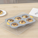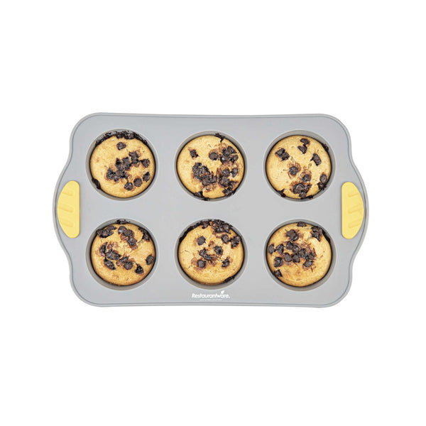 Streamline muffin and cupcake preparation with our Pastry Tek Gray Silicone Muffin / Cupcake Pans. Built with a non-stick interior, these silicone cupcake trays ensure effortless release while minimizing the need for added grease or liners. Designed to withstand temperatures from -40F to 446F, their oven- and freezer-friendly construction supports a wide range of hot or cold applications. Reinforced with metal support, these silicone molds provide added stability during transport and baking. Made from food-grade, BPA-free silicone, these muffin pans deliver consistent results. Equipped with side handles, these muffin trays offer improved grip for easy oven-to-counter transitions. With a sleek gray color and featuring a greaseproof surface, these 6-cavity silicone baking pans are a reliable choice for cafés or catering setups. Measuring 11.4 inches in length, 7 inches in width, and 1.3 inches in height, they produce evenly shaped muffins or cupcakes with ease. Sold in a 40 count box.