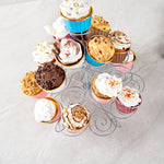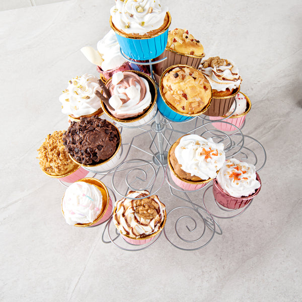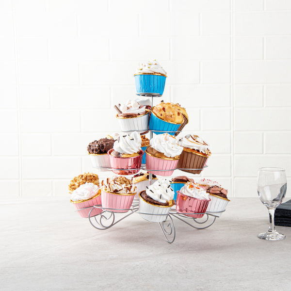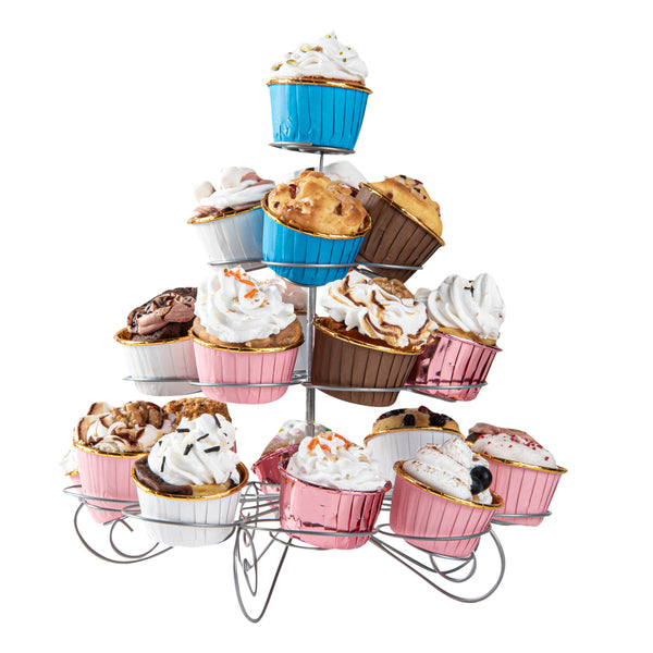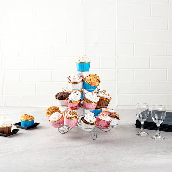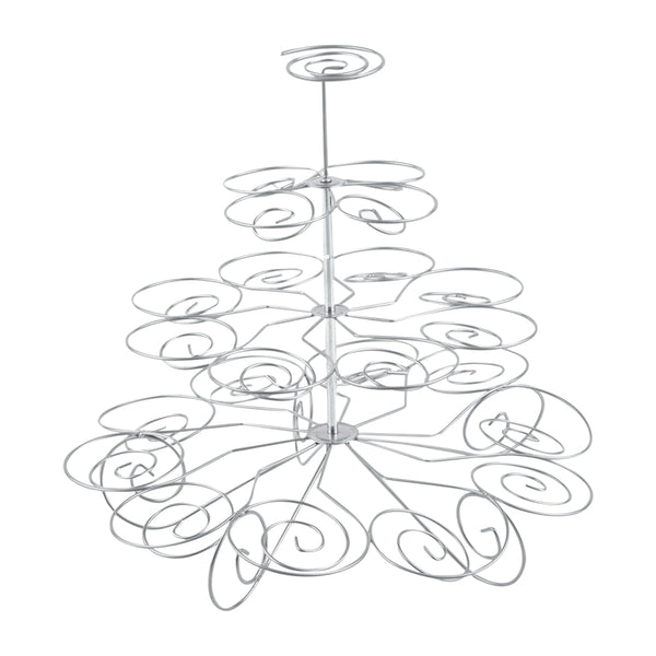 Display and serve cupcakes at parties, weddings, and baby showers with our Pastry Tek Iron Cupcake Stand. Made from premium quality iron, this muffin display stand is durable and won't bend with the weight. This 4-tier cupcake stand holds 23 cupcakes at a time, making it perfect for displaying cupcakes at your bakery. The powder-coated silver finish of this metal cupcake stand elevates its appeal while making it corrosion-resistant. Each swirled holder of this pastry rack has a diameter of 2.2 inches to accurately hold a standard or large cupcake while giving it a vintage look. The easy-to-assemble design of this cupcake tower stand makes it easy to set up. Measuring 12.5 inches in diameter by 11.5 inches in height, this cupcake tree stand is a perfect addition to your home or bakery. Shipped unassembled in a 1 count box.
