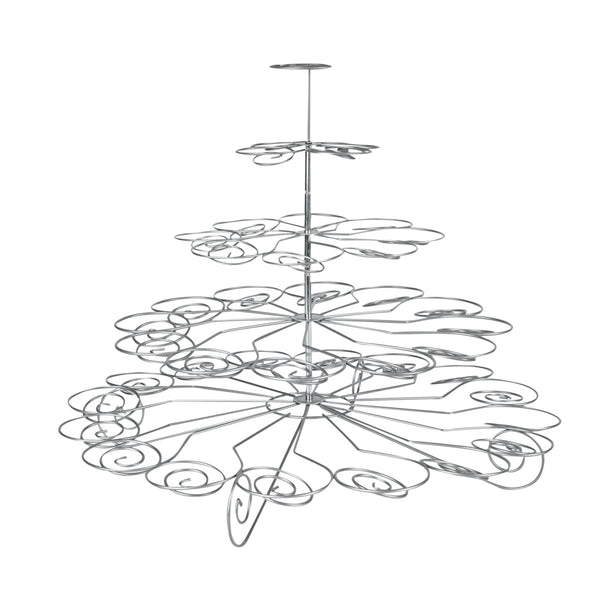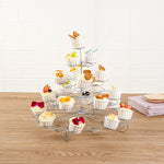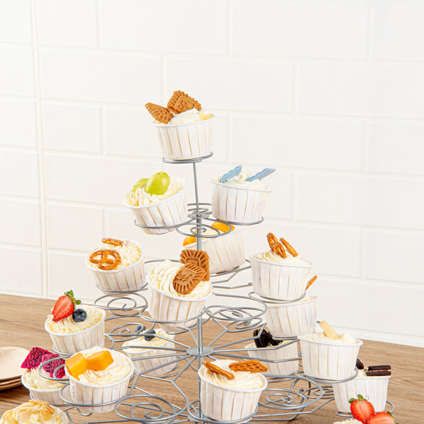 Showcase a large number of cupcakes in an organized and visually appealing manner with our Pastry Tek Iron Cupcake Stand. The premium iron construction of this muffin display stand makes it sturdy enough to not break when carrying a large number of muffins. This 4-tier cupcake stand holds 41 cupcakes at a time, making it perfect for displaying cupcakes at your bakery. With a powder-coated silver finish, this pastry rack is stylish and corrosion-resistant. Each swirled holder of this cupcake tower stand has a diameter of 2.2 inches to accurately hold a standard or large cupcake while giving it a vintage look. Easily set this metal cupcake stand up with its easy-to-assemble design. Measuring 17.75 inches in diameter by 14.25 inches in height, this cupcake tree stand is a perfect addition to your home or bakery. Shipped unassembled in a 1 count box.