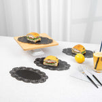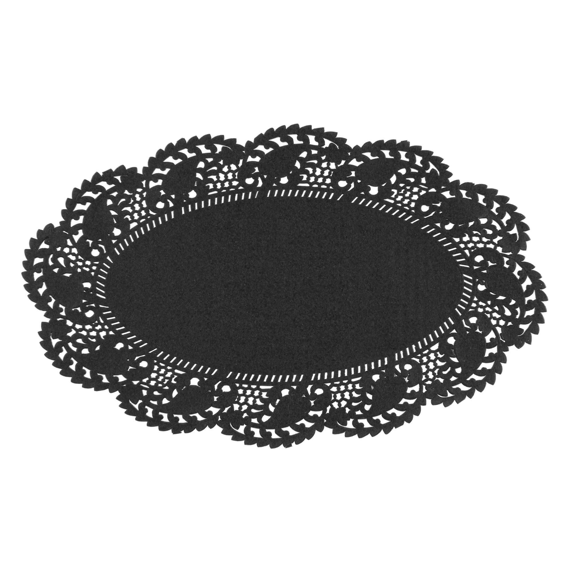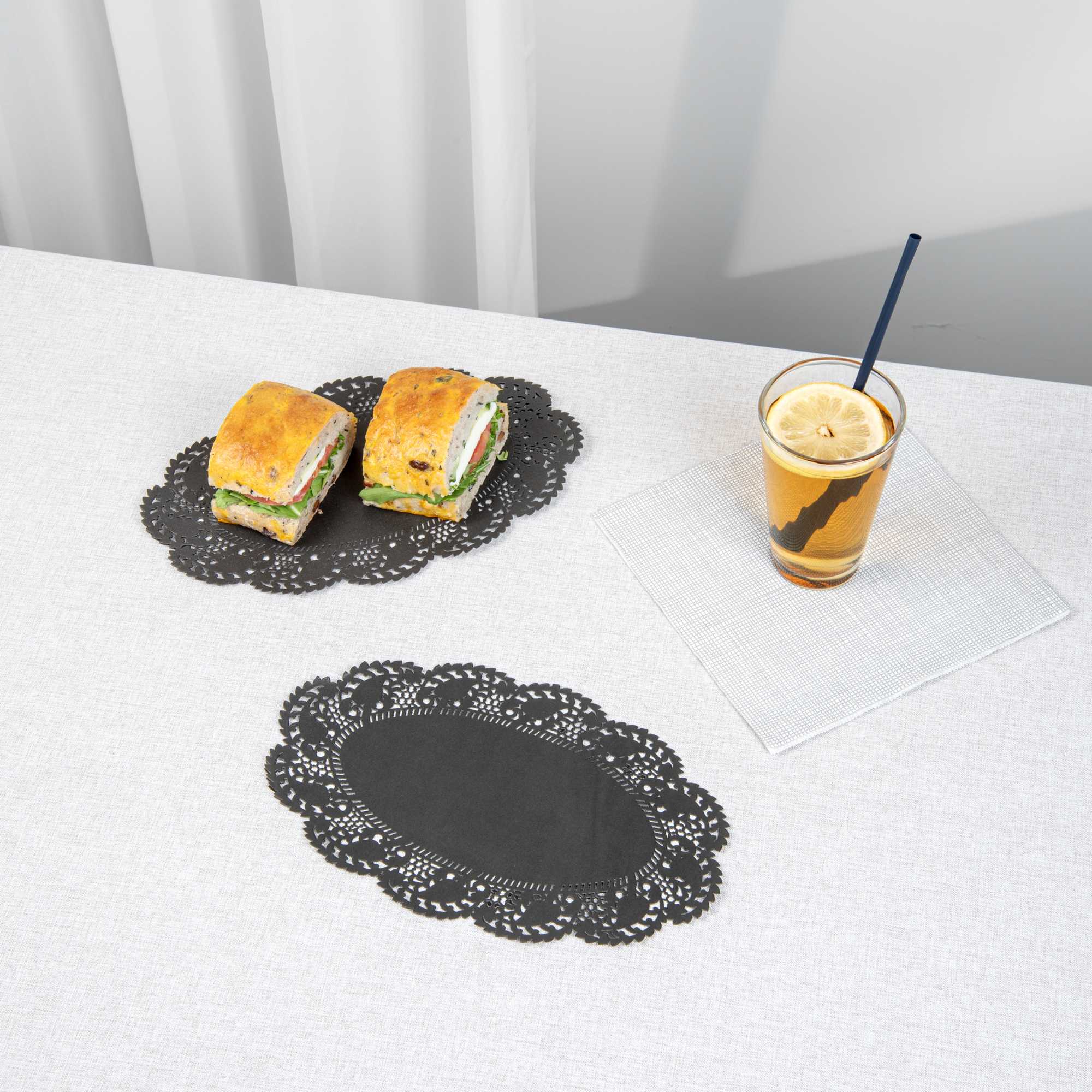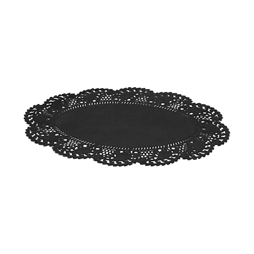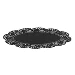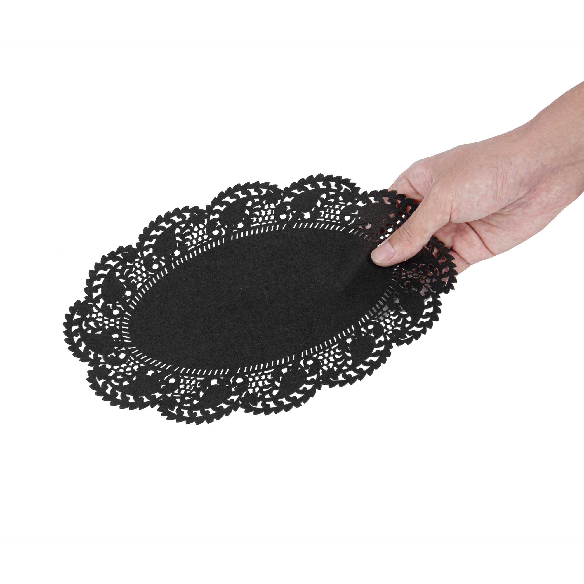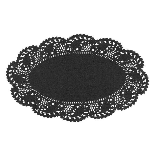 Elevate your dessert displays with our Pastry Tek Oval Black Paper Doilies. Crafted from high-quality paper, these table doilies provide durability while showcasing desserts at bakeries or catered luncheons without tearing or losing their structural integrity. Featuring intricate lace-like details, these lace doilies enhance the visual appeal of food presentations while serving as functional barriers, protecting surfaces, and absorbing moisture. The black colored paper doilies' finish is versatile, enabling them to complement a wide range of table settings and themes, making them ideal for various events and occasions. Perfect for busy restaurants and food establishments, these disposable paper doilies eradicate the hassle of post-event cleanup, offering a convenient and time-saving solution. Use these small doilies under cupcakes, petit fours, macarons, and other small treats to add an elegant touch. Measuring 10.5 inches in length by 6.5 inches in width, these oval doilies are the perfect size for a variety of applications. Sold in a 4,000 count box.