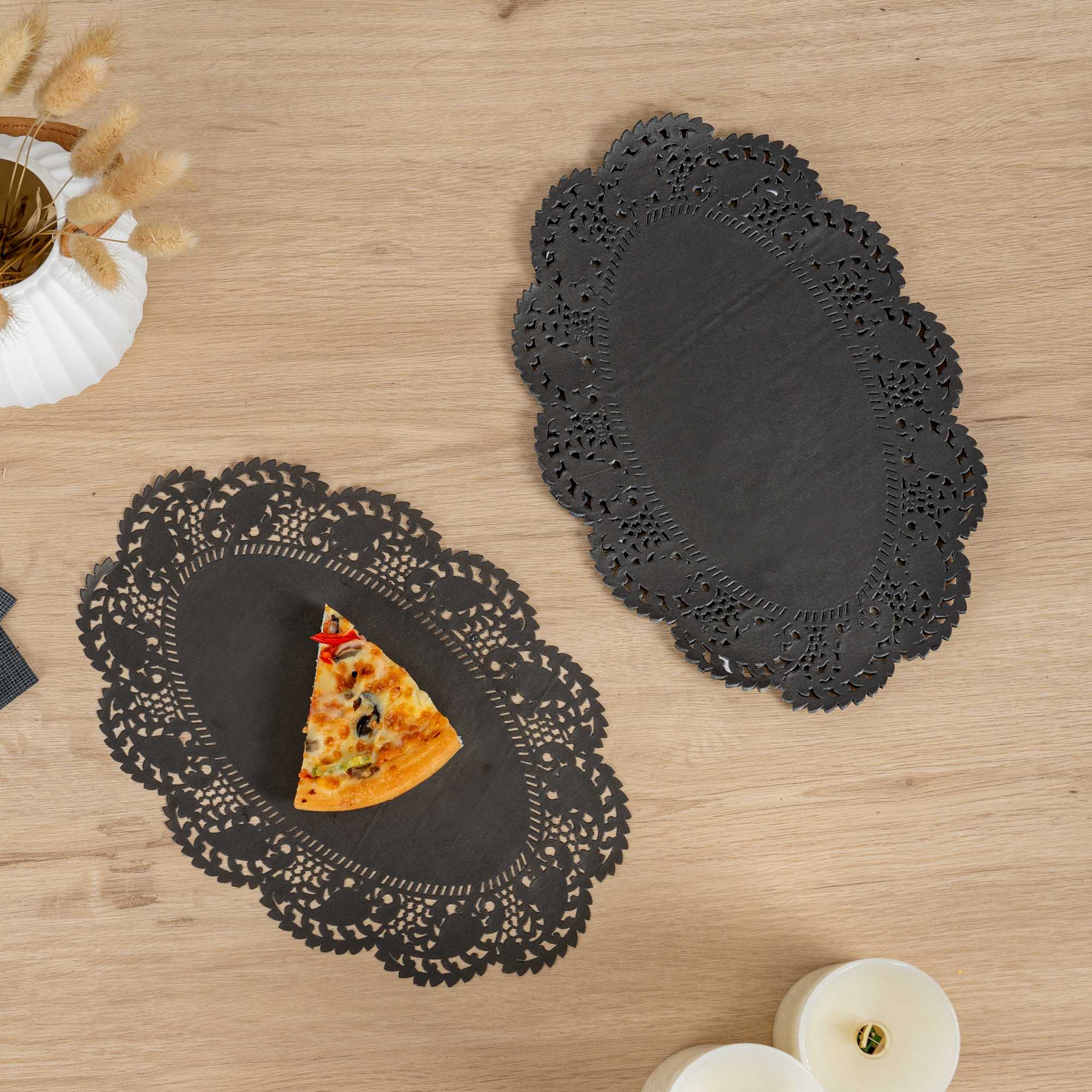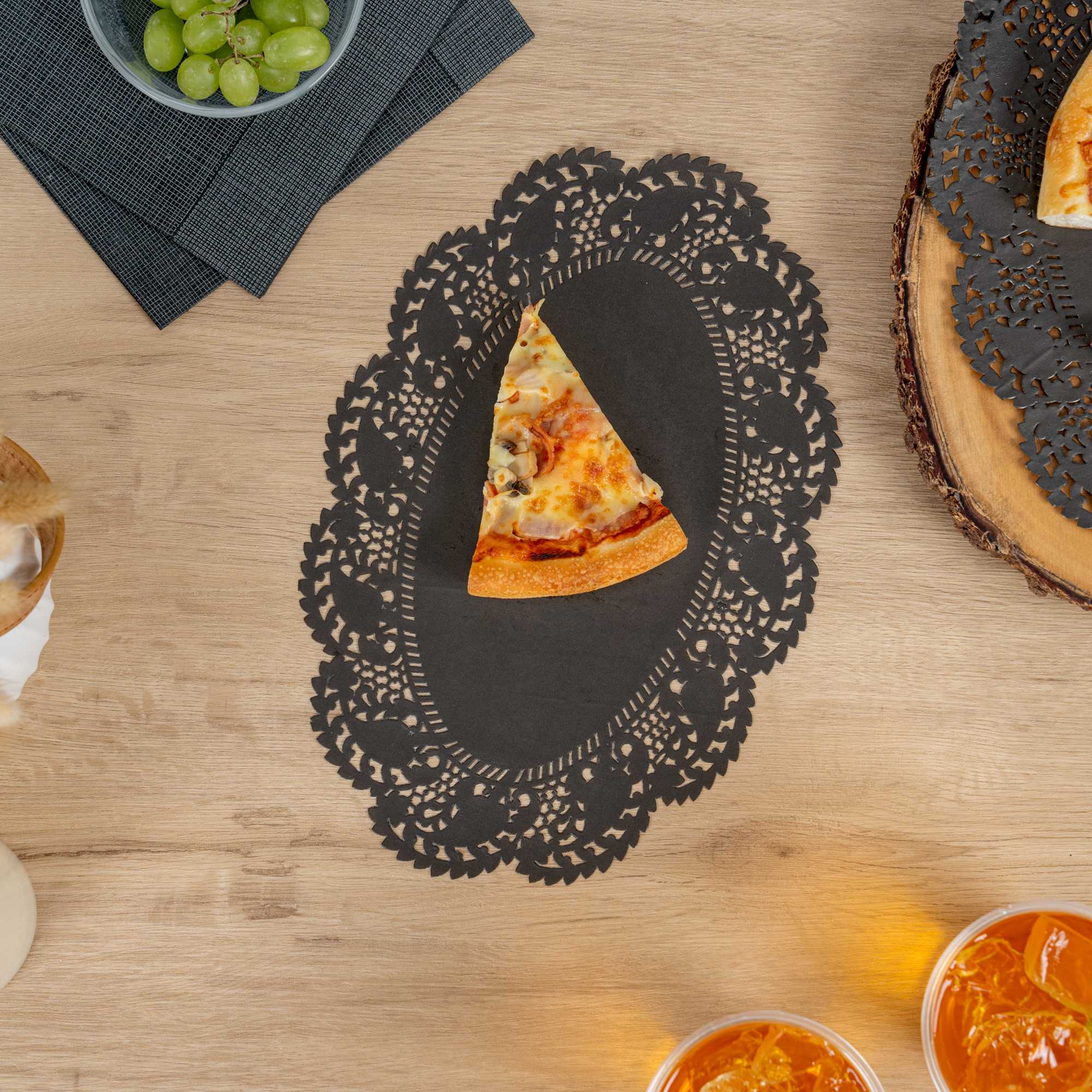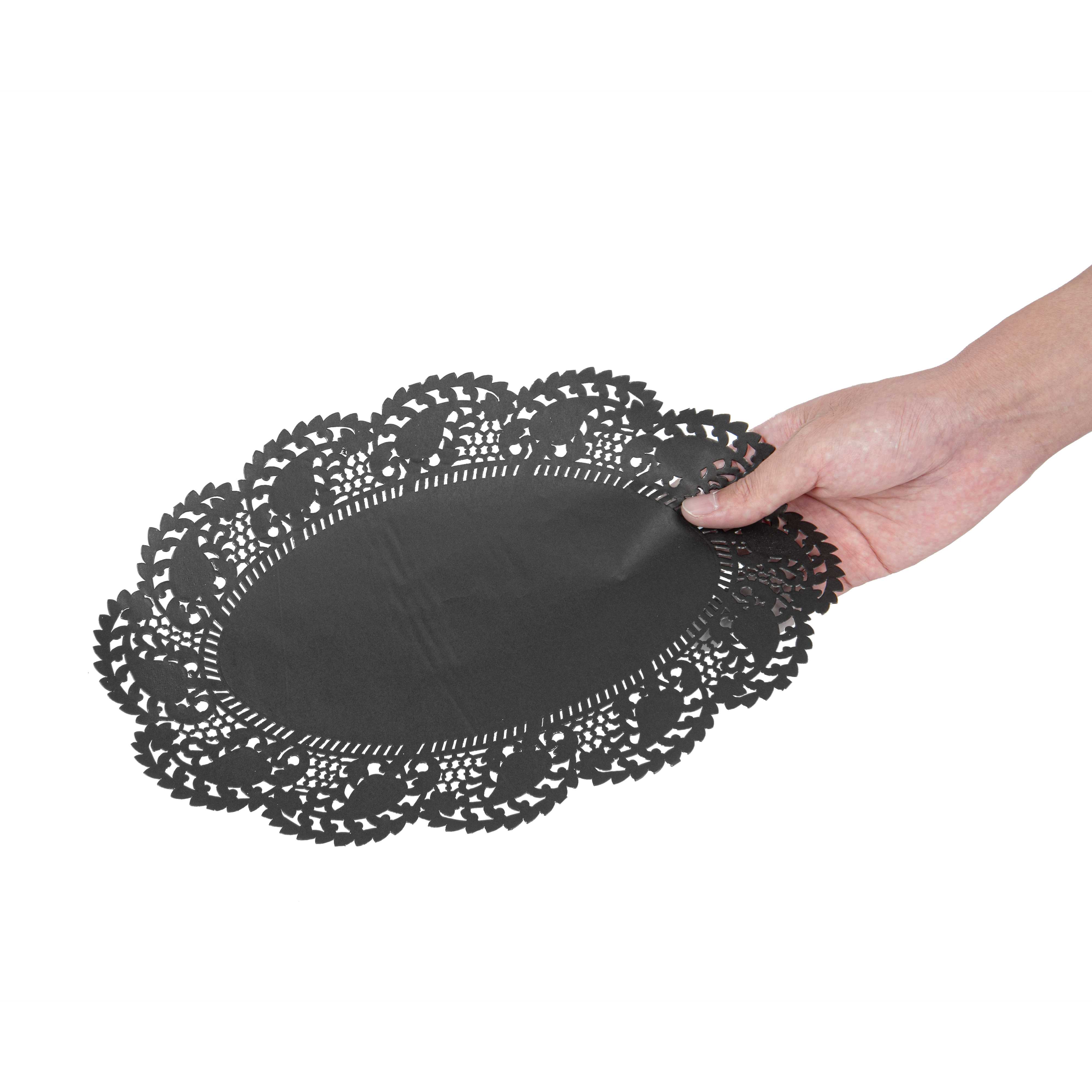 Elevate your dessert displays with our Pastry Tek Oval Black Paper Doilies. Crafted from high-quality paper, these lace doilies provide outstanding durability while beautifully presenting desserts at bakeries without tearing. Adding an elegant touch to your table doilies, the intricate lace-like details enhance the visual appeal of food presentations while serving as functional barriers that protect surfaces and absorb moisture. The black colored paper doilies seamlessly complement a wide range of table settings and themes, making them perfect for various events and occasions. These small doilies are disposable, eliminating the hassle of post-event cleanup and offering a convenient, time-saving solution for busy cafes and food establishments. Measuring 12.5 inches in length by 8.5 inches in width, these lace doilies are ideal for use under cupcakes, petit fours, macarons, and other small treats. Sold in a 4,000 count box.