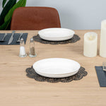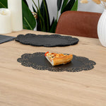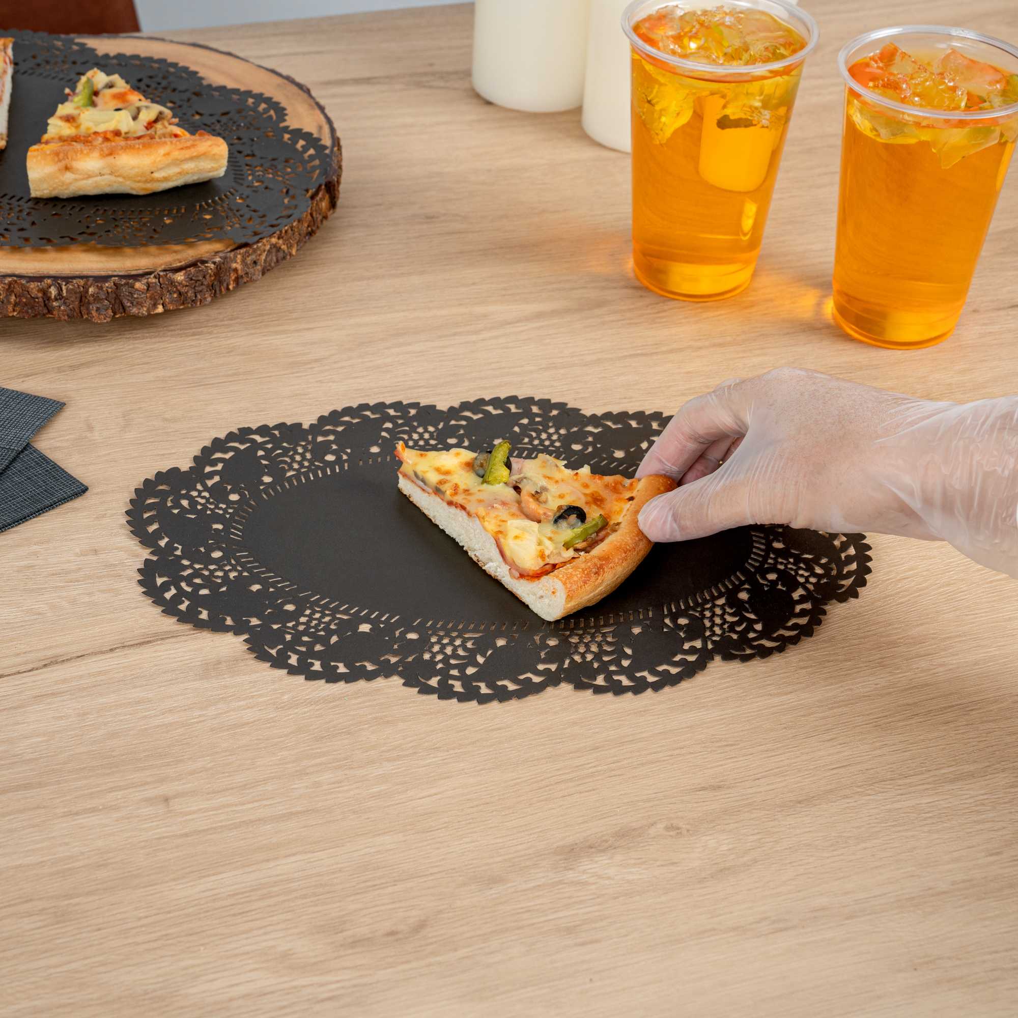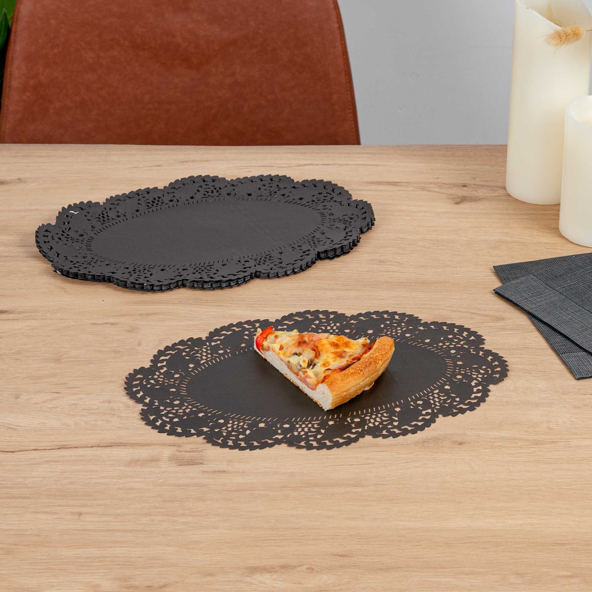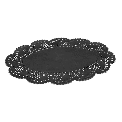 Elevate your dessert displays with our Pastry Tek Oval Black Paper Doilies. Crafted from high-quality paper, these lace doilies provide outstanding durability while beautifully presenting desserts at bakeries without tearing. Adding an elegant touch to your table doilies, the intricate lace-like details enhance the visual appeal of food presentations while serving as functional barriers that protect surfaces and absorb moisture. The black colored paper doilies seamlessly complement a wide range of table settings and themes, making them perfect for various events and occasions. These small doilies are disposable, eliminating the hassle of post-event cleanup and offering a convenient, time-saving solution for busy cafes and food establishments. Measuring 12.5 inches in length by 8.5 inches in width, these lace doilies are ideal for use under cupcakes, petit fours, macarons, and other small treats. Sold in a 4,000 count box.