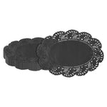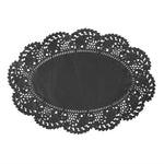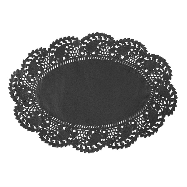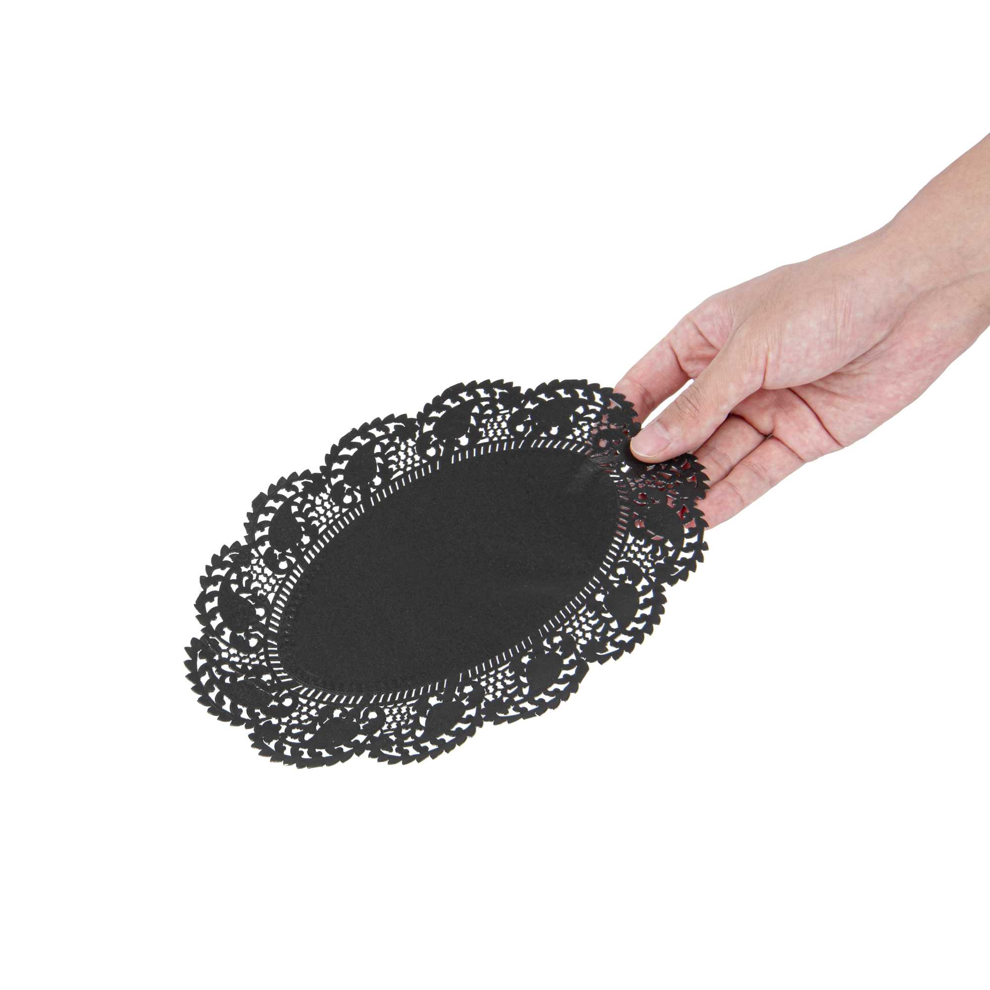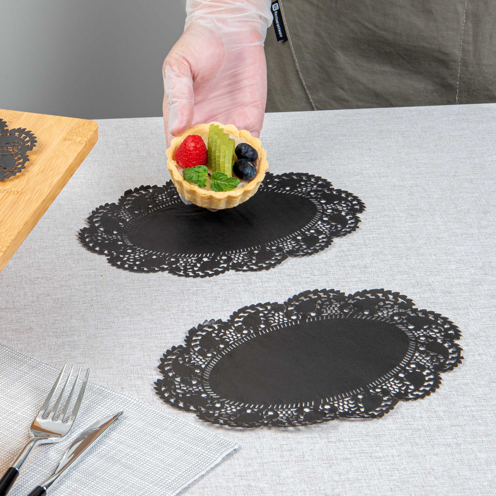Elevate your dessert displays with our Pastry Tek Oval Black Paper Doilies, designed to add an elegant touch to any presentation. Crafted from high-quality paper, these lace doilies offer exceptional durability, ensuring that desserts at bakeries or catered luncheons remain beautifully presented without tearing. Featuring intricate lace-like details, these table doilies not only increase the visual appeal of food presentations but also serve as functional barriers that protect surfaces and absorb moisture. The versatile black colored paper doilies seamlessly complement a wide range of table settings and themes, making them ideal for various events and occasions. Disposable by design, these small doilies eradicate the hassle of post-event cleanup, providing a convenient and time-saving solution for busy hosts and food establishments. Perfect for placing under cupcakes, petit fours, macarons, and other small treats, these lace doilies enhance both functionality and aesthetics. Measuring 9 inches in length by 6.5 inches in width, these oval doilies are the perfect size for a variety of desserts. Sold in a 100 count box.