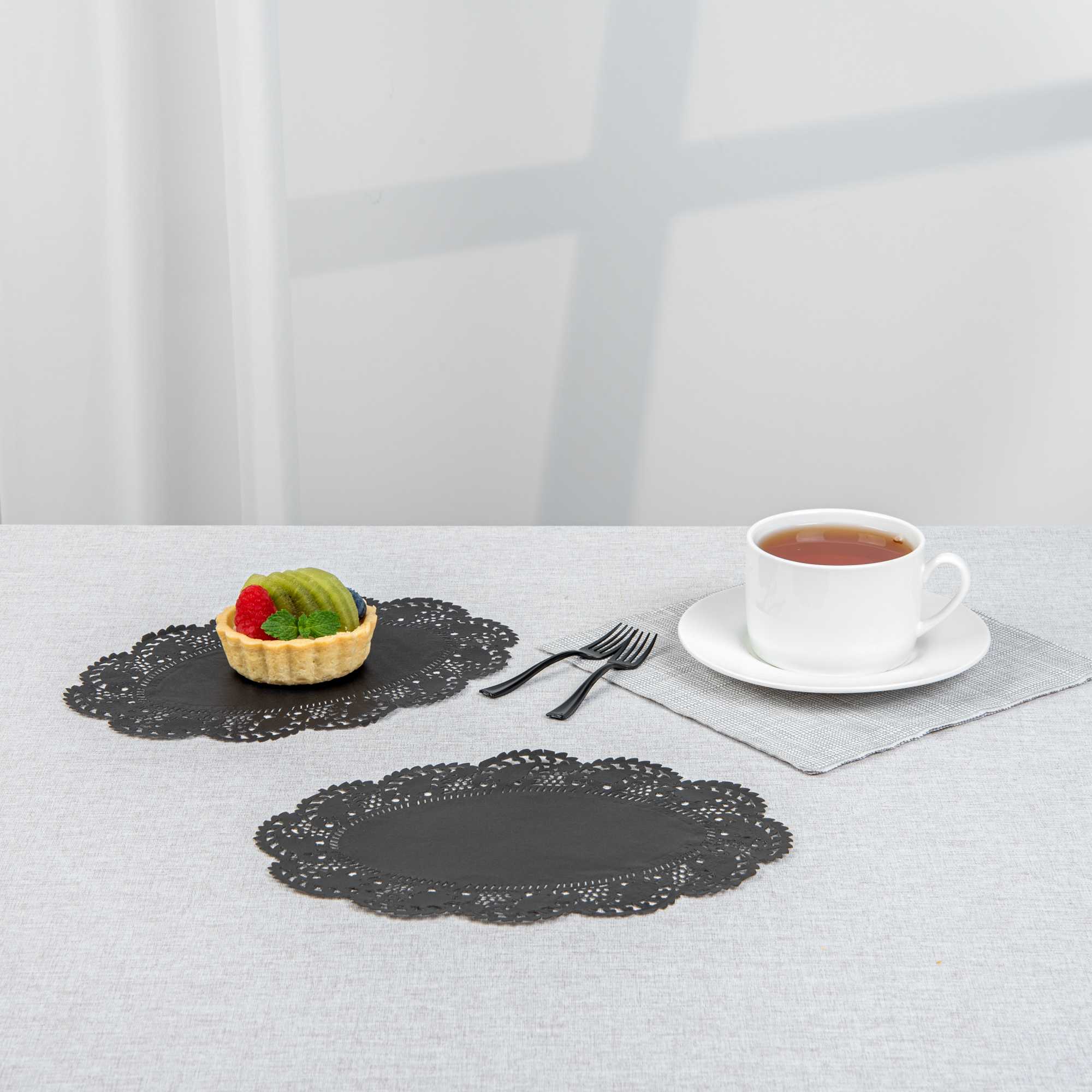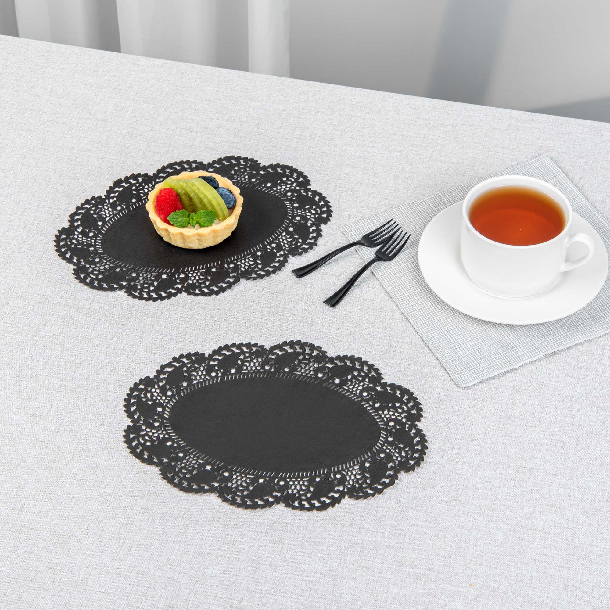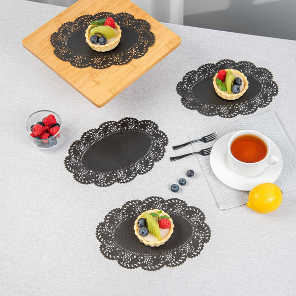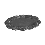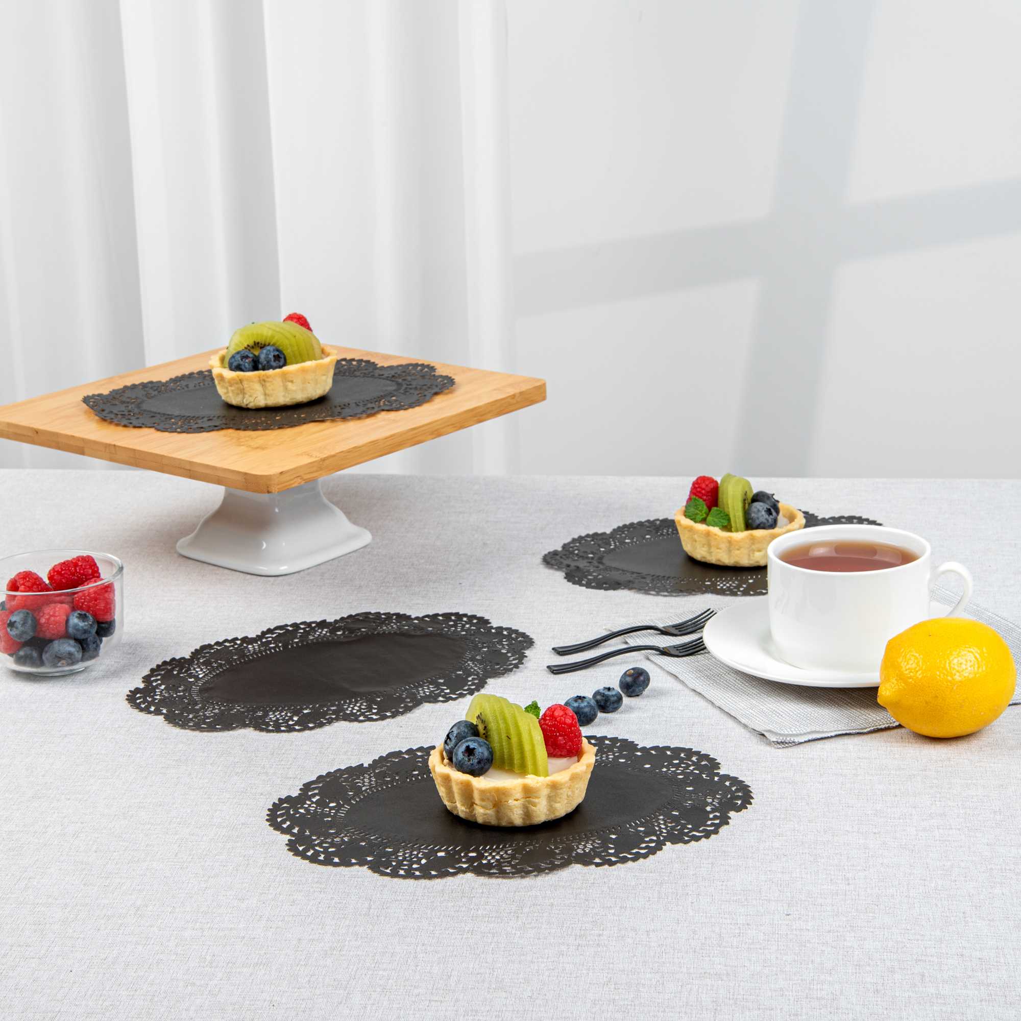 Elevate your dessert displays with our Pastry Tek Oval Black Paper Doilies, designed to add an elegant touch to any presentation. Crafted from high-quality paper, these lace doilies offer exceptional durability, ensuring that desserts at bakeries or catered luncheons remain beautifully presented without tearing. Featuring intricate lace-like details, these table doilies not only increase the visual appeal of food presentations but also serve as functional barriers that protect surfaces and absorb moisture. The versatile black colored paper doilies seamlessly complement a wide range of table settings and themes, making them ideal for various events and occasions. Disposable by design, these small doilies eradicate the hassle of post-event cleanup, providing a convenient and time-saving solution for busy hosts and food establishments. Perfect for placing under cupcakes, petit fours, macarons, and other small treats, these lace doilies enhance both functionality and aesthetics. Measuring 9 inches in length by 6.5 inches in width, these oval doilies are the perfect size for a variety of desserts. Sold in a 100 count box.