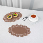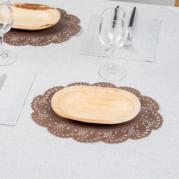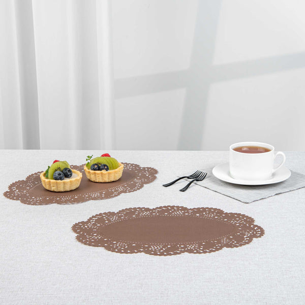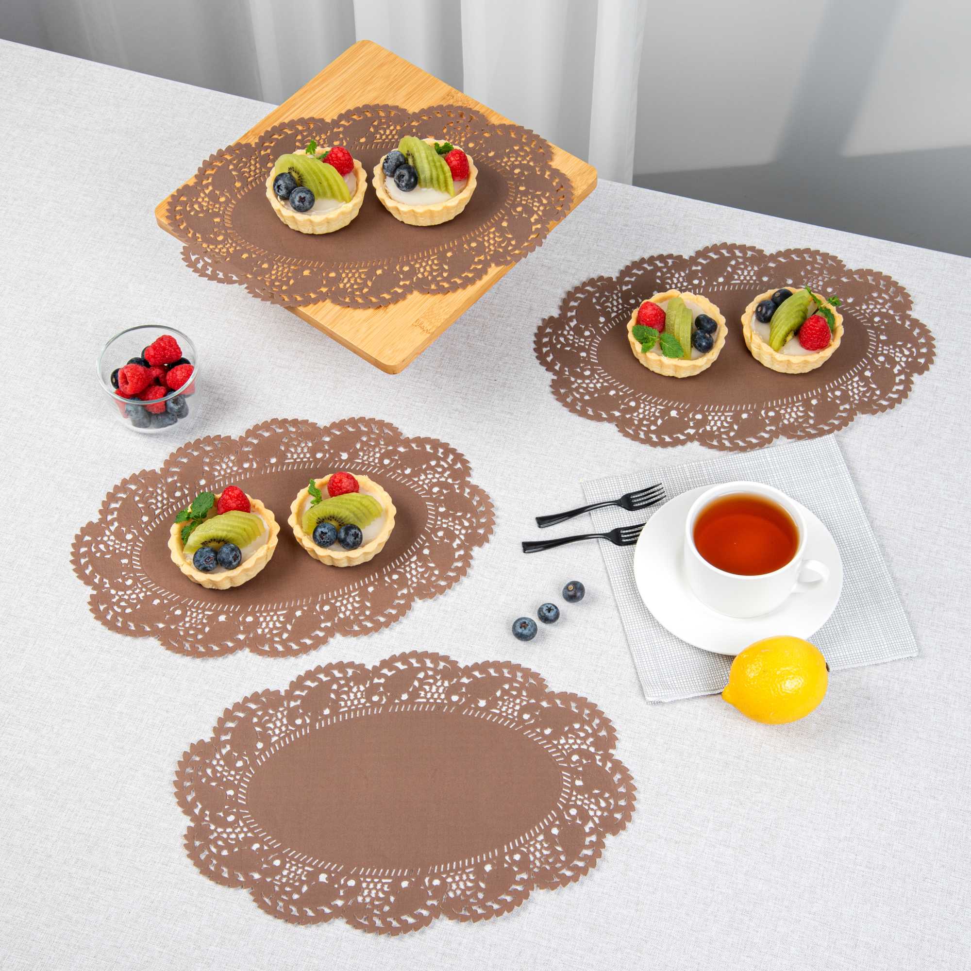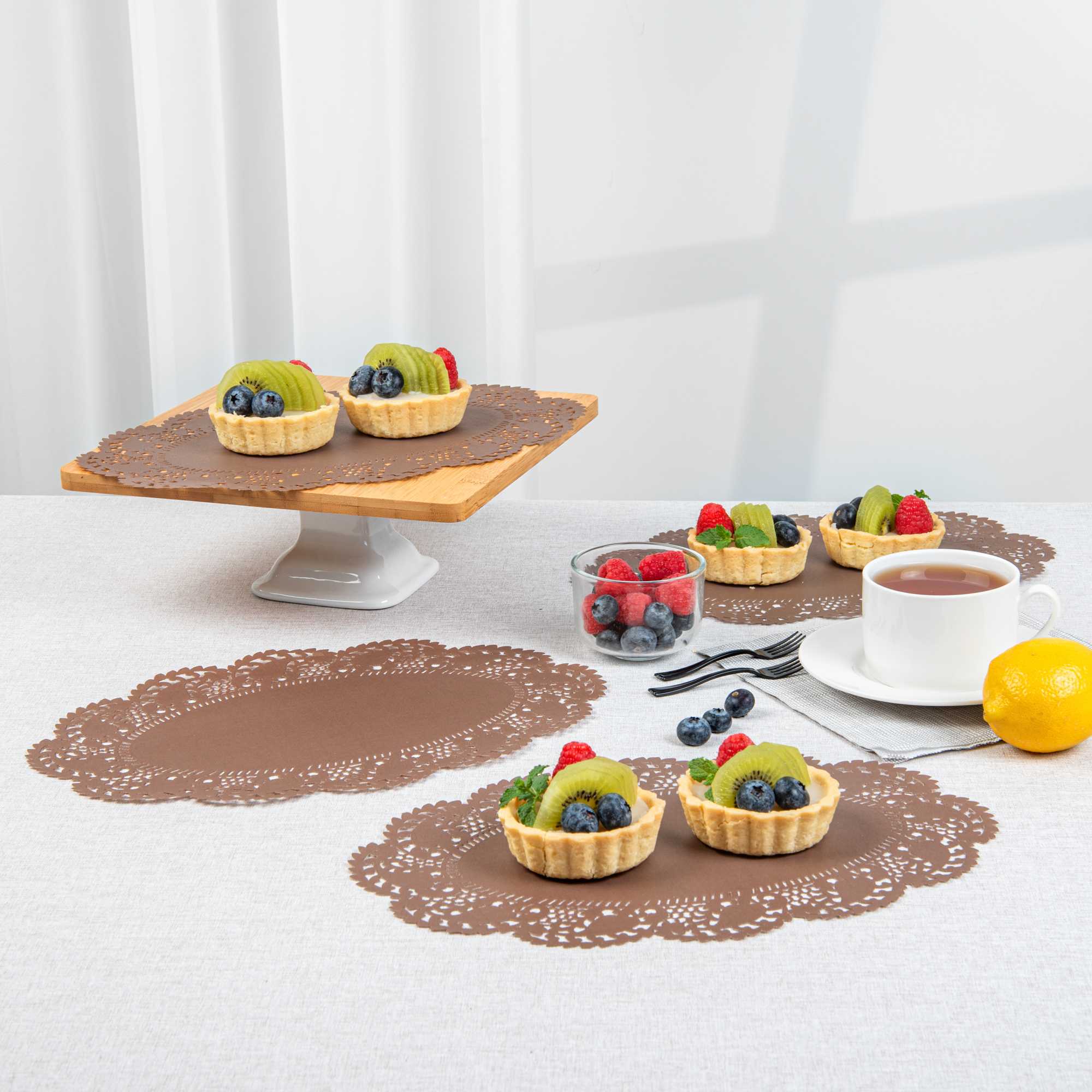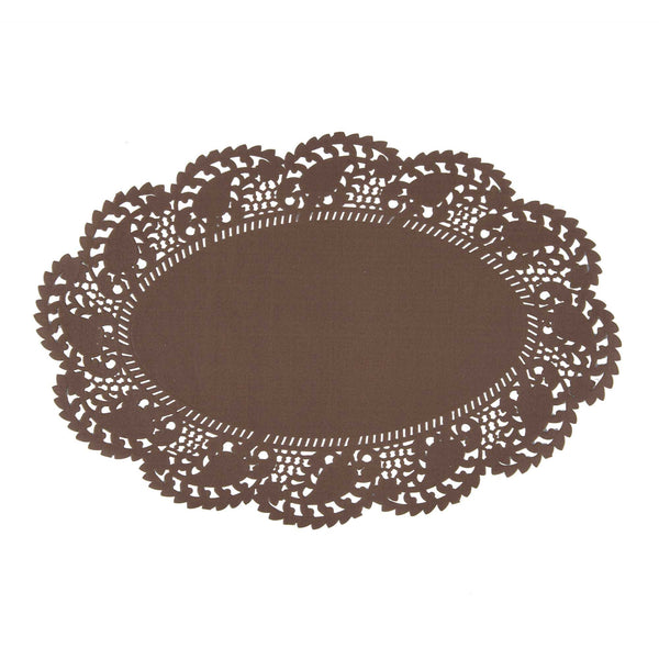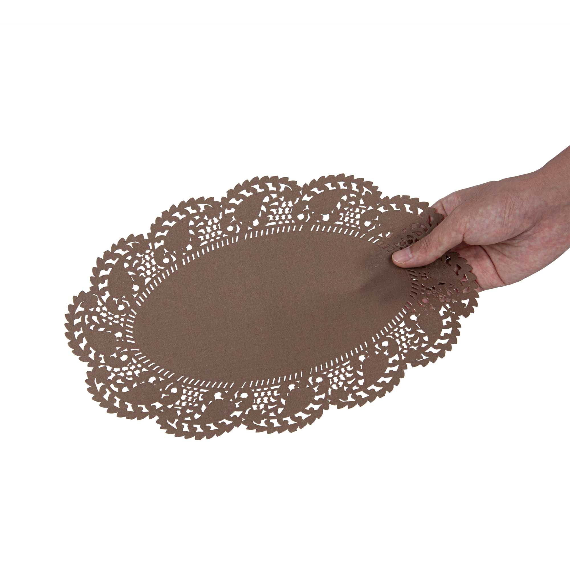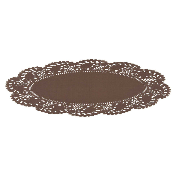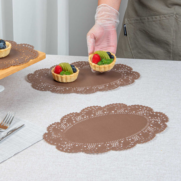 Elevate your dessert displays with our Pastry Tek Oval Brown Paper Doilies, perfect for adding an elegant touch to any presentation. Crafted from high-quality paper, these lace doilies provide durability while showcasing desserts at bakeries or catered luncheons without tearing or losing their structural integrity. Featuring intricate lace-like details, these table doilies enhance the visual appeal of your food presentations while serving as functional barriers that protect surfaces and absorb moisture. The brown colored finish of these small doilies is versatile, allowing them to complement a wide range of table settings and themes, making them an ideal choice for various events and occasions. Conveniently disposable, these colored paper doilies eradicate the hassle of post-event cleanup, offering a time-saving solution for busy cafes and food establishments. Use these paper doilies under cupcakes, petit fours, macarons, and other small treats to elevate your offerings. Measuring 12.5 inches in length by 8.5 inches in width, these lace doilies are perfectly sized for a variety of uses. Sold in a 100 count box.