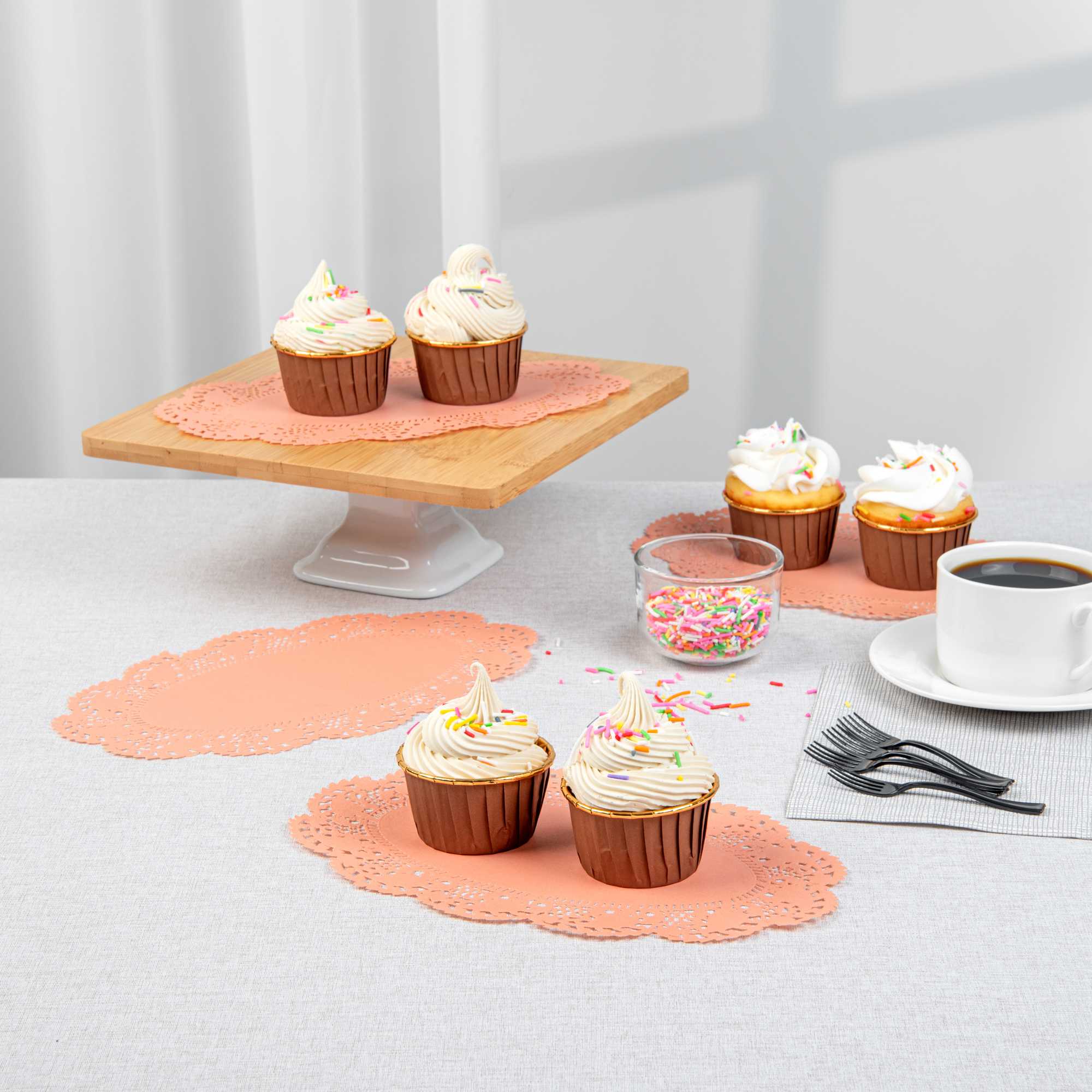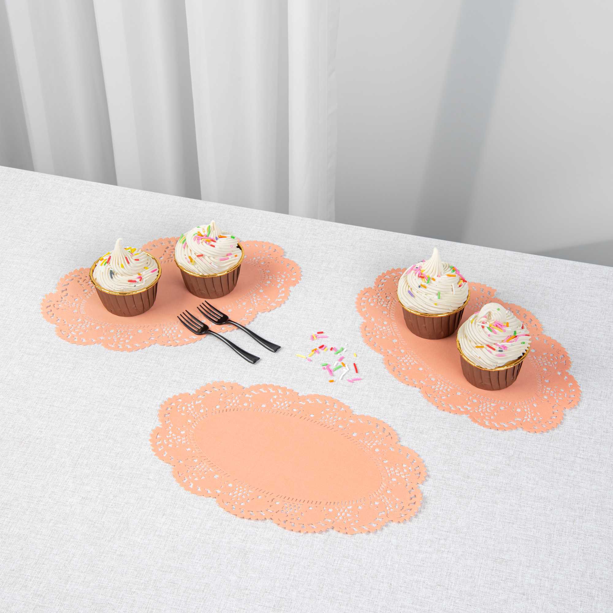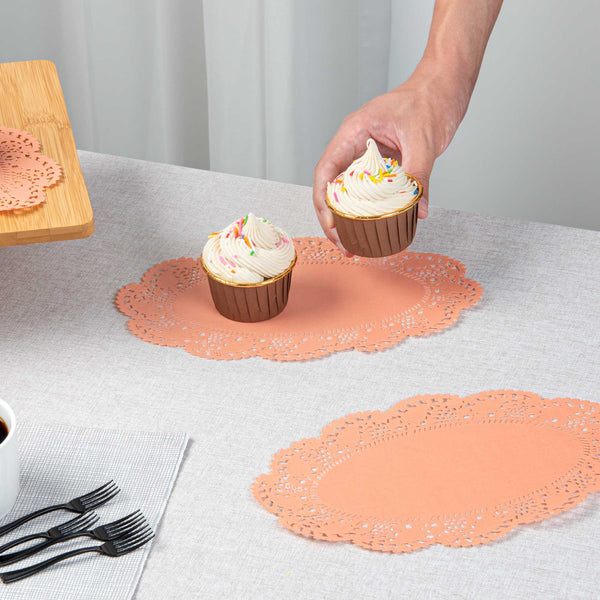 Enhance your dessert presentations with our Pastry Tek Oval Coral Paper Doilies, designed to add an elegant touch to any display. Crafted from high-quality paper, these lace doilies provide durability while showcasing desserts at bakeries without tearing or losing structural integrity. The intricate lace-like details of these table doilies increase the visual appeal of food presentations while serving as functional barriers, protecting surfaces, and absorbing moisture. Featuring a versatile colored finish, these coral colored paper doilies effortlessly complement a wide range of table settings and themes, making them perfect for various events and occasions. These disposable small doilies eradicate the hassle of post-event cleanup, offering a convenient and time-saving solution for busy cafes and food establishments. Ideal for use under cupcakes, petit fours, macarons, and other small treats, these paper doilies measure 10.5 inches in length by 6.5 inches in width. Sold in a 100 count box.
