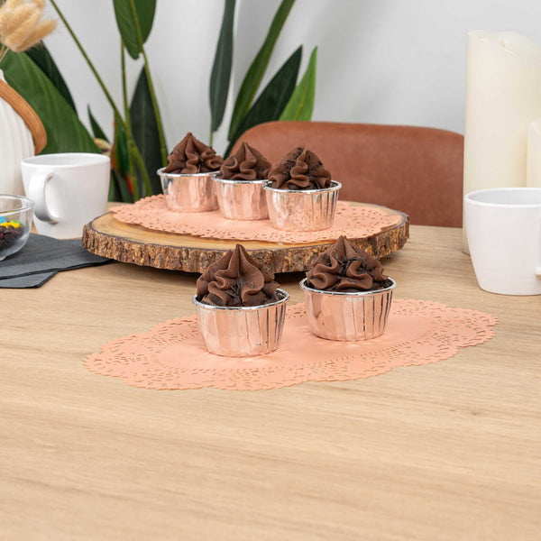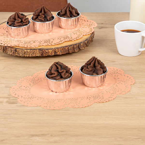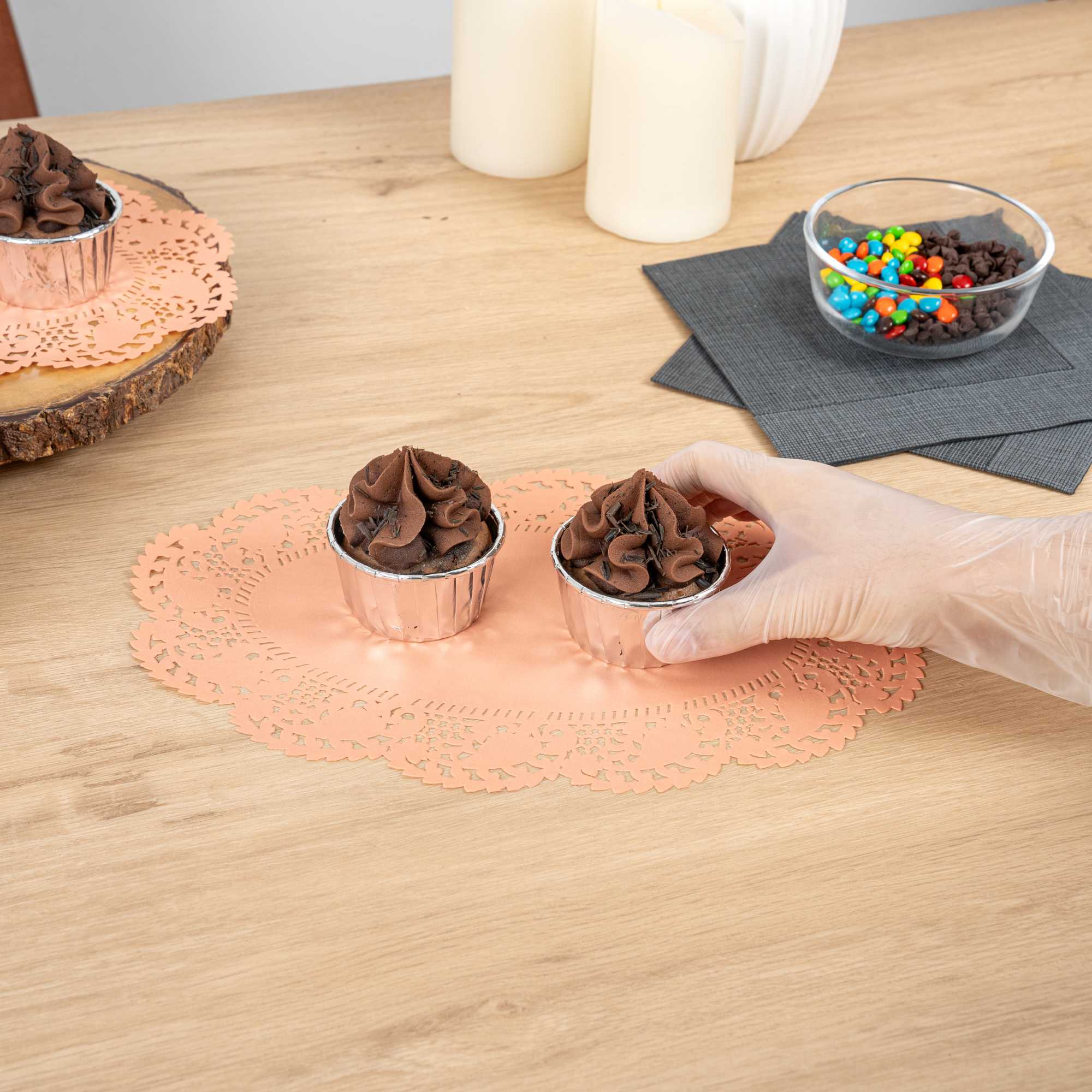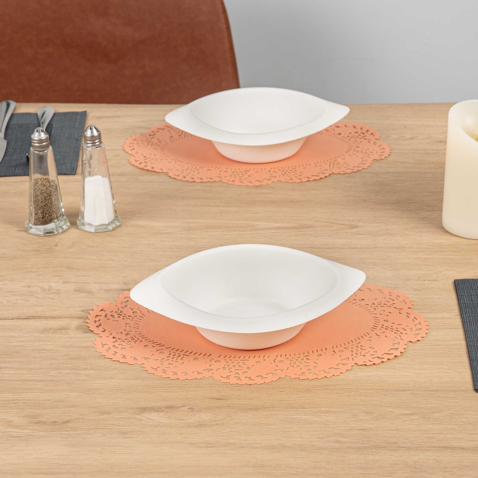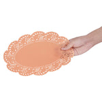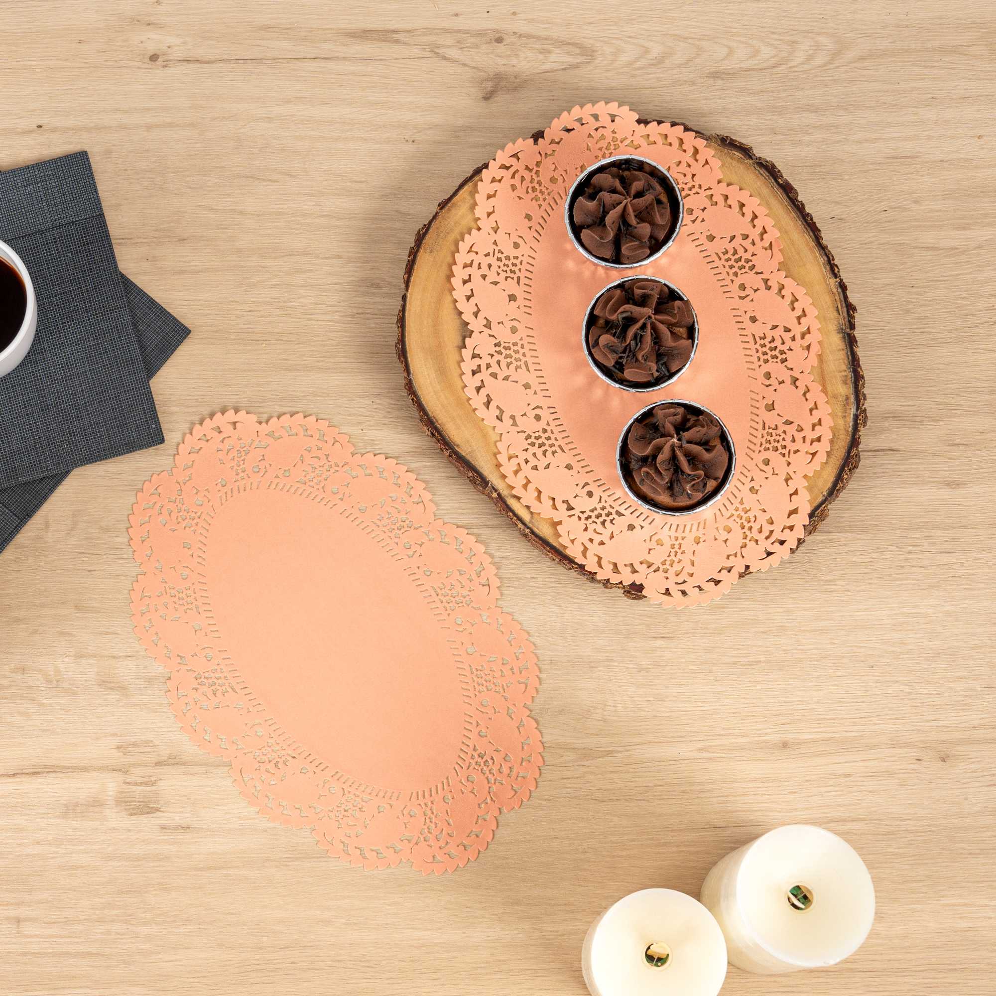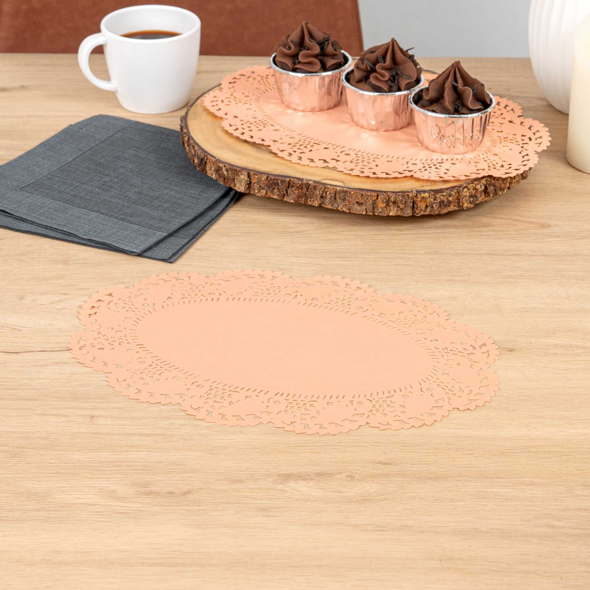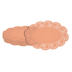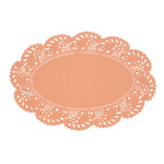 Elevate your dessert presentations with our Pastry Tek Oval Coral Paper Doilies, designed to add an elegant touch to any display. Crafted from high-quality paper, these table doilies ensure durability while showcasing desserts at bakeries or catered luncheons without tearing or losing their structural integrity. Featuring intricate lace-like details, these lace doilies enhance the visual appeal of food presentations while serving as functional barriers that protect surfaces and absorb moisture. The coral colored paper doilies effortlessly complement a wide range of table settings and themes, making them perfect for various events and occasions. These disposable small doilies eradicate the hassle of post-event cleanup, offering a convenient and time-saving solution for busy cafes and food establishments. Ideal for use under cupcakes, petit fours, macarons, and other small treats, these paper doilies measure 12.5 inches in length by 8.5 inches in width. Sold in a 4,000 count box.