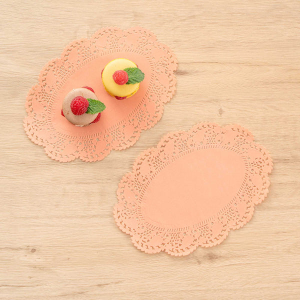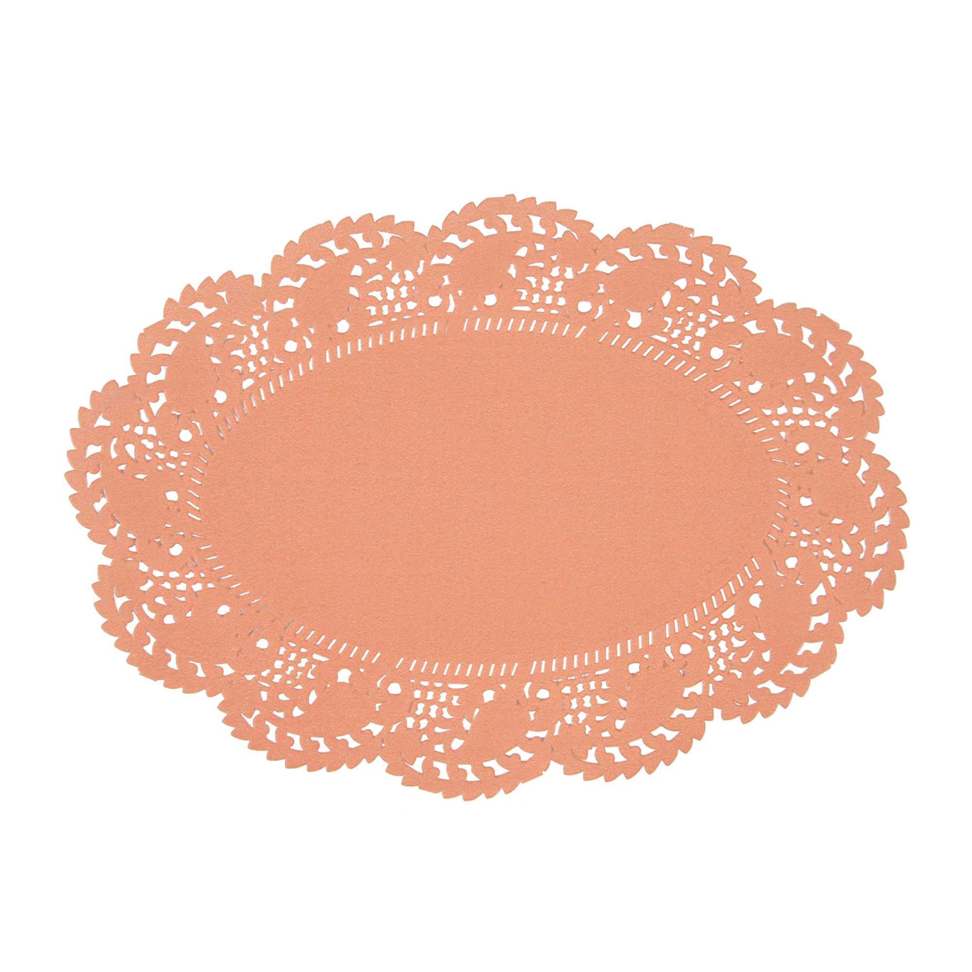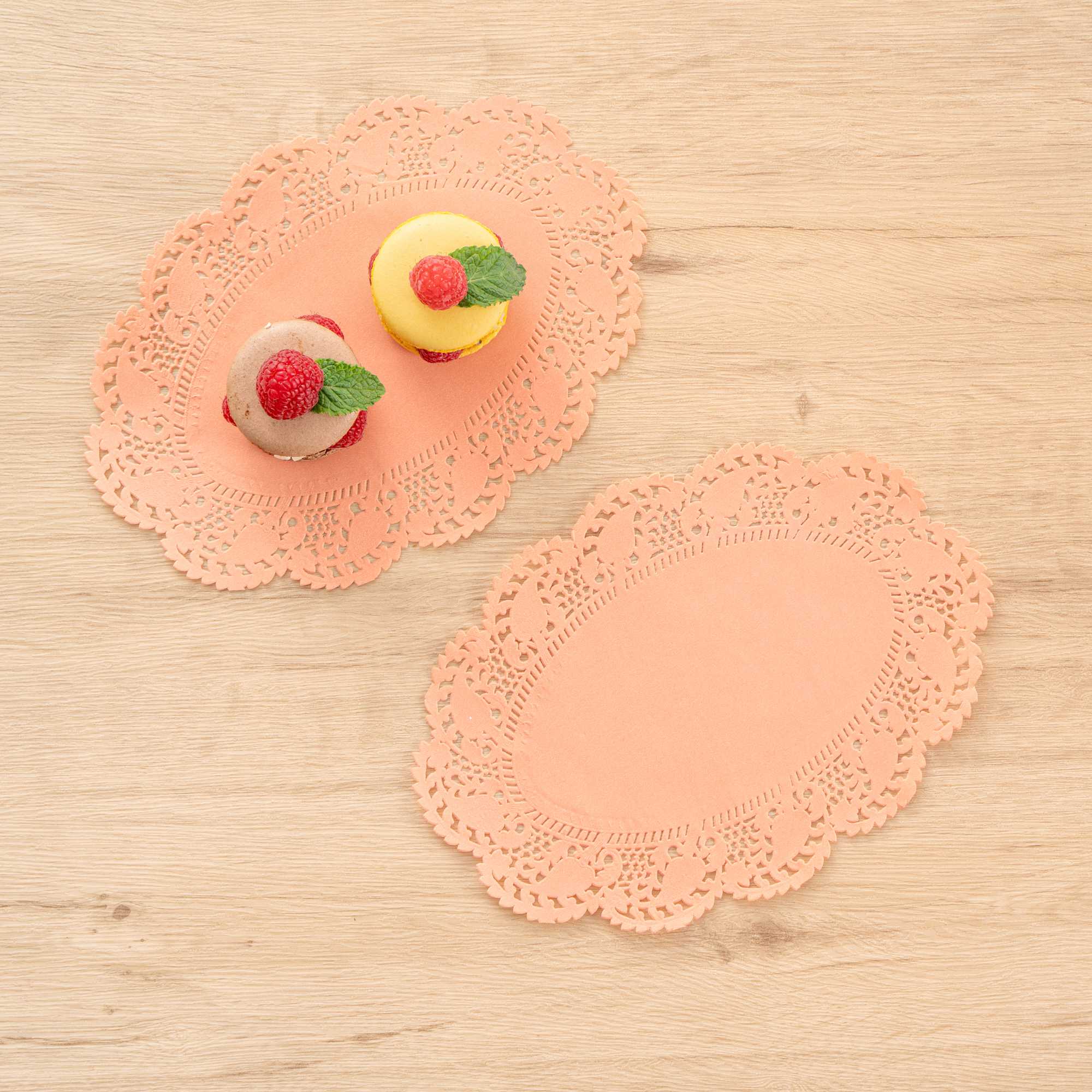 Enhance your dessert displays with our Pastry Tek Oval Coral Paper Doilies, adding an elegant touch to every presentation. Crafted from high-quality paper, these lace doilies provide the durability needed for showcasing desserts at bakeries or catered luncheons without tearing or losing their structural integrity. Featuring intricate lace-like details, these table doilies not only increase the visual appeal of food presentations but also serve as functional barriers, protecting surfaces and absorbing moisture. The coral colored finish of these small doilies allows them to complement a wide range of table settings and themes, making them the perfect choice for various events and occasions. Designed for convenience, these disposable paper doilies eradicate the hassle of post-event cleanup, offering a time-saving solution for busy hosts and food establishments. Ideal for use under cupcakes, petit fours, macarons, and other small treats, these lace doilies measure 9 inches in length by 6.5 inches in width. Sold in a 4,000 count box.