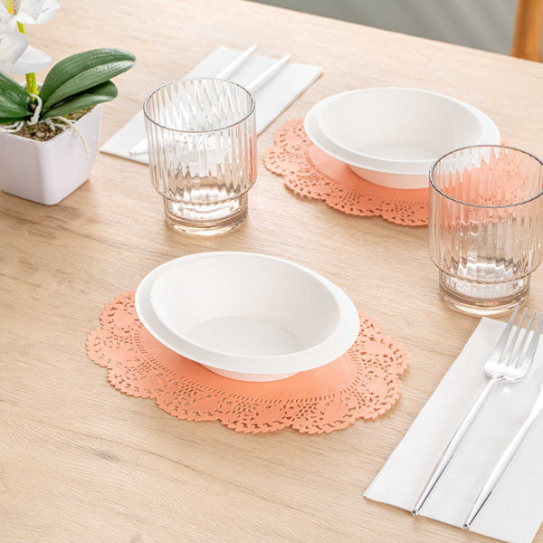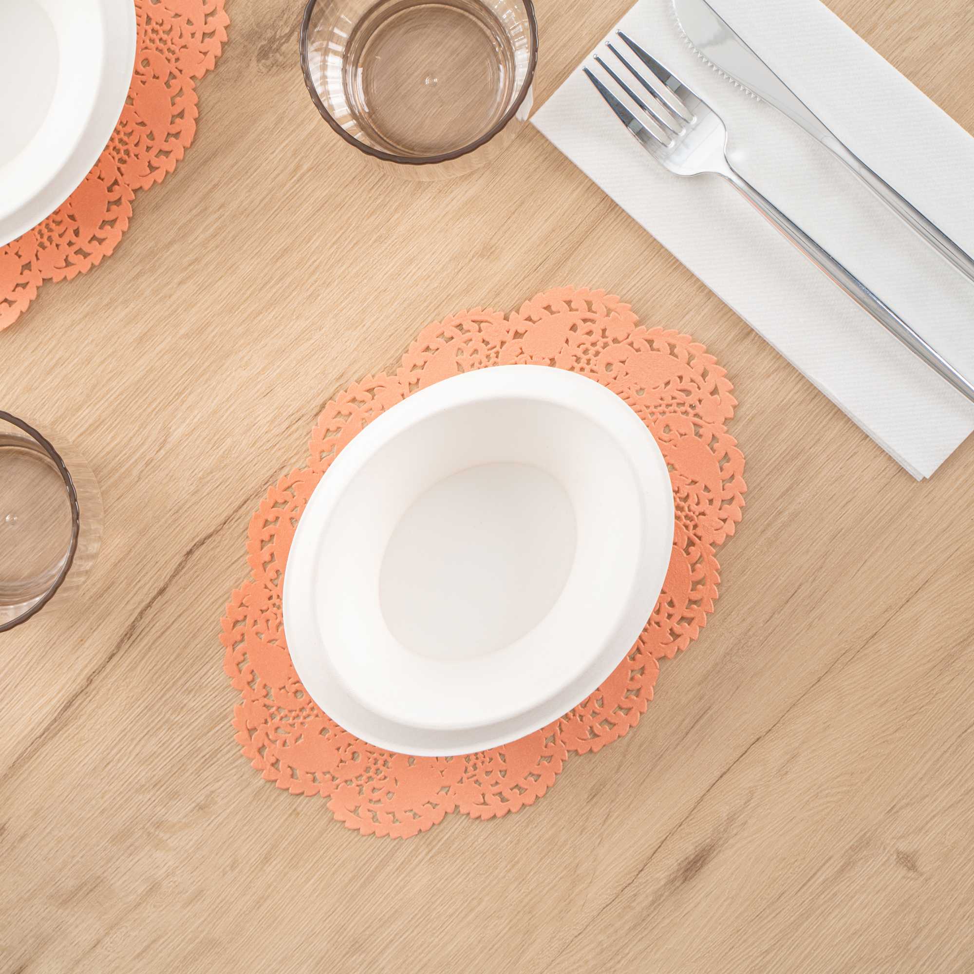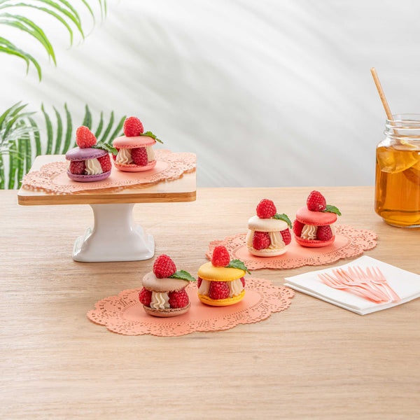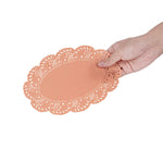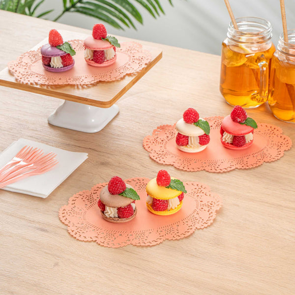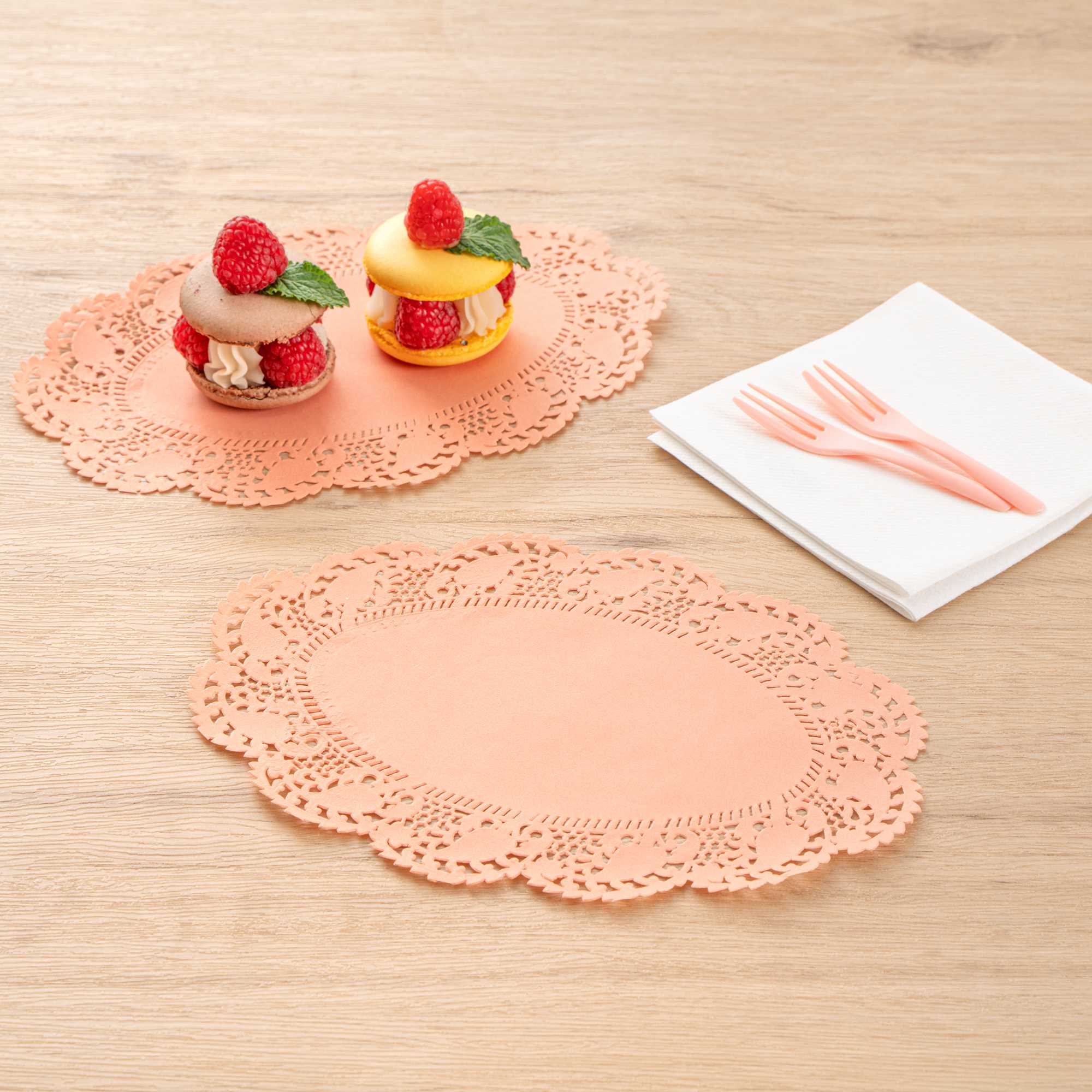 Enhance your dessert displays with our Pastry Tek Oval Coral Paper Doilies, adding an elegant touch to every presentation. Crafted from high-quality paper, these lace doilies provide the durability needed for showcasing desserts at bakeries or catered luncheons without tearing or losing their structural integrity. Featuring intricate lace-like details, these table doilies not only increase the visual appeal of food presentations but also serve as functional barriers, protecting surfaces and absorbing moisture. The coral colored finish of these small doilies allows them to complement a wide range of table settings and themes, making them the perfect choice for various events and occasions. Designed for convenience, these disposable paper doilies eradicate the hassle of post-event cleanup, offering a time-saving solution for busy hosts and food establishments. Ideal for use under cupcakes, petit fours, macarons, and other small treats, these lace doilies measure 9 inches in length by 6.5 inches in width. Sold in a 4,000 count box.