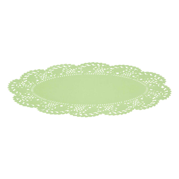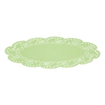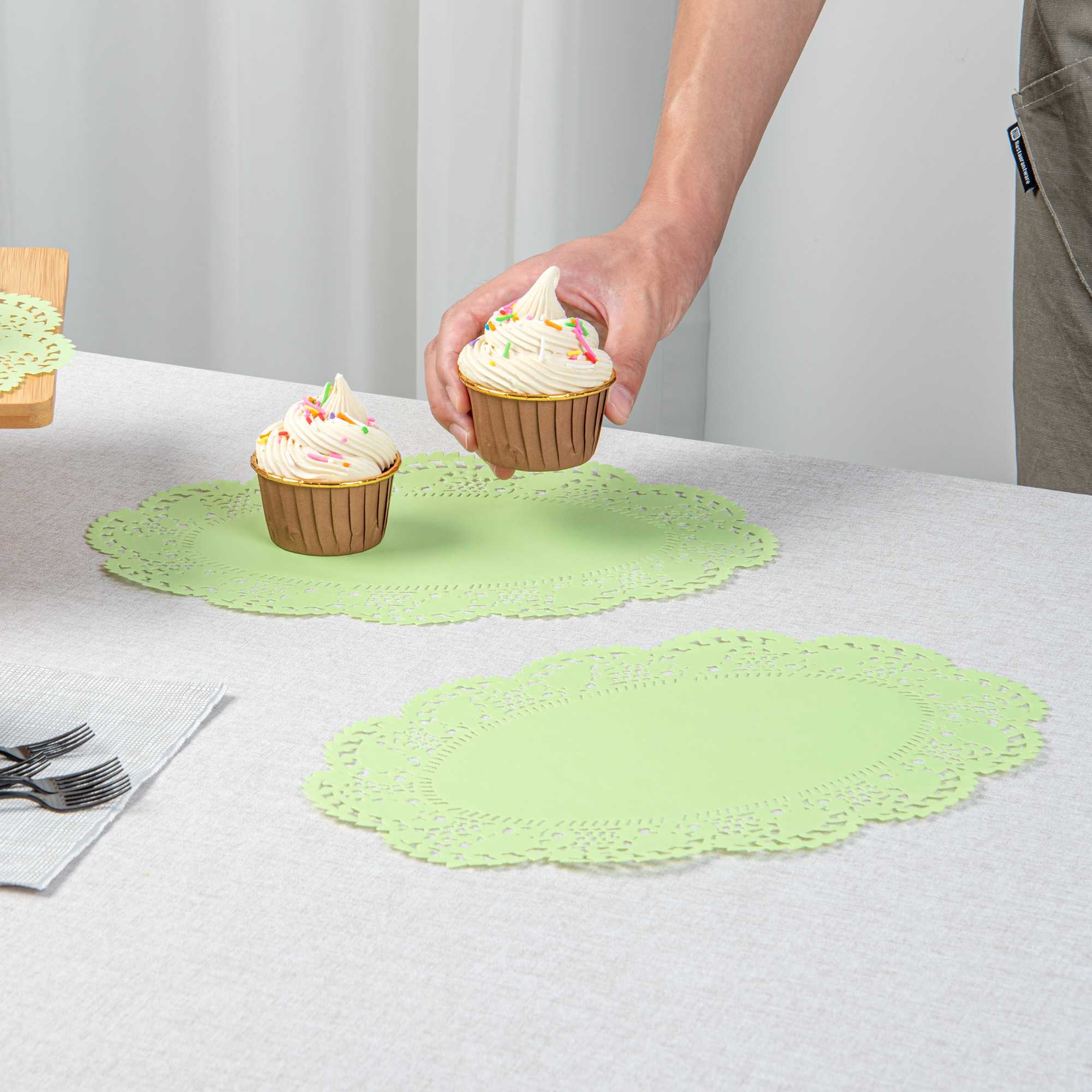 Enhance your dessert displays with our Pastry Tek Oval Green Paper Doilies, adding an elegant touch to any presentation. Crafted from high-quality paper, these lace doilies provide durability, ensuring your desserts remain beautifully displayed without tearing or losing their structural integrity. Featuring intricate lace-like details, these table doilies enhance the visual appeal of food presentations while serving as functional barriers that protect surfaces and absorb moisture. The versatile green finish of these paper doilies allows them to complement a wide range of table settings and themes, making them ideal for various events and occasions. Designed for convenience, these disposable doilies eradicate the hassle of post-event cleanup, offering a time-saving solution for busy cafes and food establishments. Perfect for use under cupcakes, petit fours, macarons, and other small treats, these small doilies are essential for any food display. Measuring 12.5 inches in length by 8.5 inches in width, these lace doilies are perfectly sized for versatile use. Sold in a 100 count box.