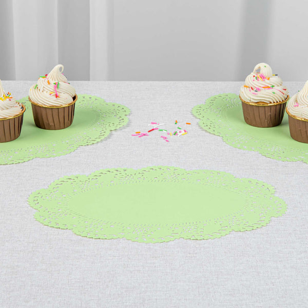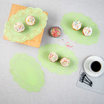 Enhance your dessert displays with our Pastry Tek Oval Green Paper Doilies, adding an elegant touch to any presentation. Crafted from high-quality paper, these lace doilies provide durability, ensuring your desserts remain beautifully displayed without tearing or losing their structural integrity. Featuring intricate lace-like details, these table doilies enhance the visual appeal of food presentations while serving as functional barriers that protect surfaces and absorb moisture. The versatile green finish of these paper doilies allows them to complement a wide range of table settings and themes, making them ideal for various events and occasions. Designed for convenience, these disposable doilies eradicate the hassle of post-event cleanup, offering a time-saving solution for busy cafes and food establishments. Perfect for use under cupcakes, petit fours, macarons, and other small treats, these small doilies are essential for any food display. Measuring 12.5 inches in length by 8.5 inches in width, these lace doilies are perfectly sized for versatile use. Sold in a 4,000 count box.