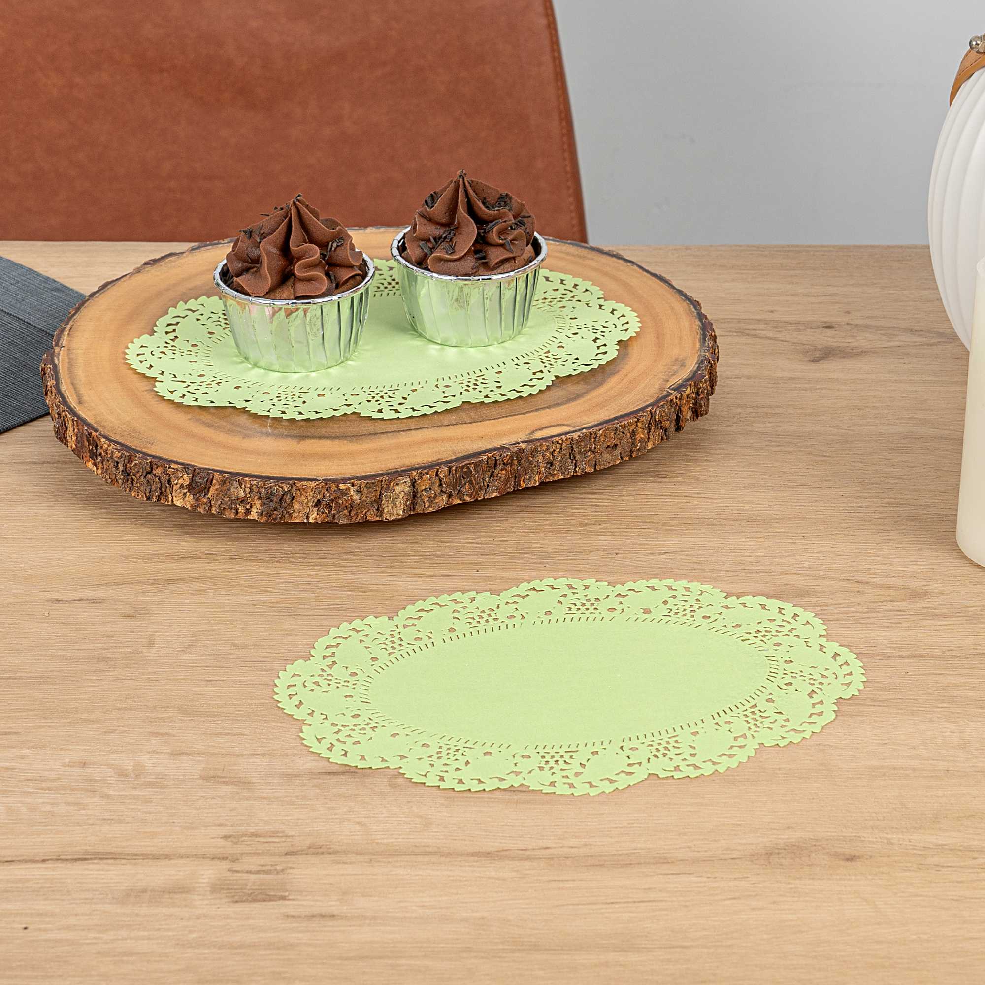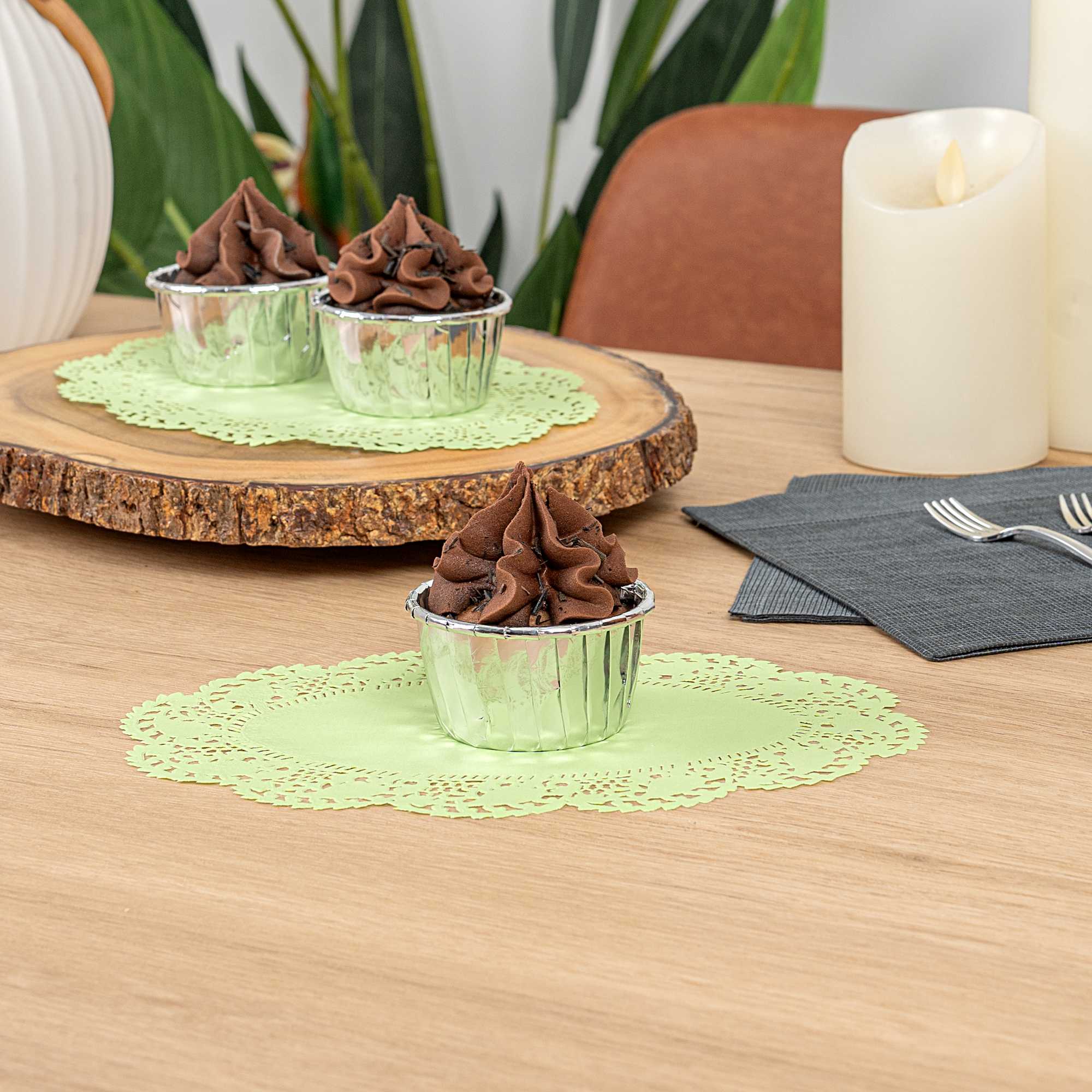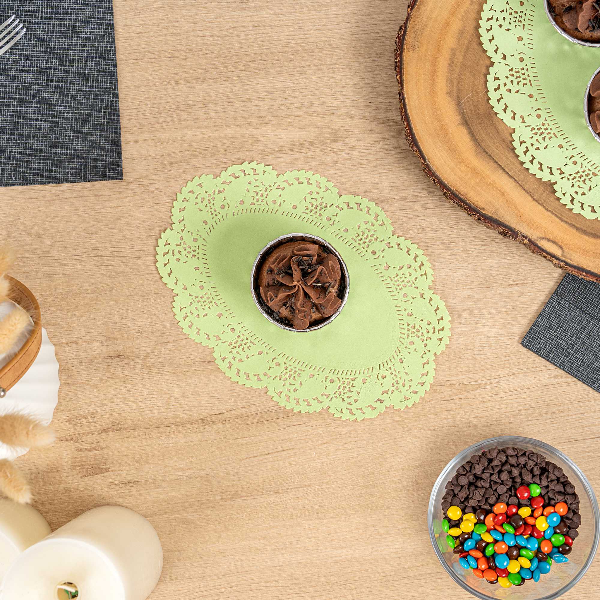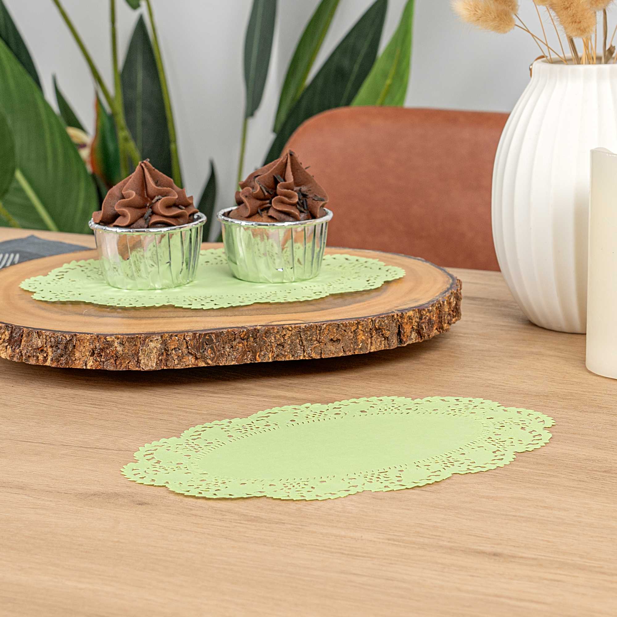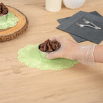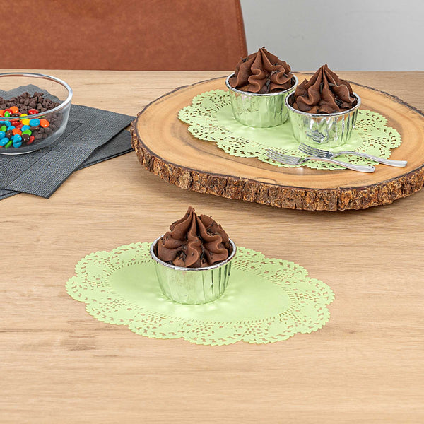Elevate your dessert presentations with our Pastry Tek Oval Green Paper Doilies. Crafted from high-quality paper, these table doilies provide durability while displaying desserts at bakeries without tearing or losing their structural integrity. Featuring intricate lace-like details, these lace doilies enhance the visual appeal of food presentations while serving as functional barriers, protecting surfaces, and absorbing moisture. The green colored finish of these paper doilies is versatile, allowing them to complement a wide range of table settings and themes, making them an ideal choice for various events and occasions. Designed for convenience, these paper doilies are disposable to eradicate the hassle of post-event cleanup, offering a time-saving solution for busy hosts and food establishments. Measuring 9 inches in length by 6.5 inches in width, these small doilies are perfect for under cupcakes, petit fours, macarons, and other small treats. Sold in a 100 count box.