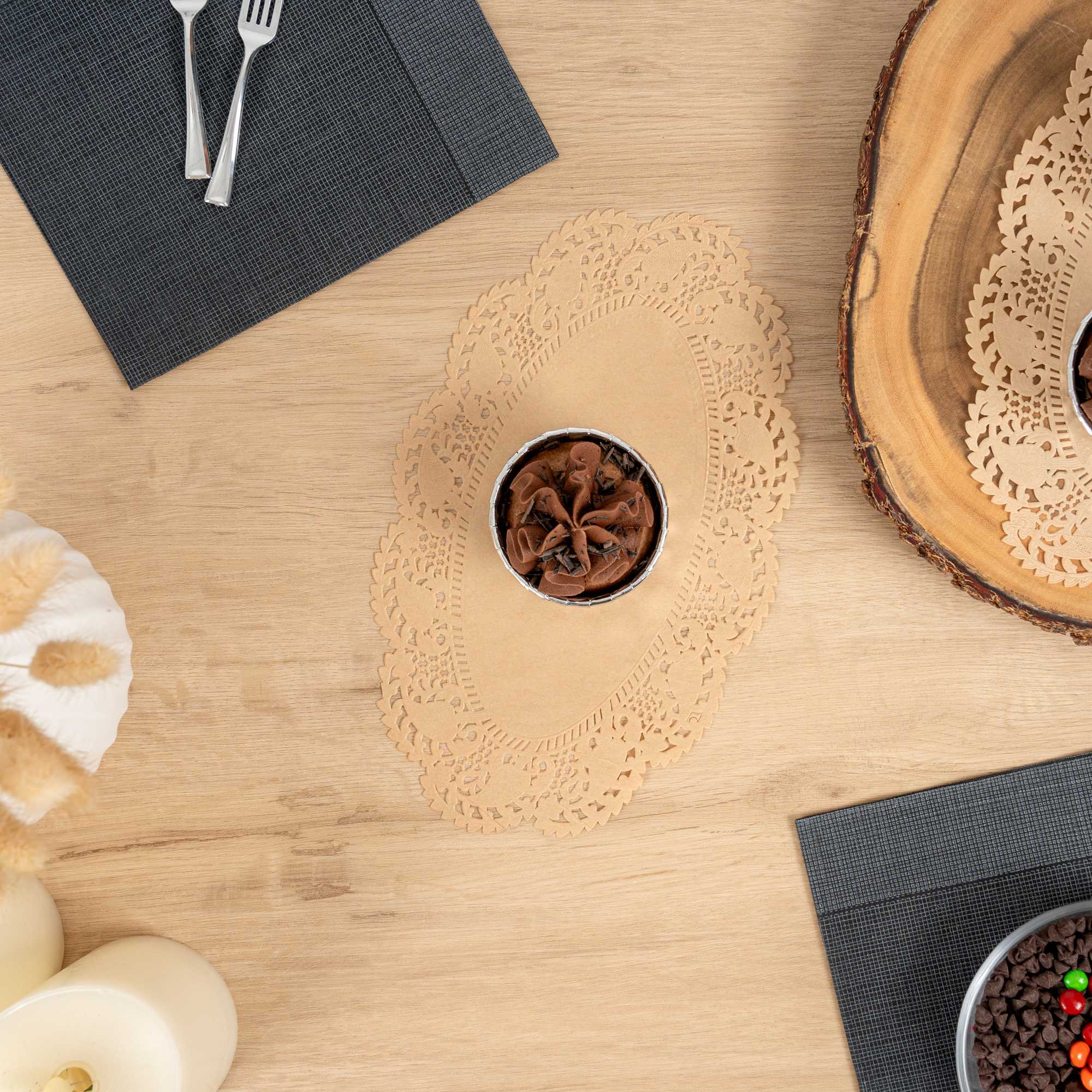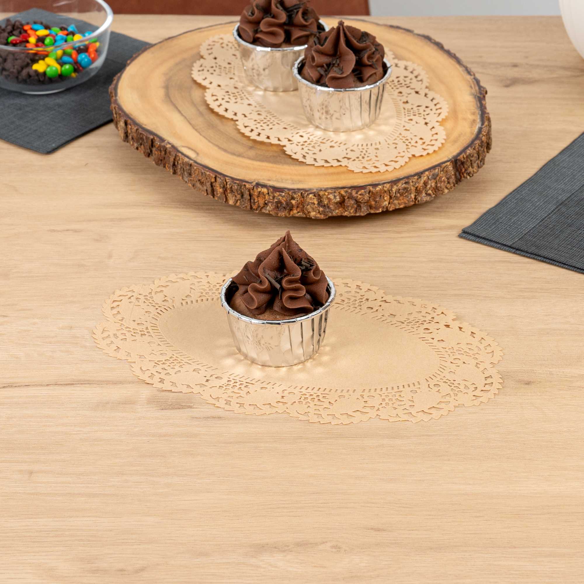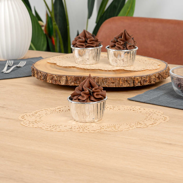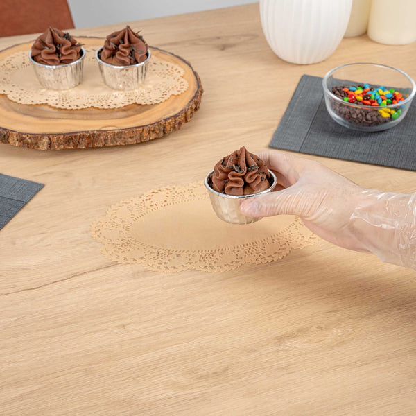 Elevate your dessert displays with our Pastry Tek Oval Kraft Paper Doilies. These high-quality paper doilies add an elegant touch to any table setting, making them perfect for showcasing desserts at bakeries or catered luncheons. Crafted with durability in mind, these lace doilies maintain their structural integrity without tearing, ensuring your presentations remain pristine. Designed with intricate lace-like details, these table doilies enhance the visual appeal of food presentations while serving as functional barriers that protect surfaces and absorb moisture. The kraft finish of these paper doilies allows them to beautifully complement a wide range of themes and table settings, making them an ideal choice for various events and occasions. Disposable by design, these small doilies eradicate the hassle of post-event cleanup, offering a convenient and time-saving solution for busy cafes and food establishments. Measuring 10.5 inches in length by 6.5 inches in width, these lace doilies are perfect for use under cupcakes, petit fours, macarons, and other small treats. Sold in a 4,000 count box.