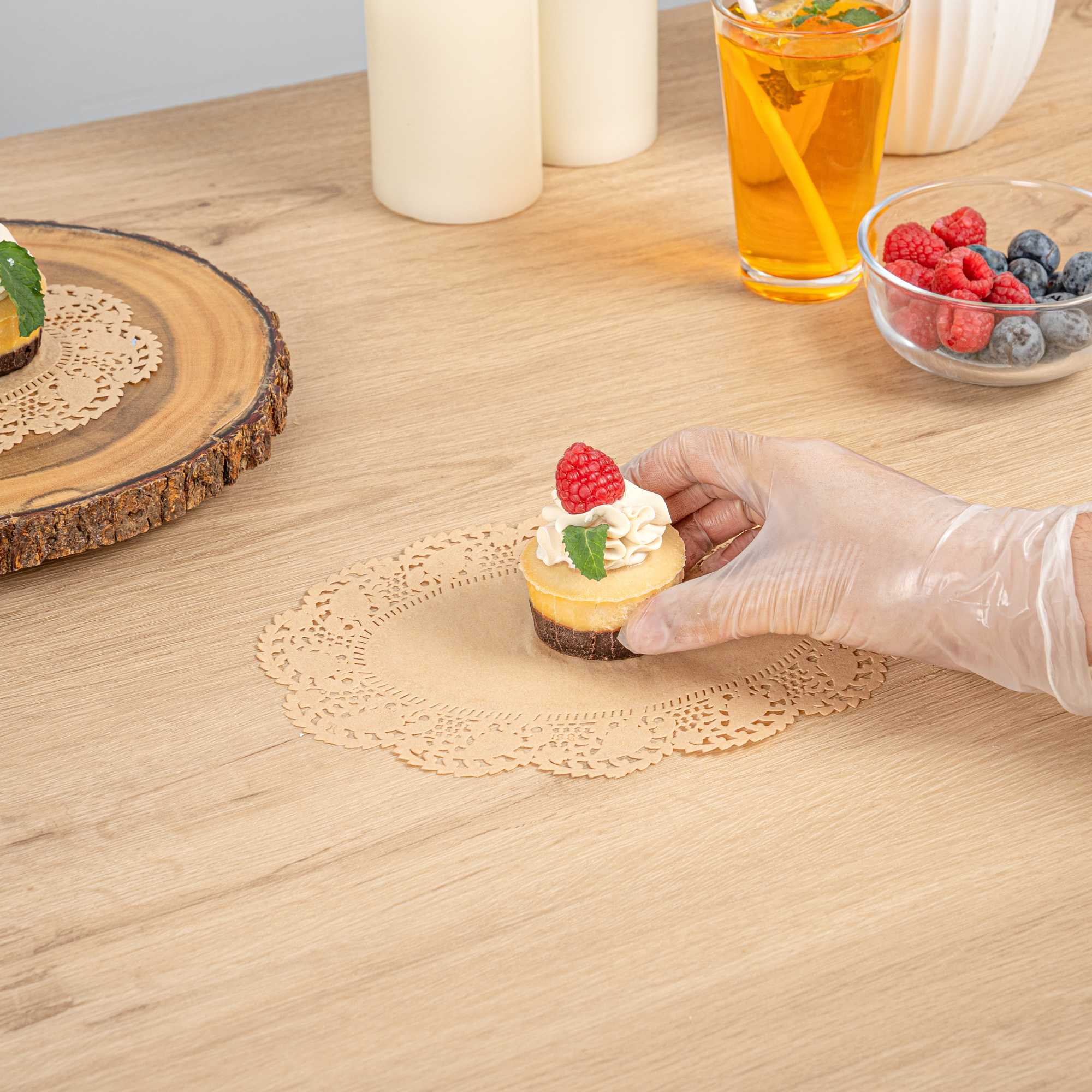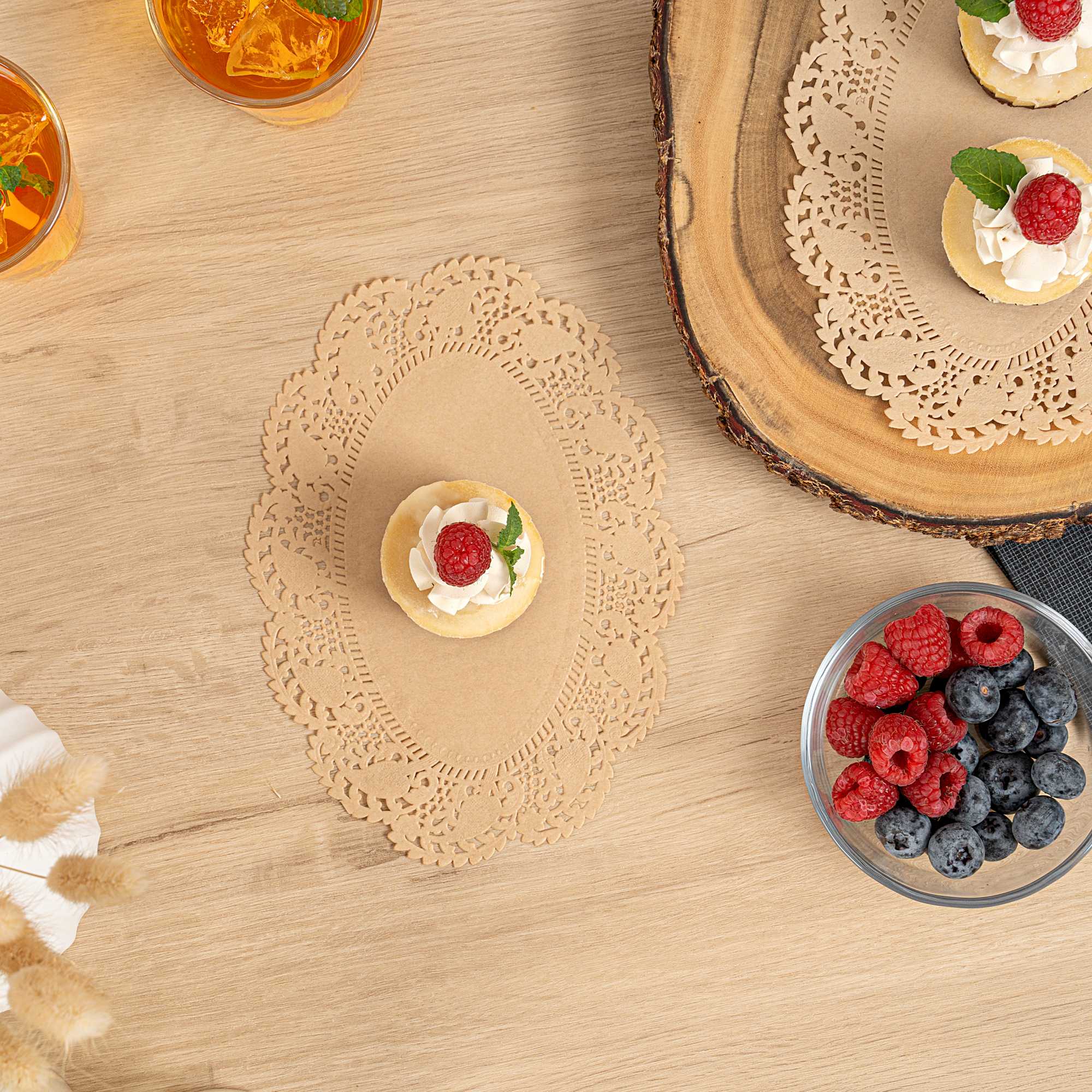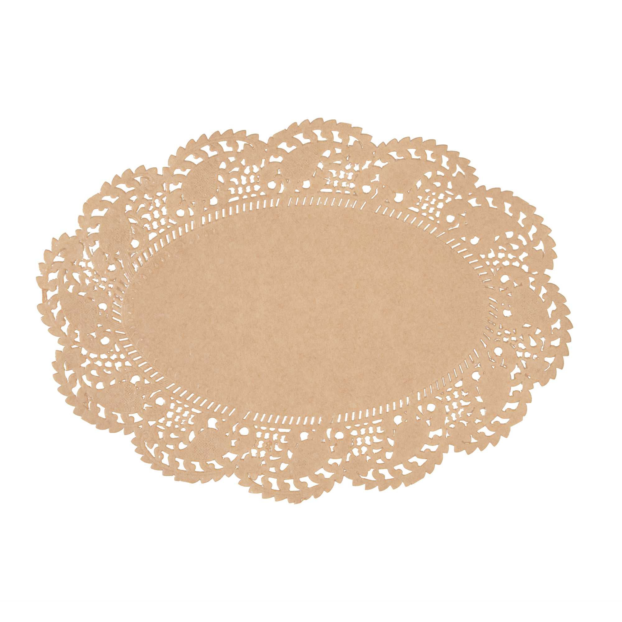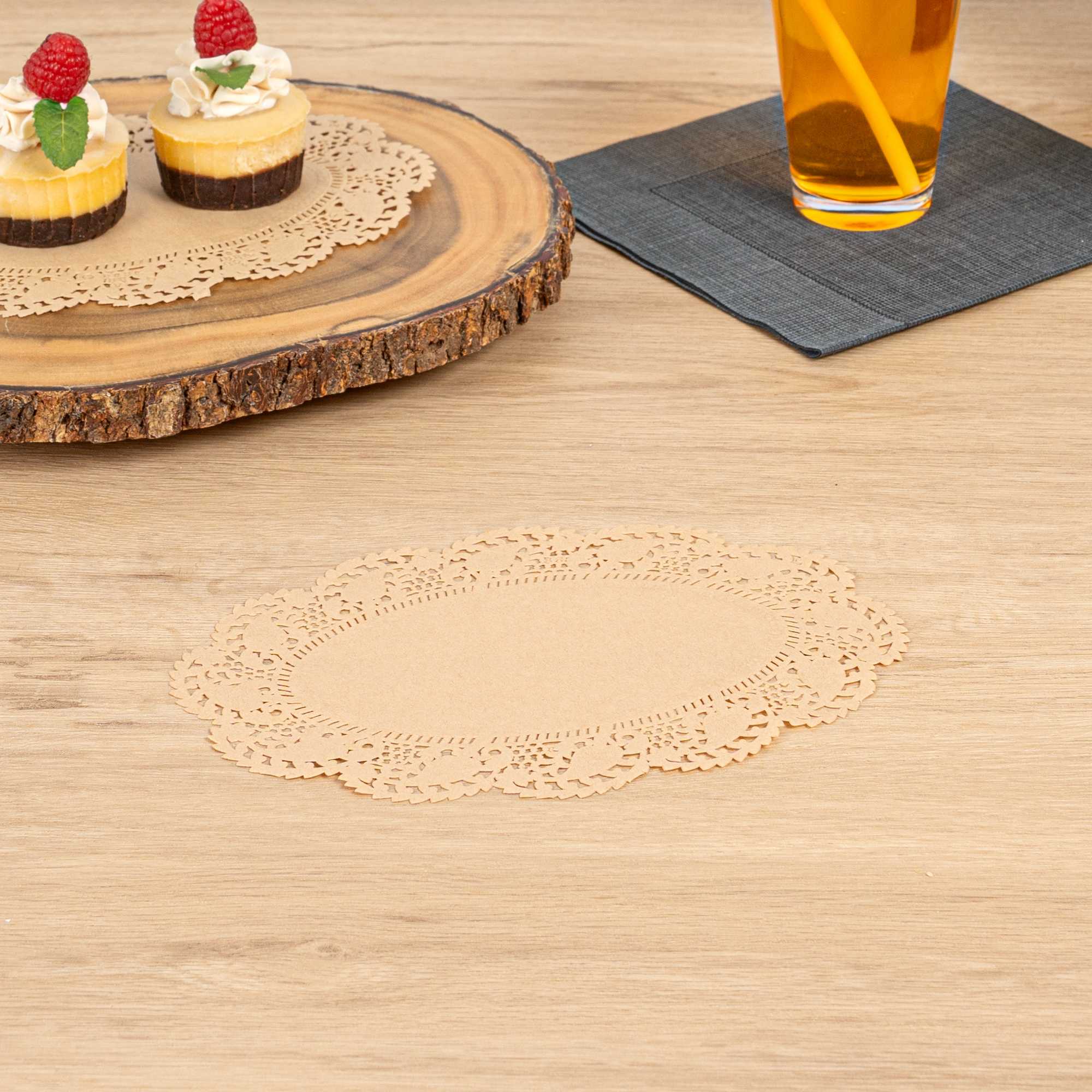 Enhance the elegance of your dessert displays with our Pastry Tek Oval Kraft Paper Doilies. Crafted from high-quality paper, these lace doilies provide unmatched durability while showcasing desserts at bakeries or catered luncheons without tearing or losing their structural integrity. Featuring intricate lace-like details, these table doilies not only increase the visual appeal of your food presentations but also serve as functional barriers, protecting surfaces and absorbing moisture. The kraft finish of these doilies ensures they complement a wide range of table settings and themes, making them an ideal choice for various events and occasions. Disposable by design, these paper doiles eradicate the hassle of post-event cleanup, offering a convenient and time-saving solution for busy cafes and food establishments. Use these small doilies under cupcakes, petit fours, macarons, and other small treats to add a touch of sophistication. Measuring 9 inches in length by 6.5 inches in width, these lace doilies are perfectly sized for a variety of desserts. Sold in a 100 count box.