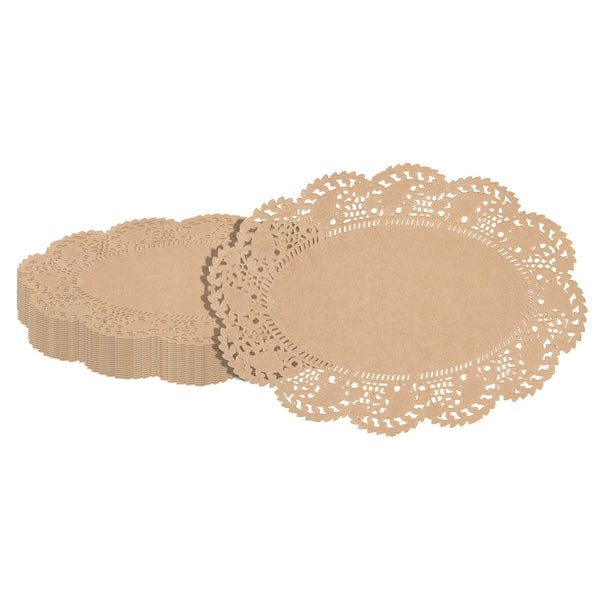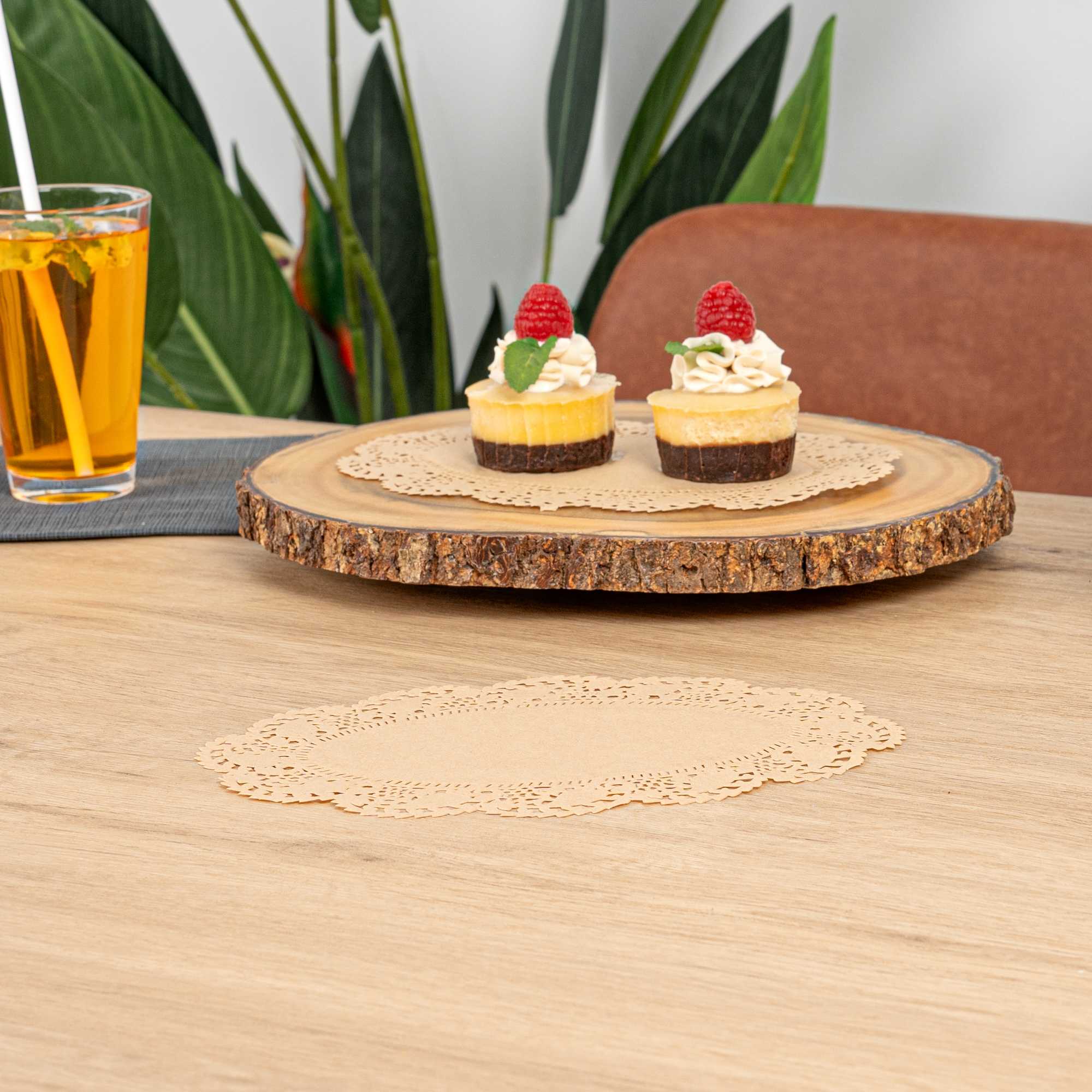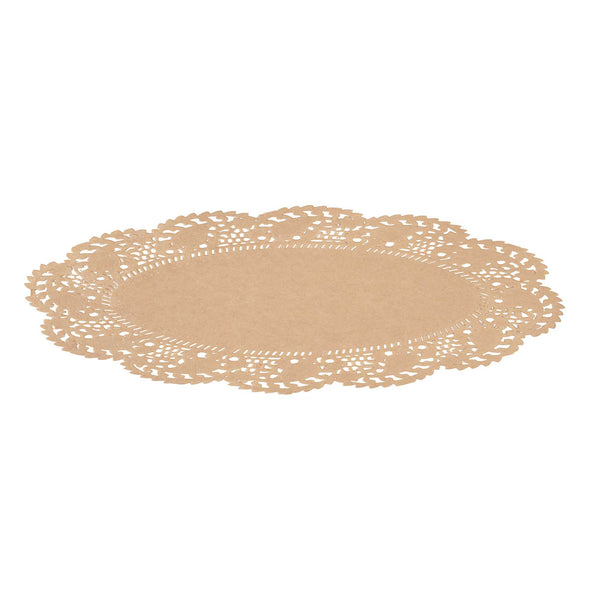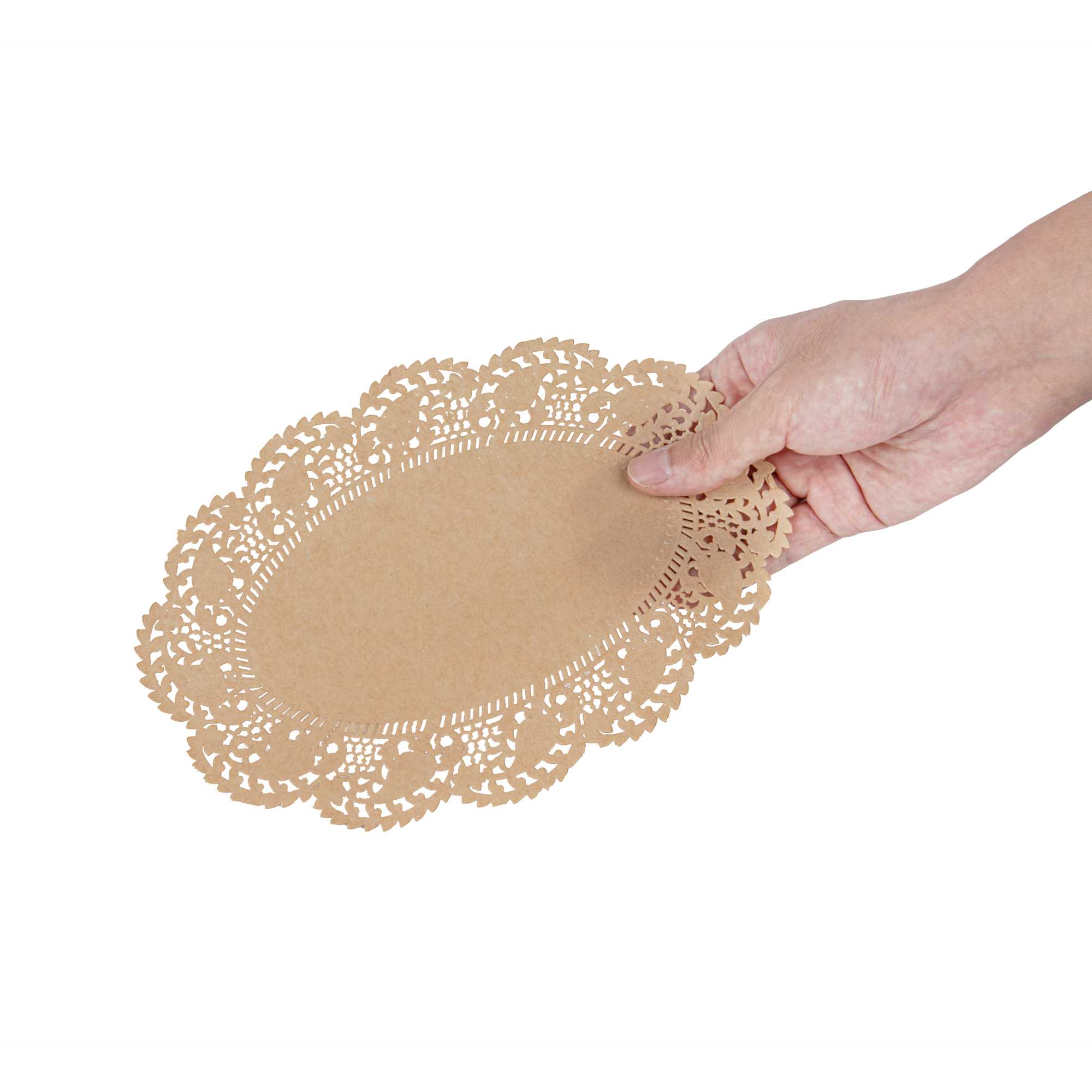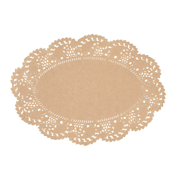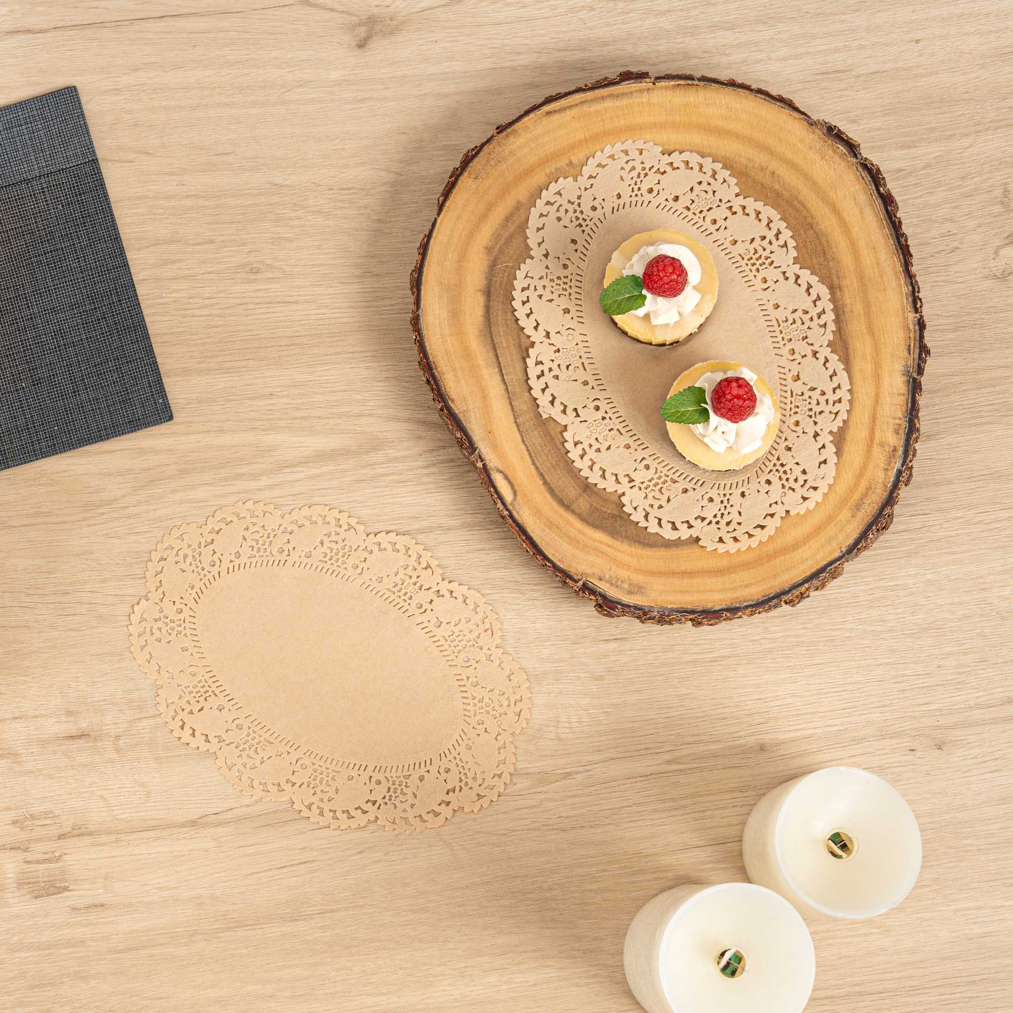 Enhance the elegance of your dessert displays with our Pastry Tek Oval Kraft Paper Doilies. Crafted from high-quality paper, these lace doilies provide unmatched durability while showcasing desserts at bakeries or catered luncheons without tearing or losing their structural integrity. Featuring intricate lace-like details, these table doilies not only increase the visual appeal of your food presentations but also serve as functional barriers, protecting surfaces and absorbing moisture. The kraft finish of these doilies ensures they complement a wide range of table settings and themes, making them an ideal choice for various events and occasions. Disposable by design, these paper doiles eradicate the hassle of post-event cleanup, offering a convenient and time-saving solution for busy cafes and food establishments. Use these small doilies under cupcakes, petit fours, macarons, and other small treats to add a touch of sophistication. Measuring 9 inches in length by 6.5 inches in width, these lace doilies are perfectly sized for a variety of desserts. Sold in a 100 count box.