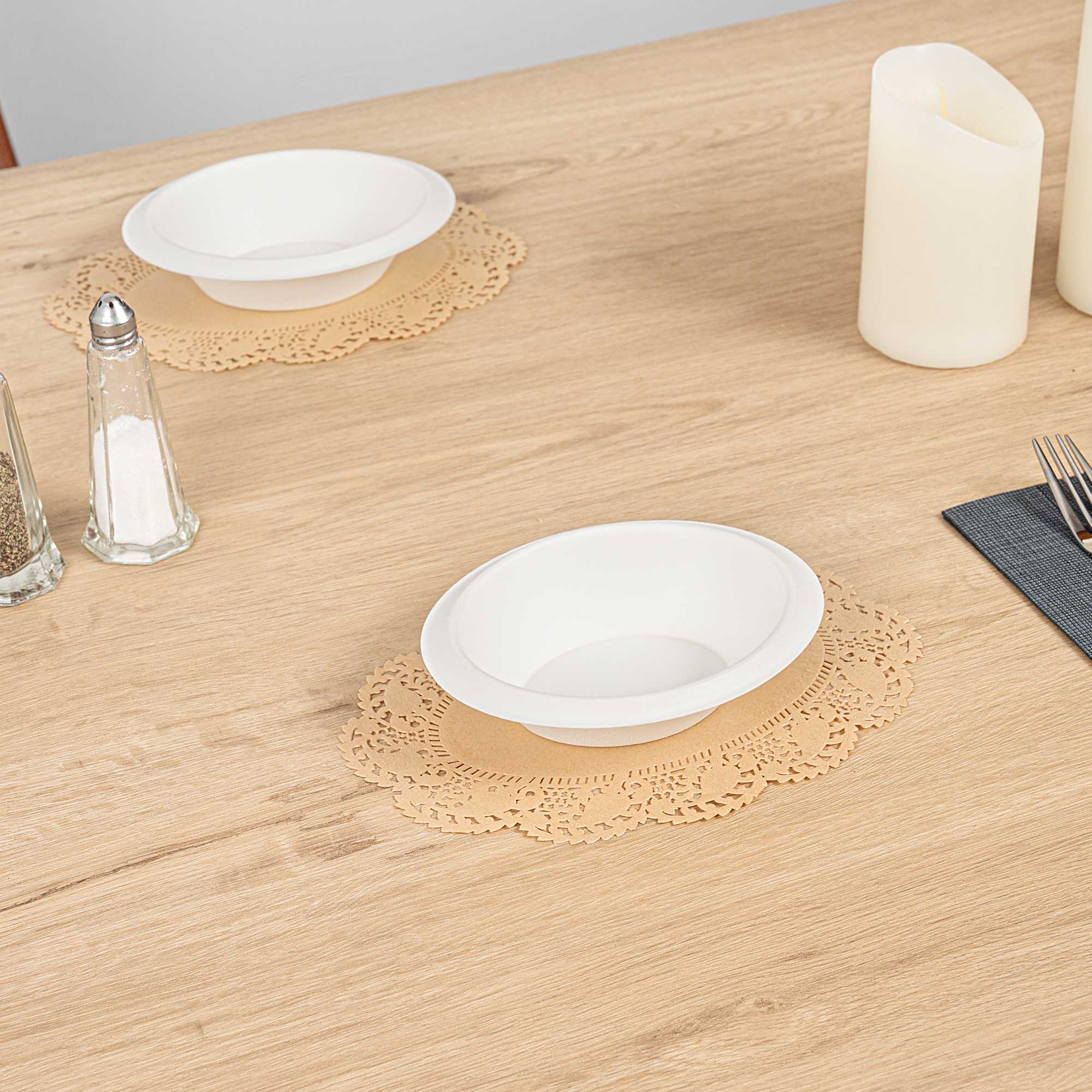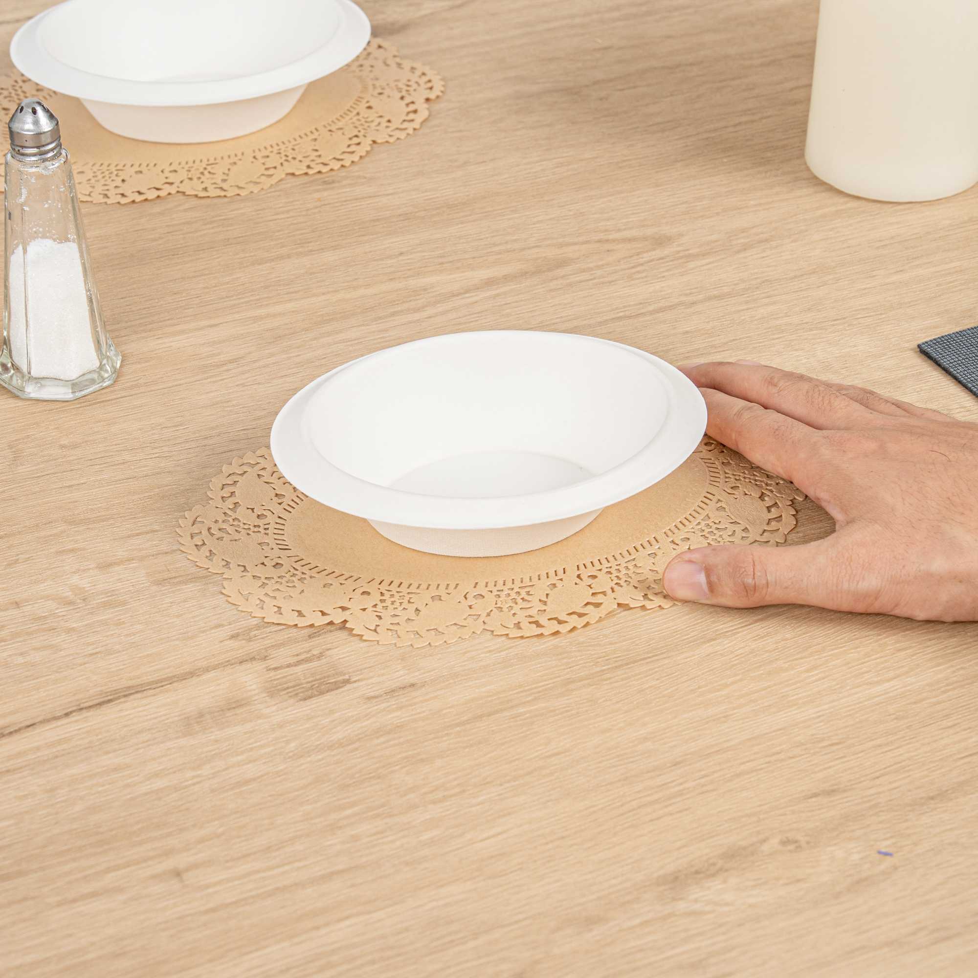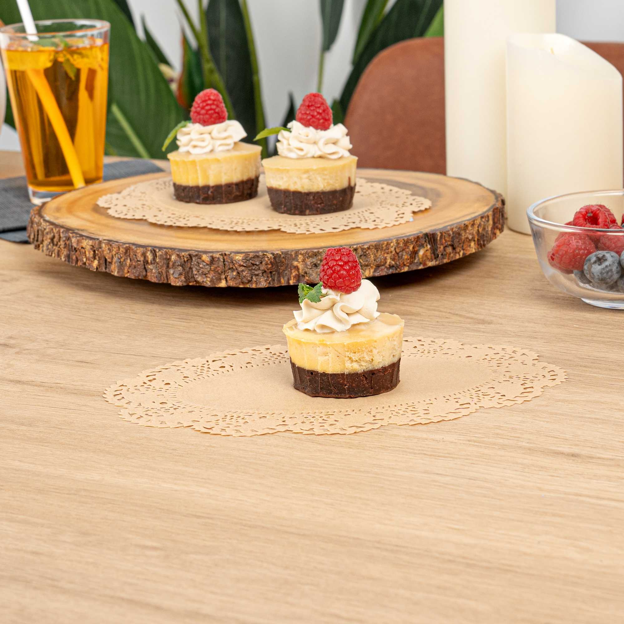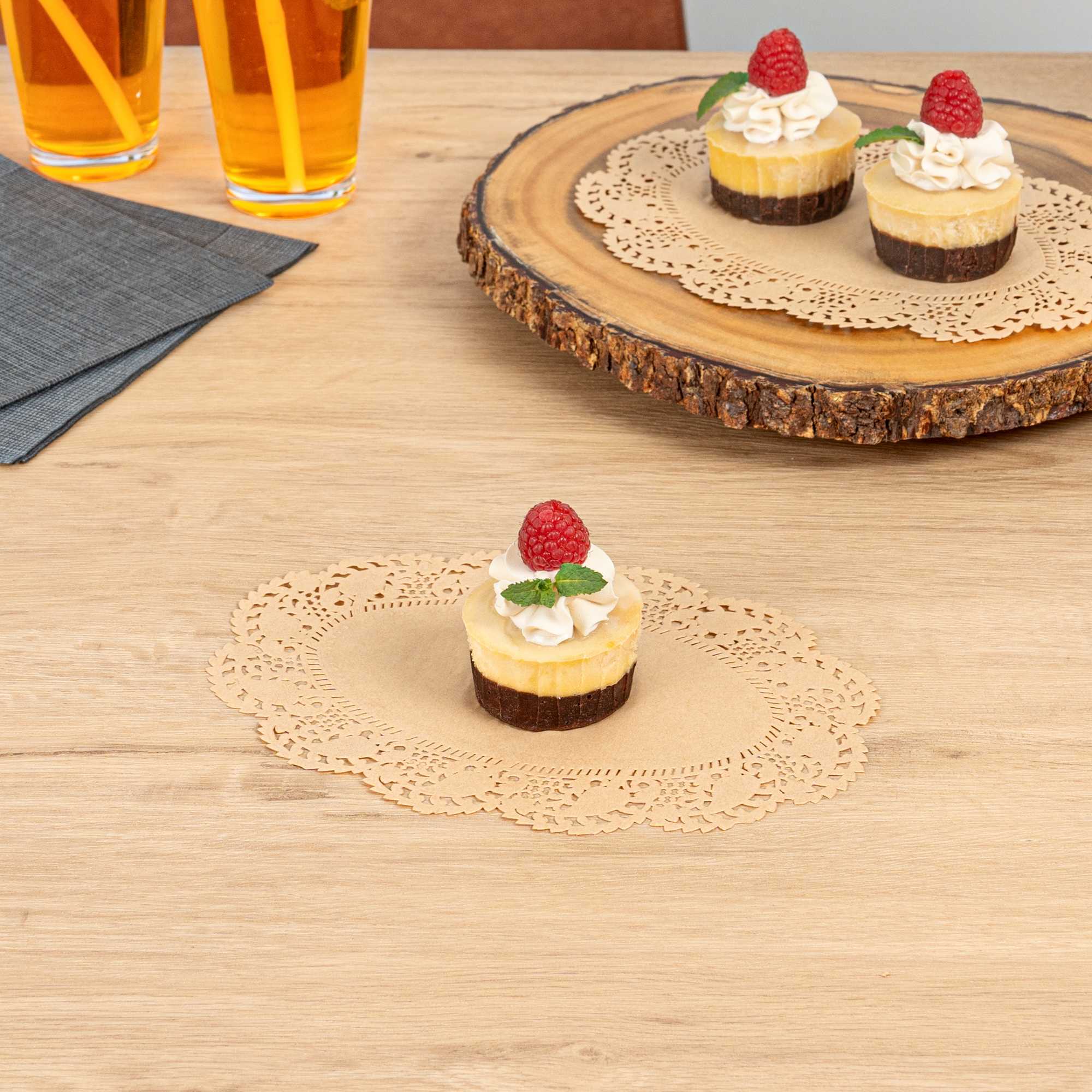 Enhance the elegance of your dessert displays with our Pastry Tek Oval Kraft Paper Doilies. Crafted from high-quality paper, these lace doilies provide unmatched durability while showcasing desserts at bakeries or catered luncheons without tearing or losing their structural integrity. Featuring intricate lace-like details, these table doilies not only increase the visual appeal of your food presentations but also serve as functional barriers, protecting surfaces and absorbing moisture. The kraft finish of these doilies ensures they complement a wide range of table settings and themes, making them an ideal choice for various events and occasions. Disposable by design, these paper doiles eradicate the hassle of post-event cleanup, offering a convenient and time-saving solution for busy cafes and food establishments. Use these small doilies under cupcakes, petit fours, macarons, and other small treats to add a touch of sophistication. Measuring 9 inches in length by 6.5 inches in width, these lace doilies are perfectly sized for a variety of desserts. Sold in a 100 count box.