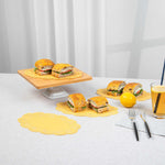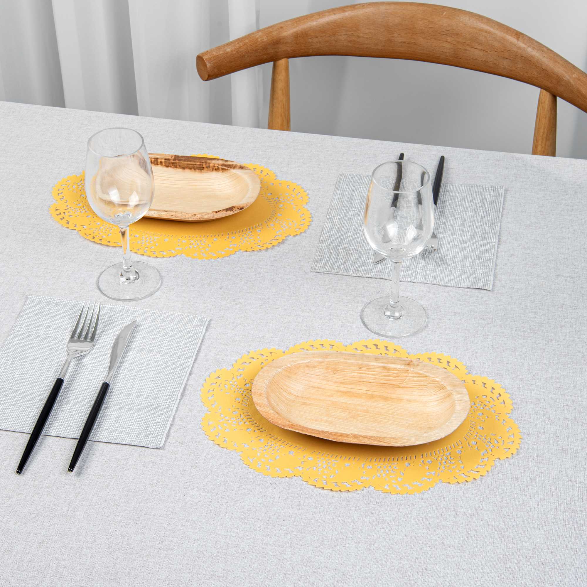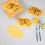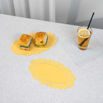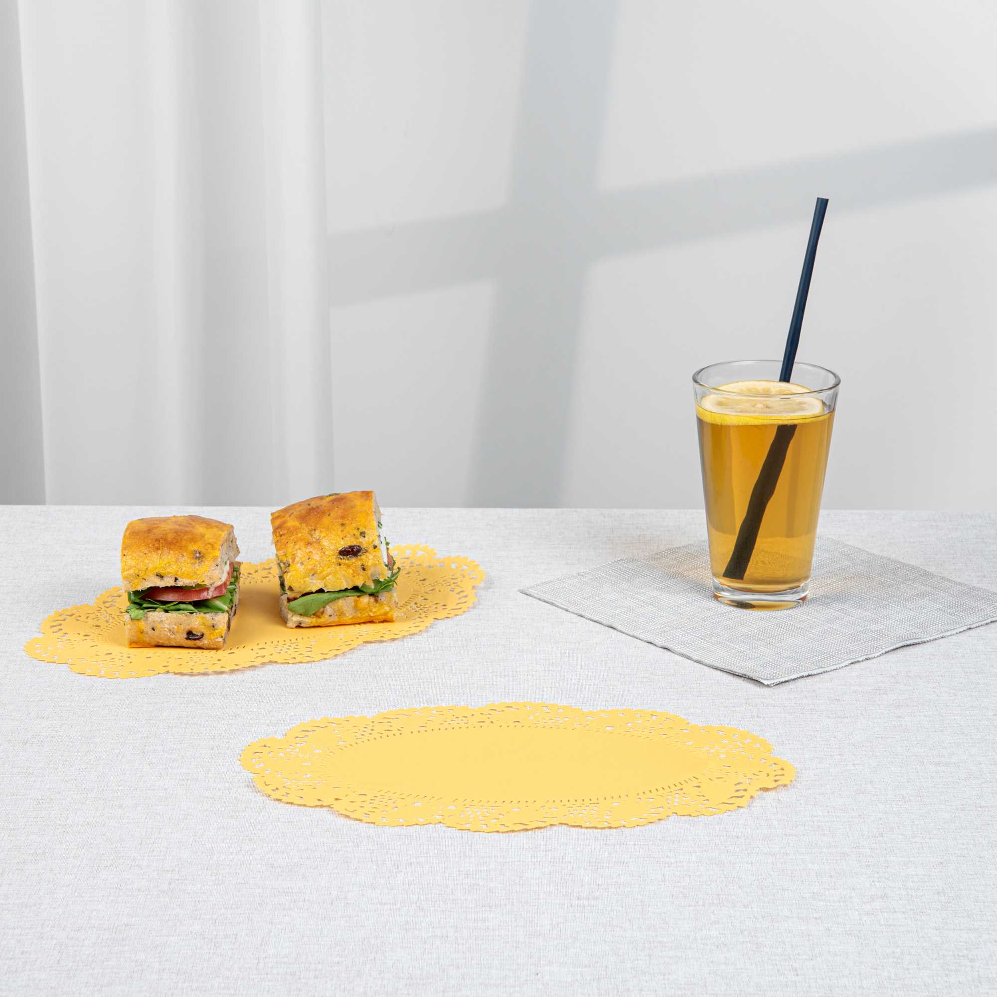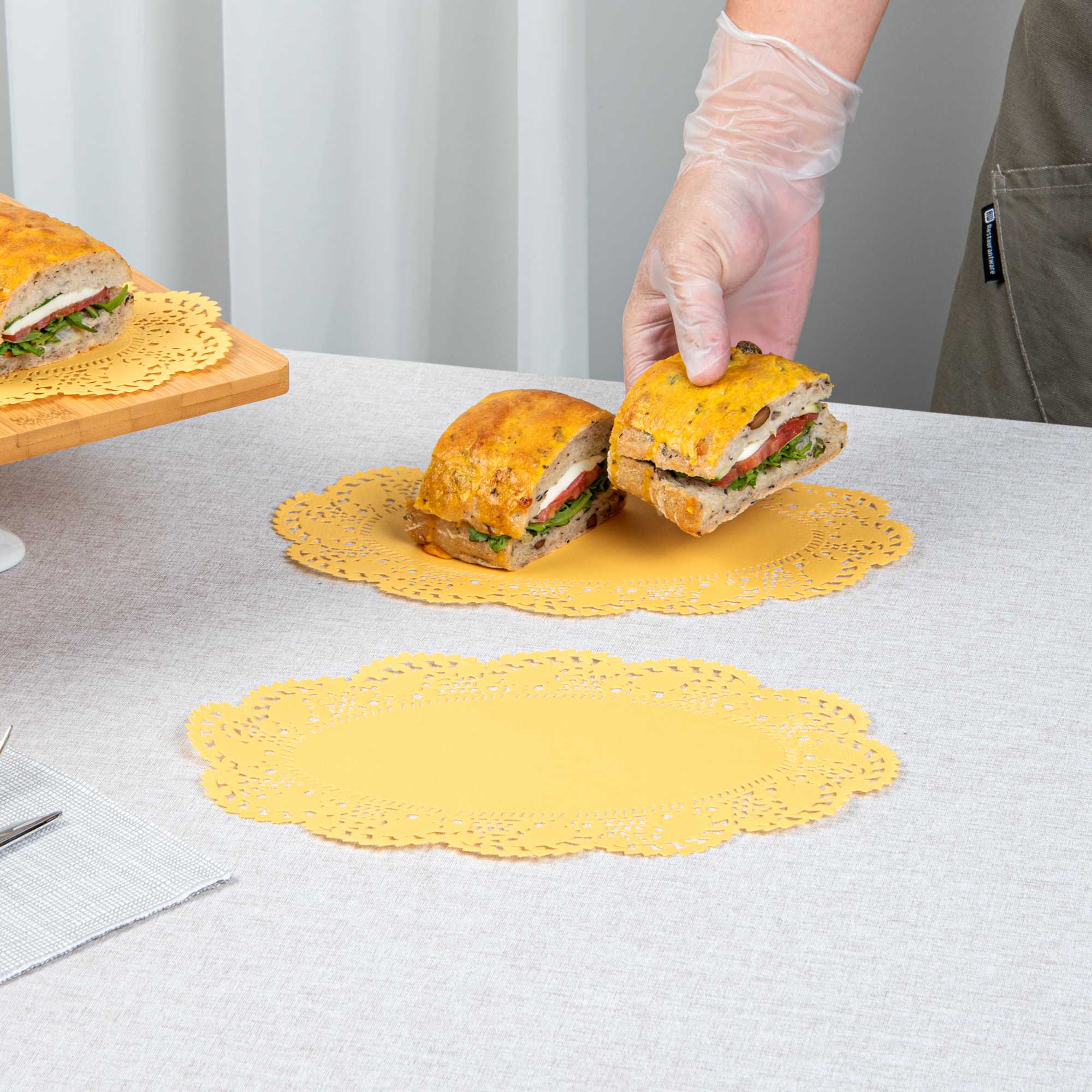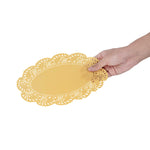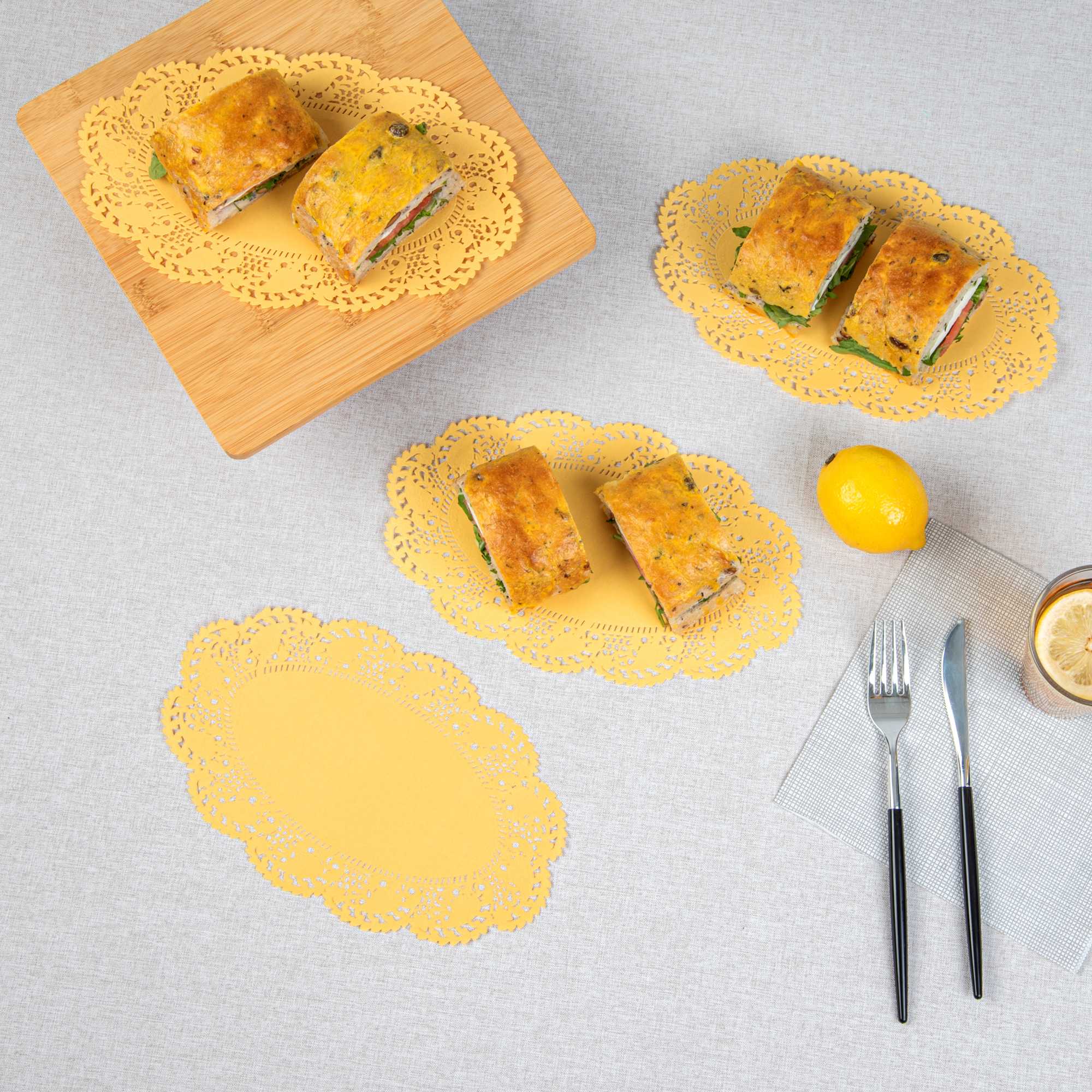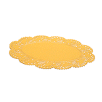 Elevate your dessert displays with our Pastry Tek Oval Orange Paper Doilies. Crafted from high-quality paper, these table doilies provide durability while showcasing desserts at bakeries or catered luncheons without tearing or losing their structural integrity. Lace-like details on these paper doilies increase the visual appeal of food presentations, serving as functional barriers that protect surfaces and absorb moisture. The orange colored finish of these lace doilies is versatile, allowing them to complement a wide range of table settings and themes, making them an ideal choice for various events and occasions. These small doilies are disposable to eradicate the hassle of post-event cleanup, offering a convenient and time-saving solution for busy hosts and food establishments. Measuring 10.5 inches in length by 6.5 inches in width, these colored paper doilies are perfect for use under cupcakes, petit fours, macarons, and other small treats. Sold in a 4,000 count box.