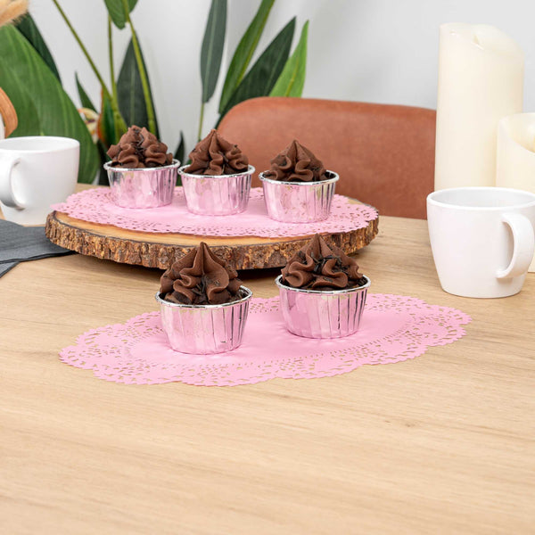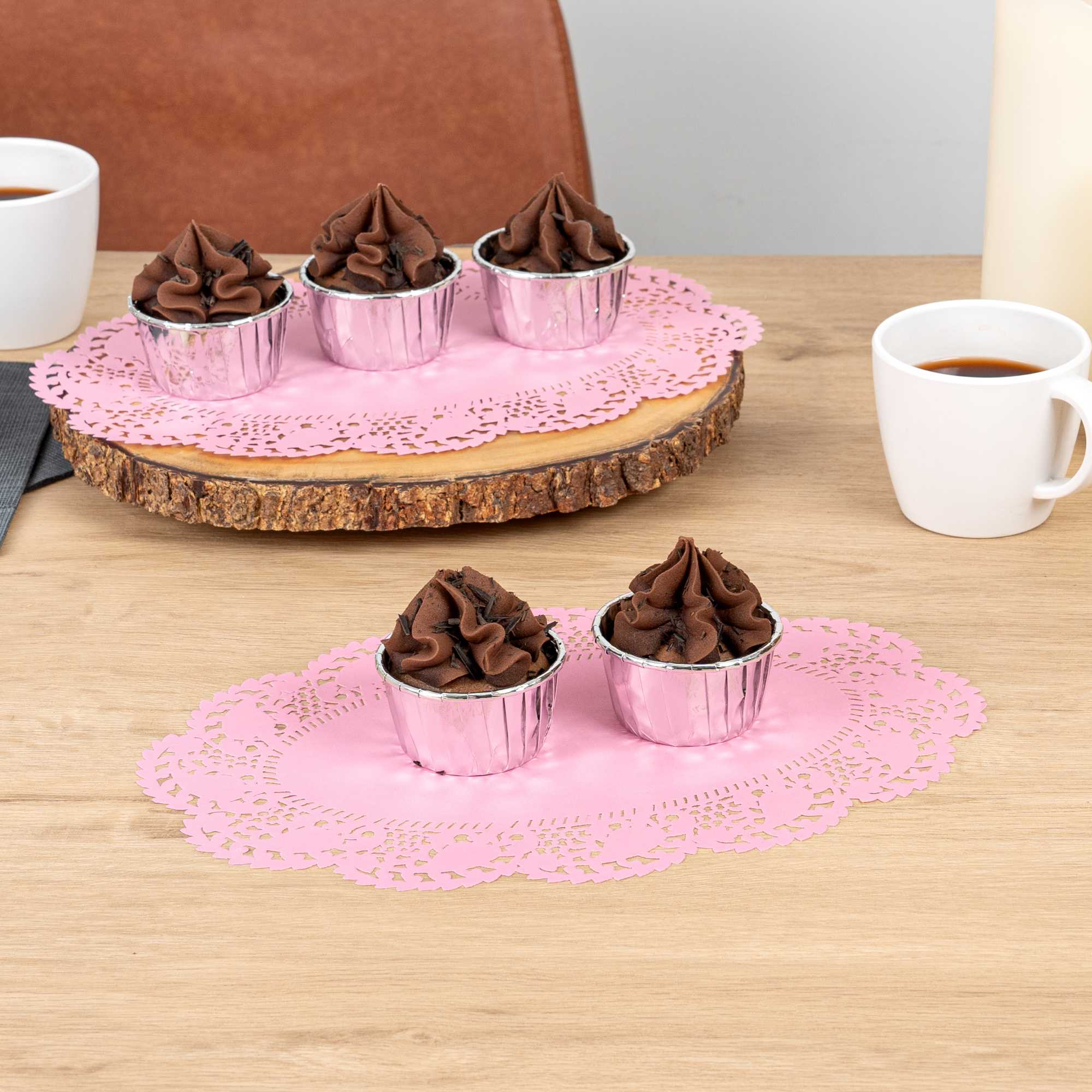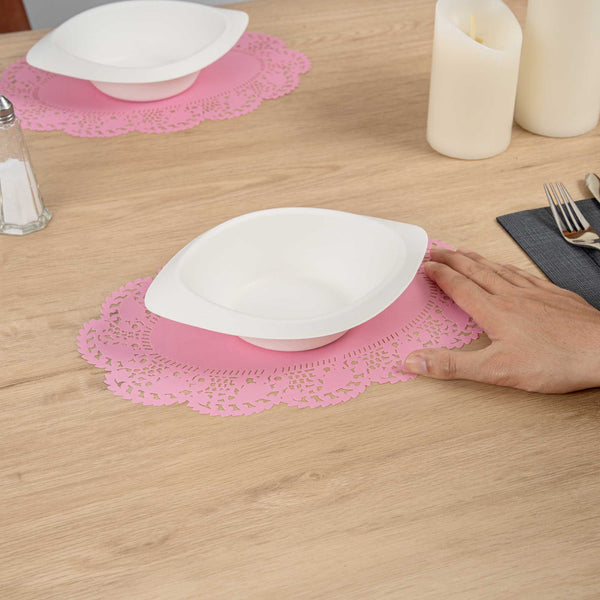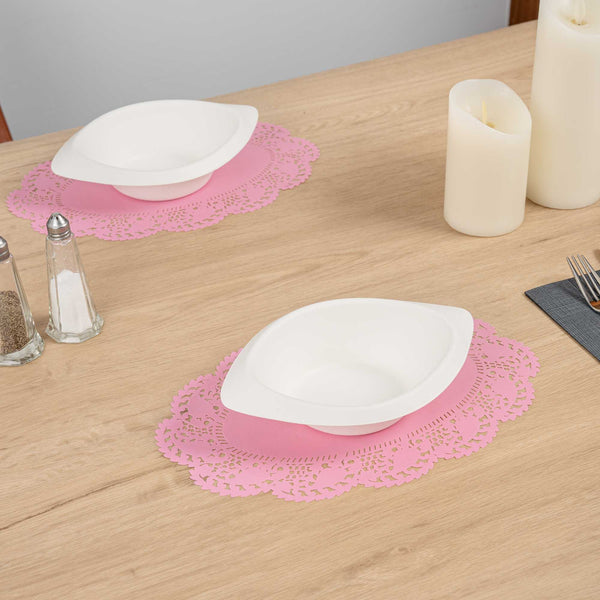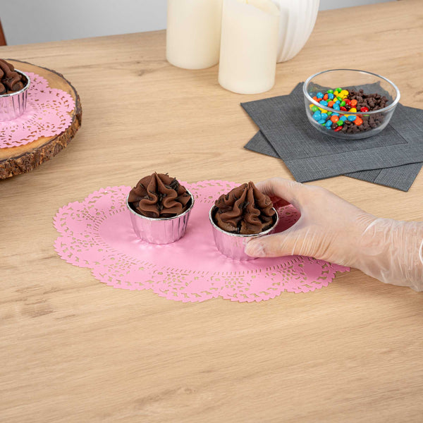 Elevate your dessert presentations with our Pastry Tek Oval Pink Paper Doilies. Crafted from high-quality paper, these lace doilies provide durability while displaying desserts at bakeries or catered luncheons without tearing. The intricate lace-like details of these table doilies increase the visual appeal of food presentations while serving as functional barriers, protecting surfaces, and absorbing moisture. With their pink colored finish, these versatile colored paper doilies complement a wide range of table settings and themes, making them ideal for various events and occasions. Being disposable, these small doilies eradicate the hassle of post-event cleanup, offering a convenient and time-saving solution for busy cafes and food establishments. Measuring 12.5 inches in length by 8.5 inches in width, these paper doilies are perfect for placing under cupcakes, petit fours, macarons, and other small treats. Sold in a 100 count box.