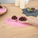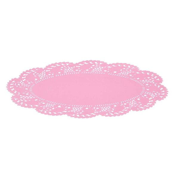 Elevate your dessert presentations with our Pastry Tek Oval Pink Paper Doilies. Crafted from high-quality paper, these lace doilies provide durability while displaying desserts at bakeries or catered luncheons without tearing. The intricate lace-like details of these table doilies increase the visual appeal of food presentations while serving as functional barriers, protecting surfaces, and absorbing moisture. With their pink colored finish, these versatile colored paper doilies complement a wide range of table settings and themes, making them ideal for various events and occasions. Being disposable, these small doilies eradicate the hassle of post-event cleanup, offering a convenient and time-saving solution for busy cafes and food establishments. Measuring 12.5 inches in length by 8.5 inches in width, these paper doilies are perfect for placing under cupcakes, petit fours, macarons, and other small treats. Sold in a 4,000 count box.