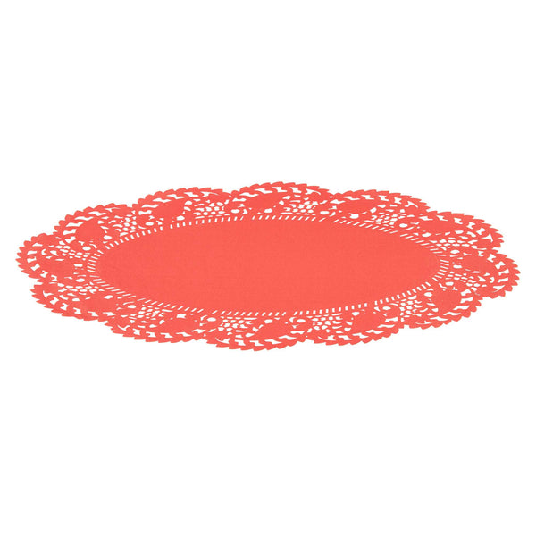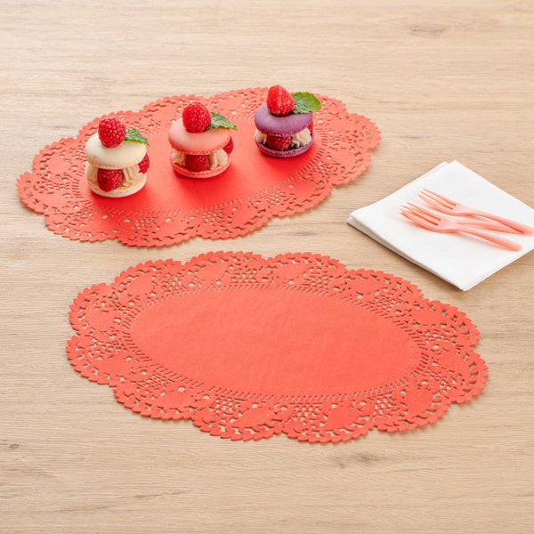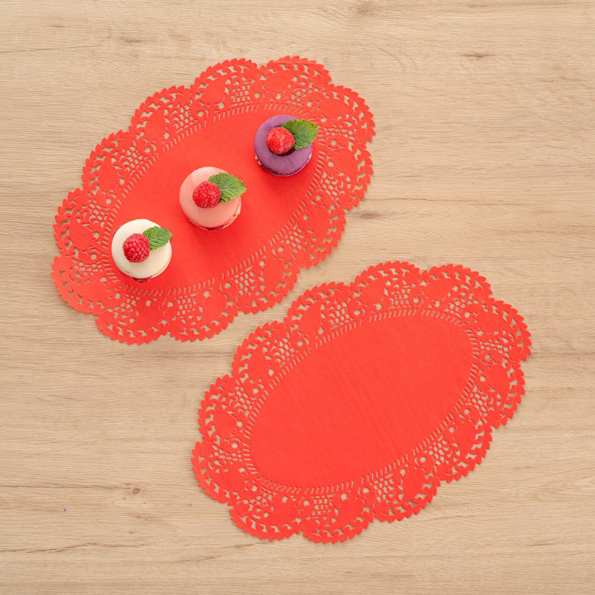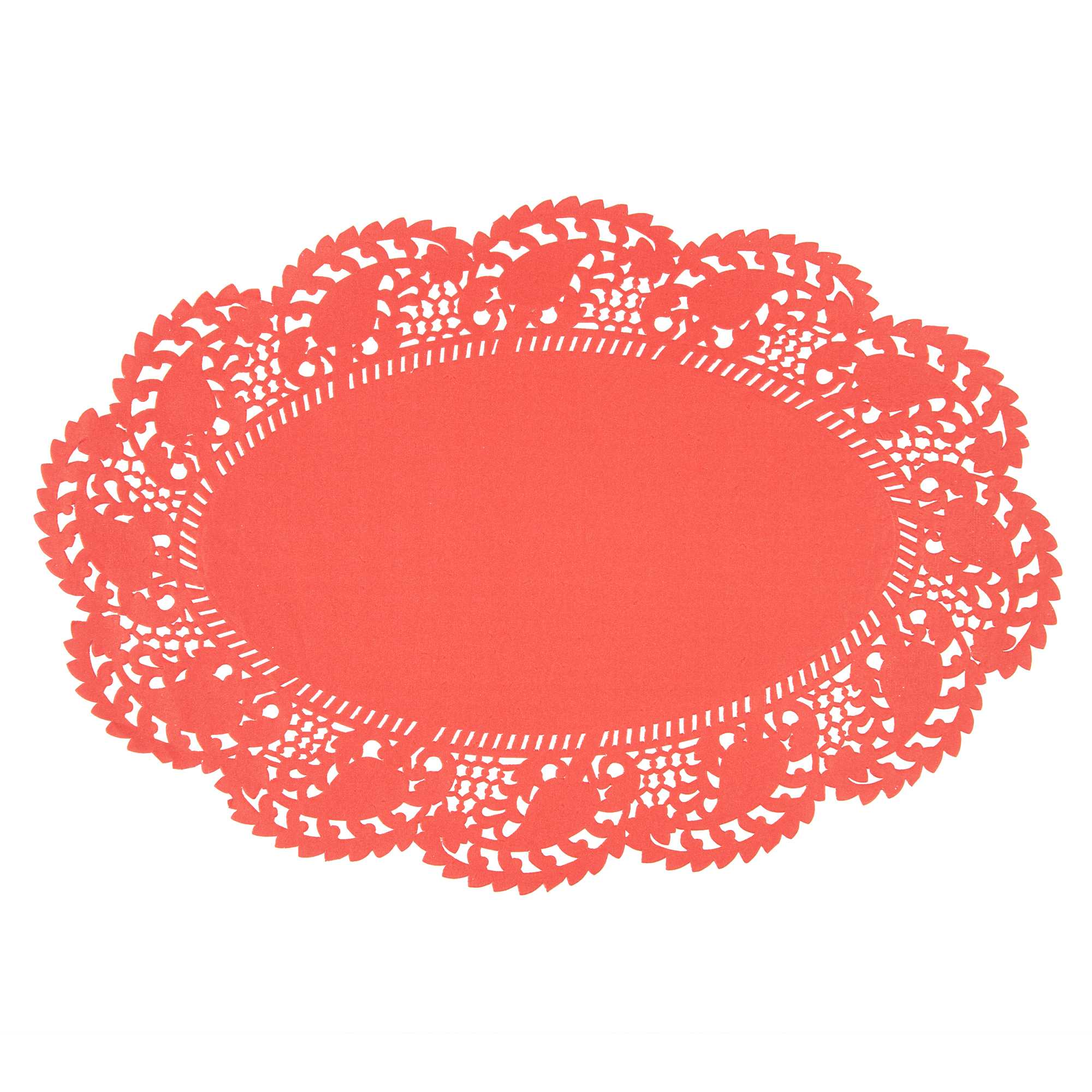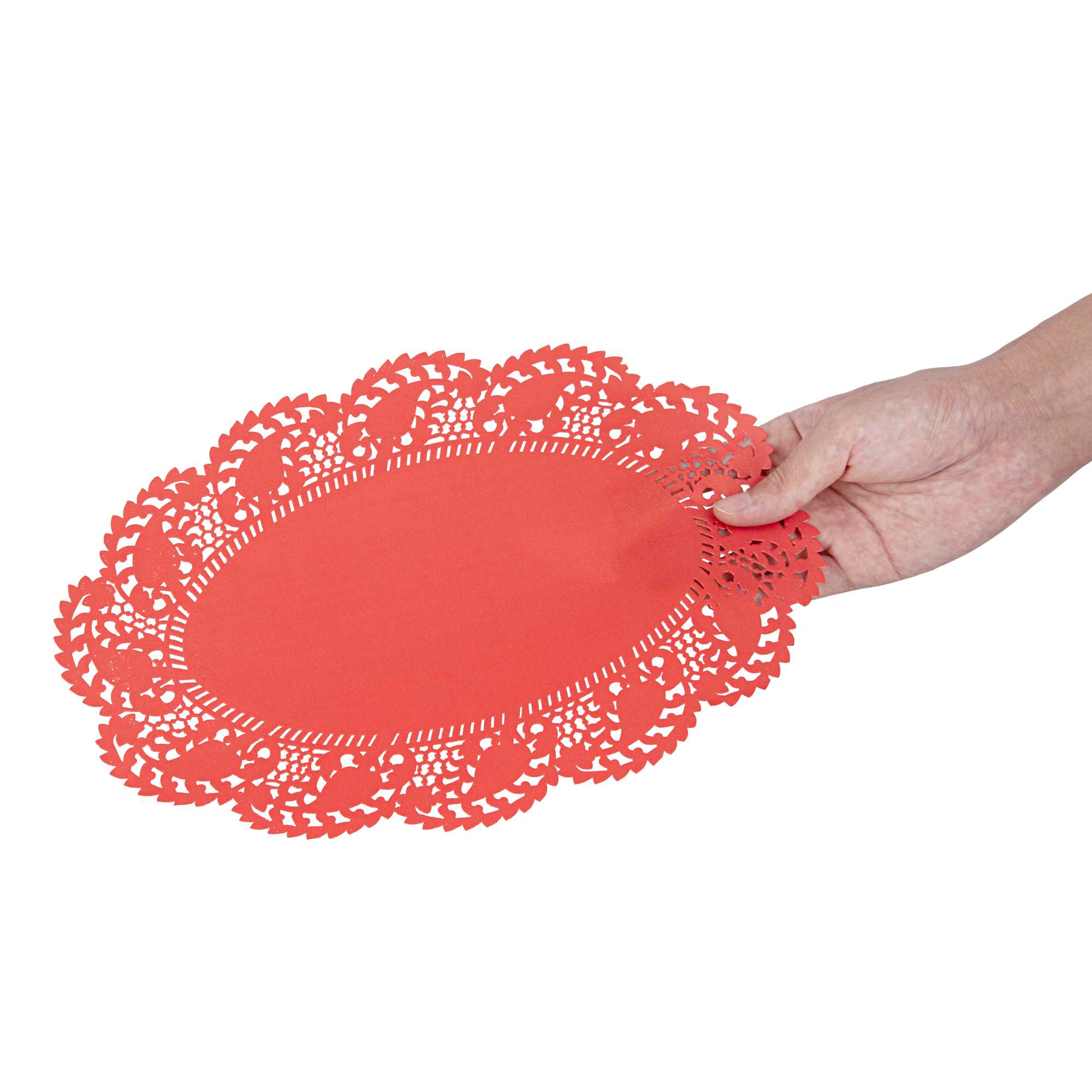 Add an elegant touch to your dessert displays with our Pastry Tek Oval Red Paper Doilies. Crafted from high-quality paper, these lace doilies provide durability while displaying desserts at bakeries or catered luncheons without tearing or losing their structural integrity. Featuring intricate lace-like details, these table doilies increase the visual appeal of food presentations while serving as functional barriers, protecting surfaces, and absorbing moisture. The red colored finish of these paper doilies is versatile, allowing them to complement a wide range of table settings and themes, making them an ideal choice for various events and occasions. Designed for convenience, these disposable doilies eradicate the hassle of post-event cleanup, offering a time-saving solution for busy cafes and food establishments. Perfect for a variety of small treats, these small doilies can be used under cupcakes, petit fours, macarons, and more. Measuring 12.5 inches in length by 8.5 inches in width, these lace doilies fit seamlessly into your food display setups. Sold in a 4,000 count box.