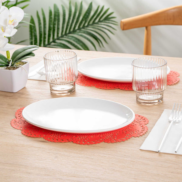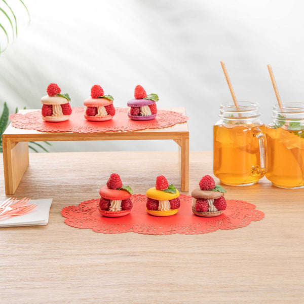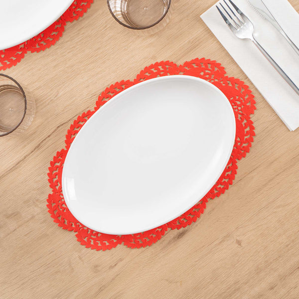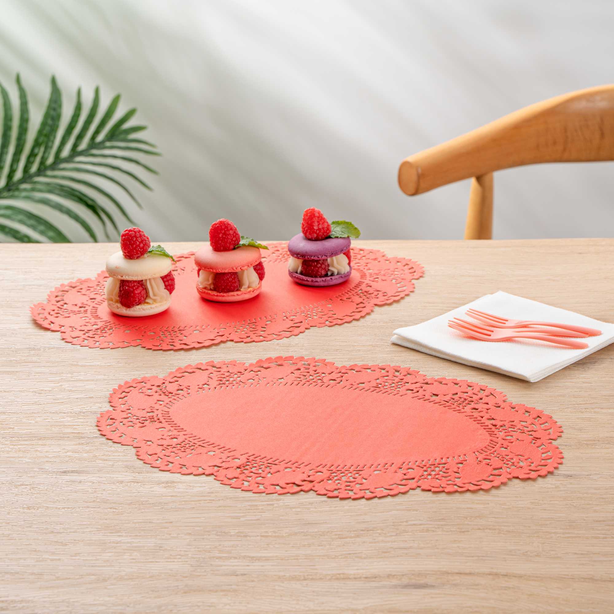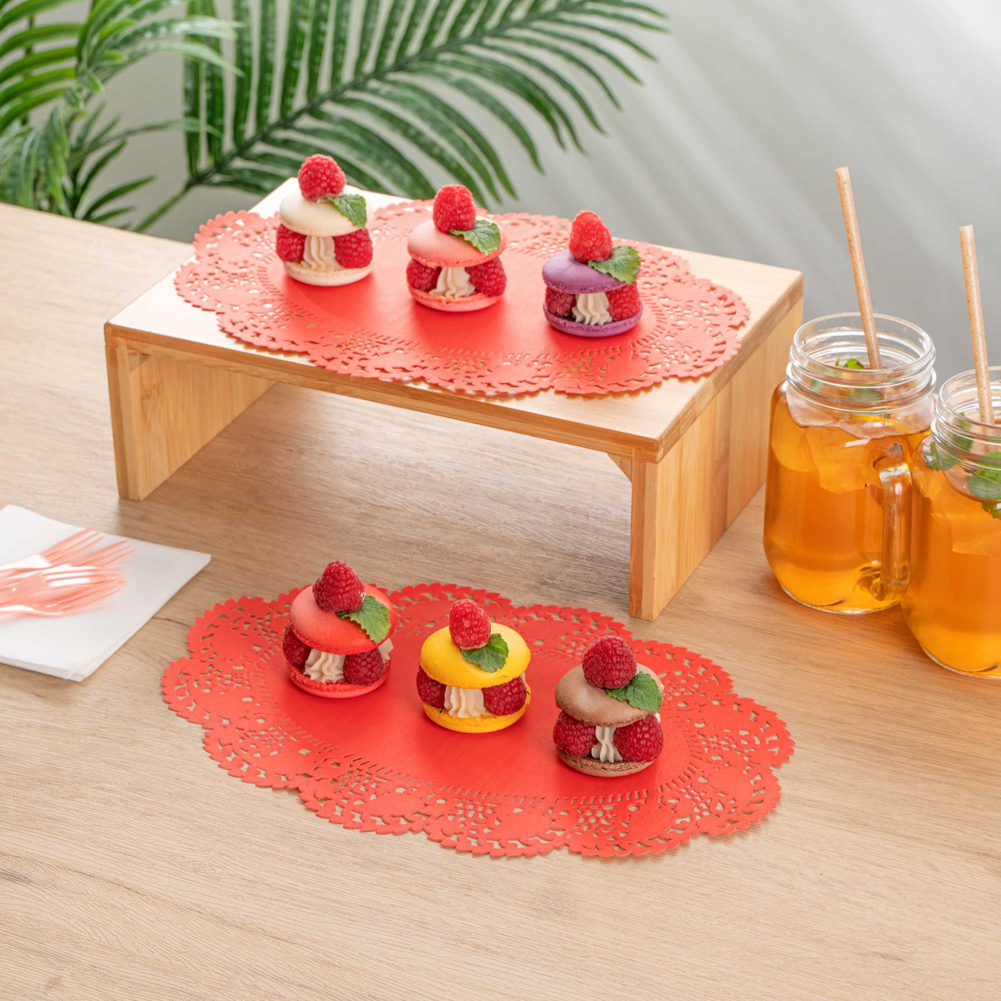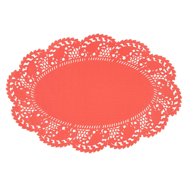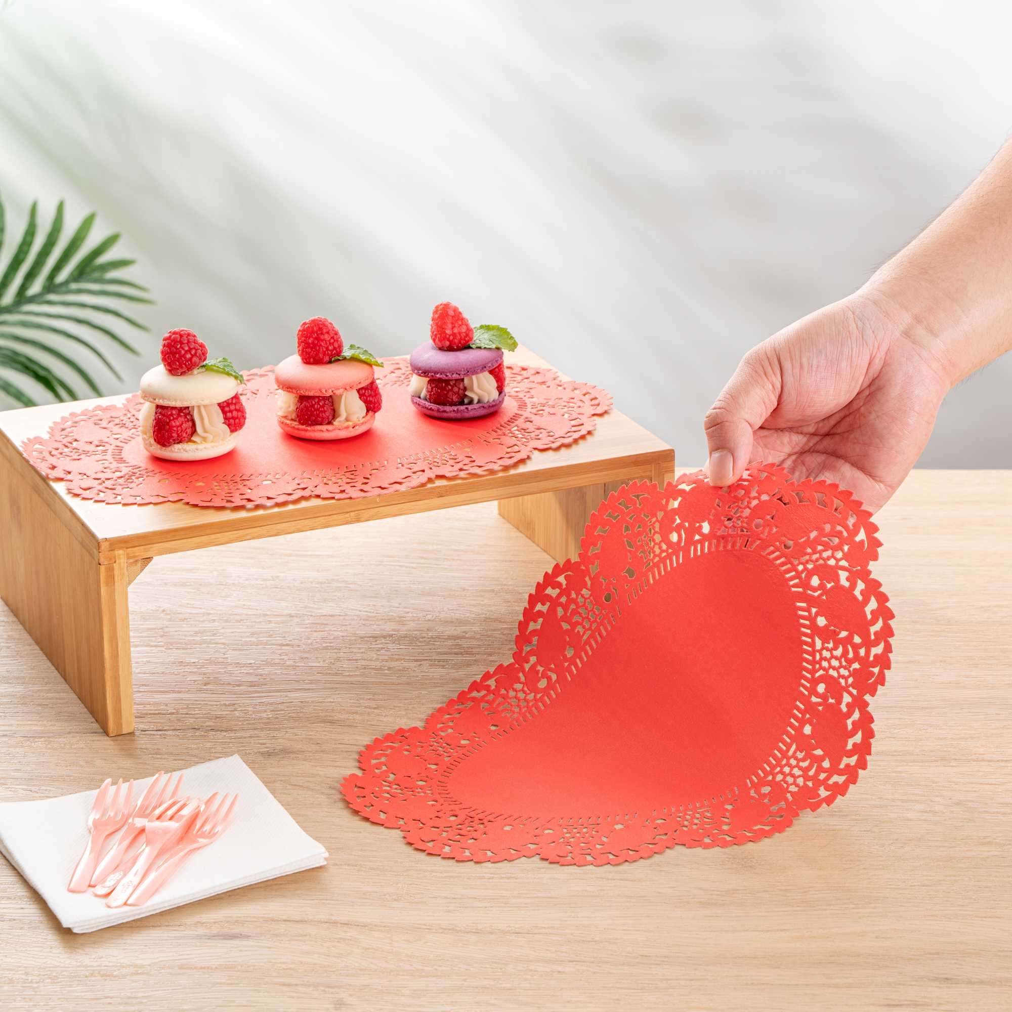 Add an elegant touch to your dessert displays with our Pastry Tek Oval Red Paper Doilies. Crafted from high-quality paper, these lace doilies provide durability while displaying desserts at bakeries or catered luncheons without tearing or losing their structural integrity. Featuring intricate lace-like details, these table doilies increase the visual appeal of food presentations while serving as functional barriers, protecting surfaces, and absorbing moisture. The red colored finish of these paper doilies is versatile, allowing them to complement a wide range of table settings and themes, making them an ideal choice for various events and occasions. Designed for convenience, these disposable doilies eradicate the hassle of post-event cleanup, offering a time-saving solution for busy cafes and food establishments. Perfect for a variety of small treats, these small doilies can be used under cupcakes, petit fours, macarons, and more. Measuring 12.5 inches in length by 8.5 inches in width, these lace doilies fit seamlessly into your food display setups. Sold in a 4,000 count box.