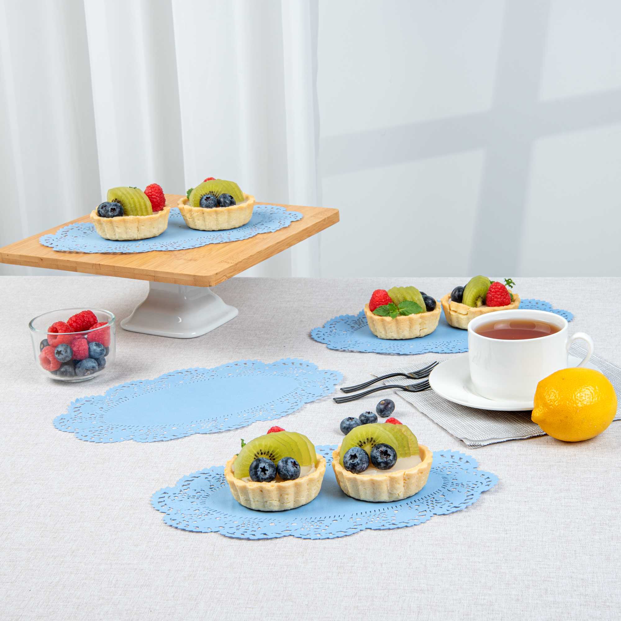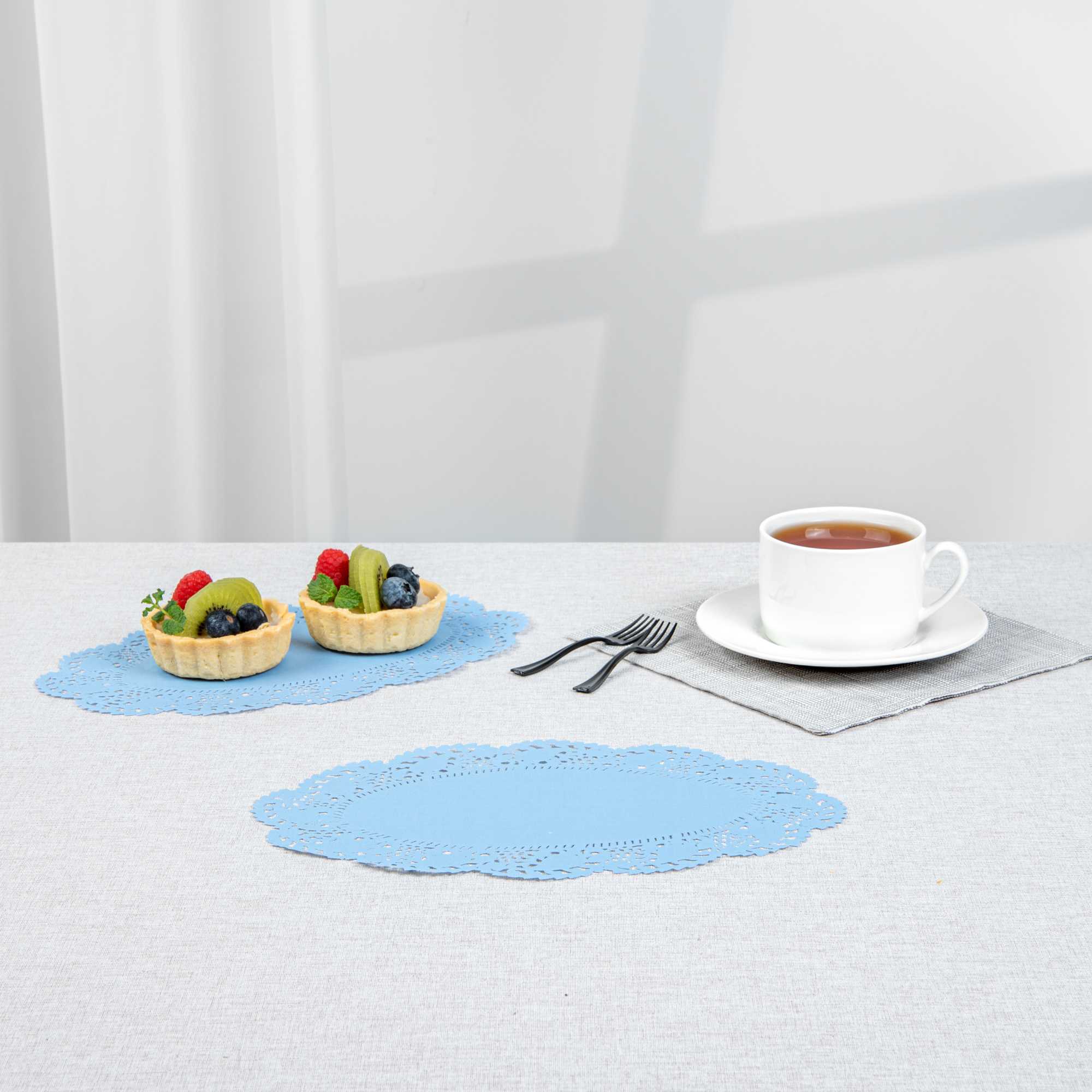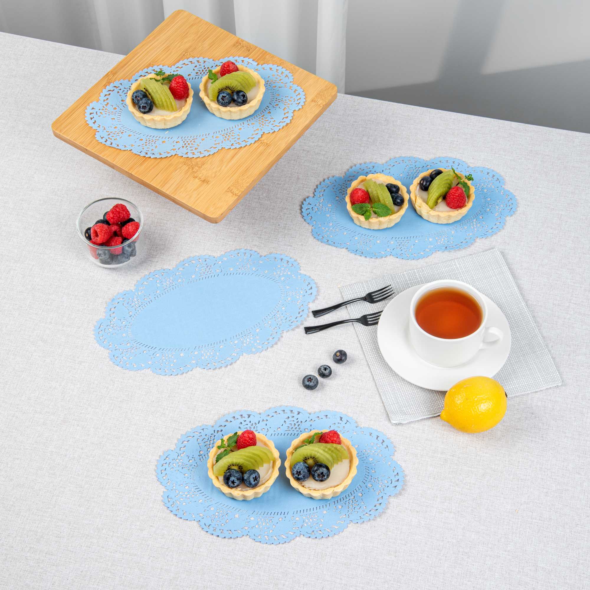 Elevate your dessert displays with our Pastry Tek Oval Sky Blue Paper Doilies, designed to add an elegant touch to any presentation. Crafted from high-quality paper, these lace doilies provide exceptional durability while showcasing desserts at bakeries or catered luncheons without tearing. Featuring intricate lace-like details, these table doilies not only enhance the visual appeal of food presentations but also serve as functional barriers, protecting surfaces and absorbing moisture. The vibrant sky blue finish of these colored paper doilies complements a wide range of table settings and themes, making them ideal for various events and occasions. Disposable by design, these small doilies eradicate the hassle of post-event cleanup, offering a convenient and time-saving solution for busy events and food establishments. Perfect for use under cupcakes, petit fours, macarons, and other small treats, these lace doilies measure 10.5 inches in length by 6.5 inches in width. Sold in a 100 count box.