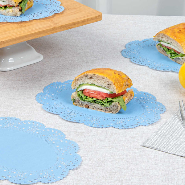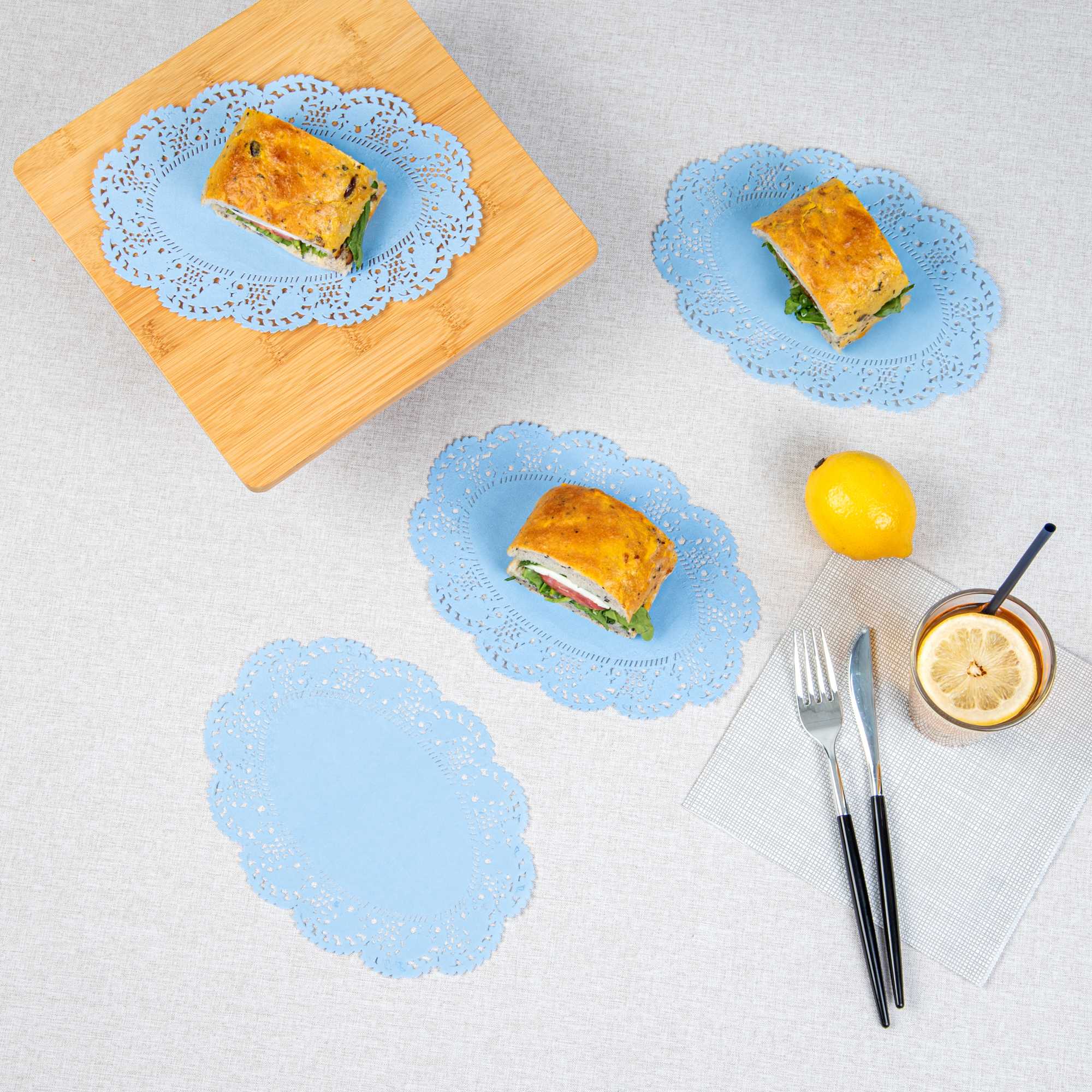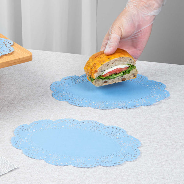 Add an elegant touch to your dessert displays with our Pastry Tek Oval Sky Blue Paper Doilies. Crafted from high-quality paper, these lace doilies provide durability while displaying desserts at bakeries without tearing or losing their structural integrity. Lace-like details increase the visual appeal of food presentations while serving as functional barriers, protecting surfaces, and absorbing moisture. The sky blue finish of these colored paper doilies is versatile, allowing them to complement a wide range of table settings and themes, making them an ideal choice for various events and occasions. Disposable design eradicates the hassle of post-event cleanup, offering a convenient and time-saving solution for busy cafes and food establishments. These small doilies can be used under cupcakes, petit fours, macarons, and other small treats, making them perfect for a variety of uses. Measuring 9 inches in length by 6.5 inches in width, these table doilies fit perfectly under a range of baked goods. Sold in a 4,000 count box.