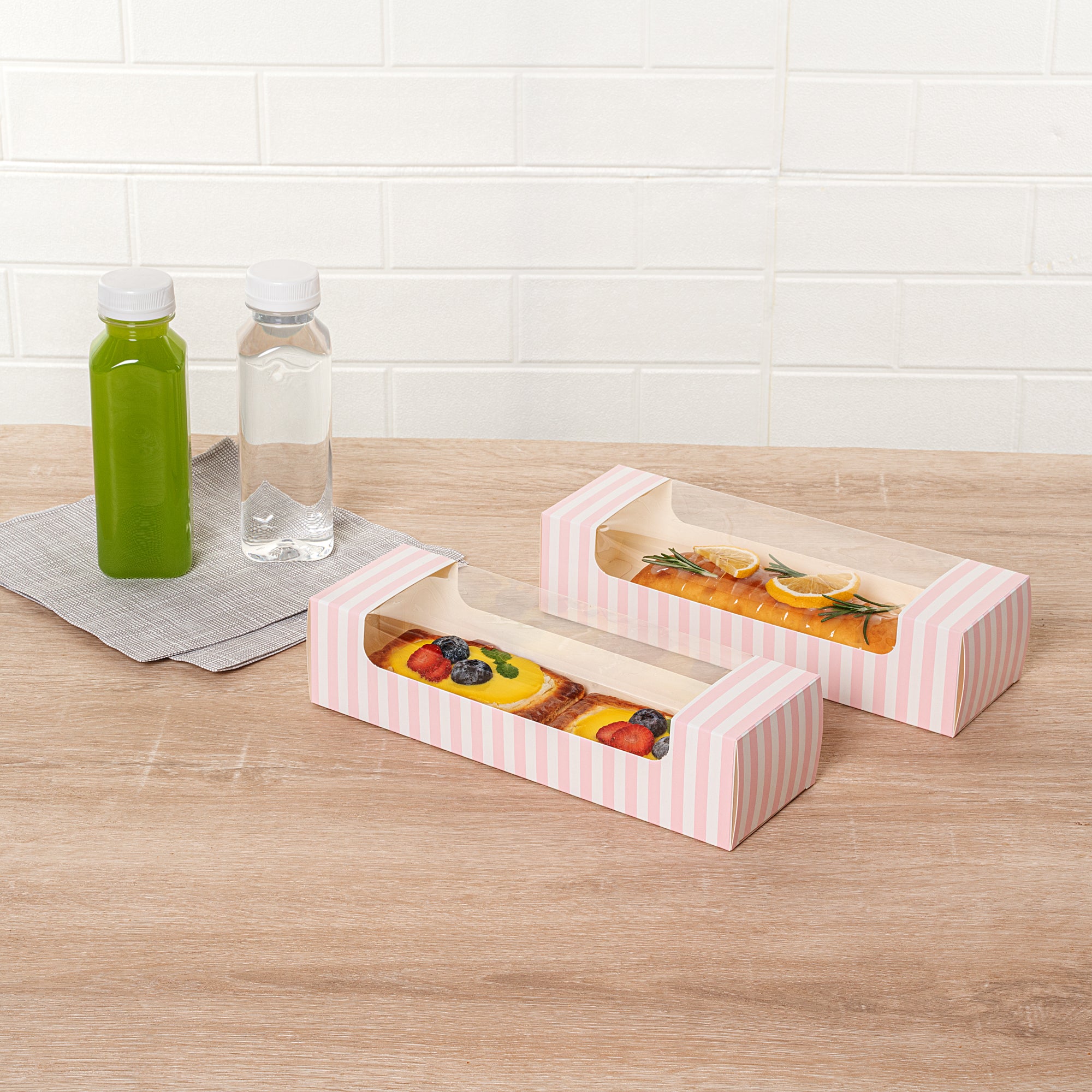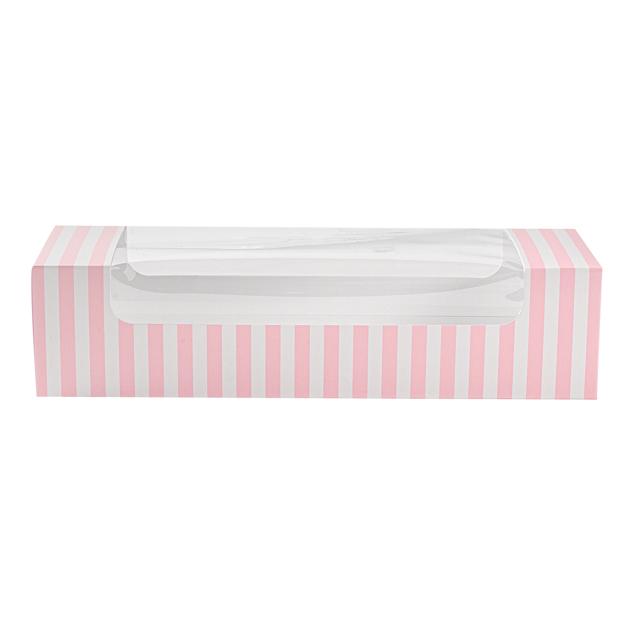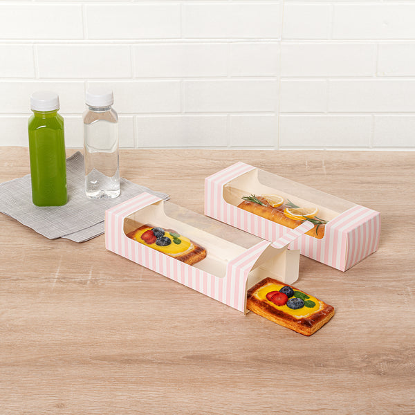 Present your delightful treats in a stylish manner with our Pastry Tek Pink and White Stripe Paper Pastry / Cake Boxes. Featuring a transparent window, these bakery boxes deliver superior visibility, enabling efficient display and effortless identification of desserts. Designed with grease-resistant properties, these pastry boxes ensure that oil leakage is a concern of the past. The recyclable nature of these pink and White striped paper cake boxes provides an easy solution to minimize waste in your establishment. With a charming striped design, these cake boxes elevate the presentation of your baked goods. Conveniently shipped flat, these treat boxes save storage space and simplify assembly. Each paper treat box measures 9.75 inches in length by 3.25 inches in width by 2.25 inches in height. Sold in a 100 count box.