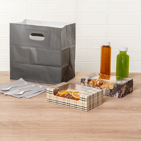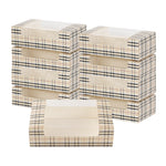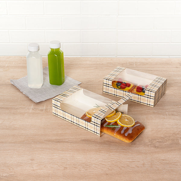 Enhance the appeal of your baked delights with our Pastry Tek Plaid Paper Pastry / Cake Boxes. With a built-in clear window, these bakery boxes offer superior visibility for easy dessert identification and elegant presentation. The grease-resistant features of these pastry boxes ensure that they remain clean and devoid of oil stains. The classic plaid design of these cake boxes contributes an air of sophistication to your dessert ensemble. Conveniently delivered flat, these cupcake boxes are space-saving and easy to assemble. Each plaid pastry box measures 7.75 inches in length by 4.75 inches in width by 2.25 inches in height. Sold in a 100 count box.