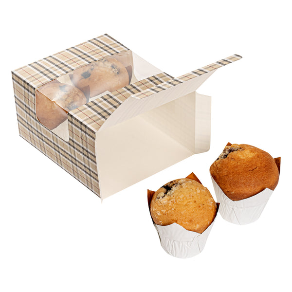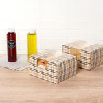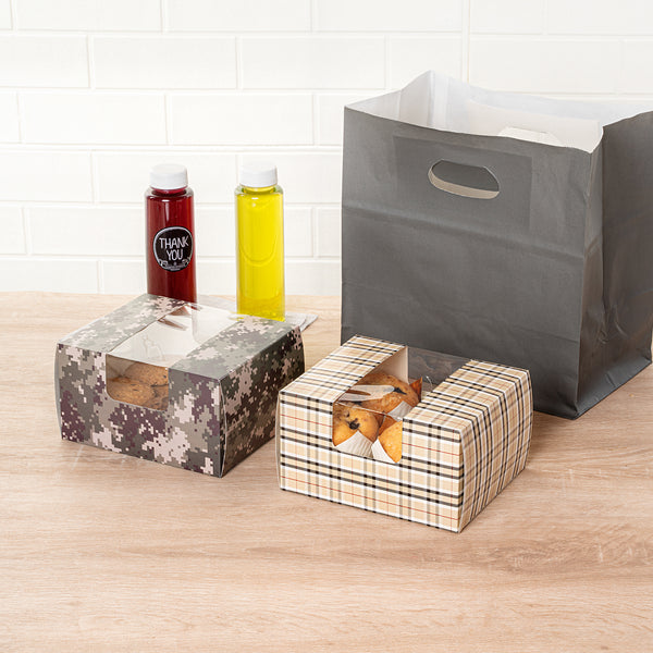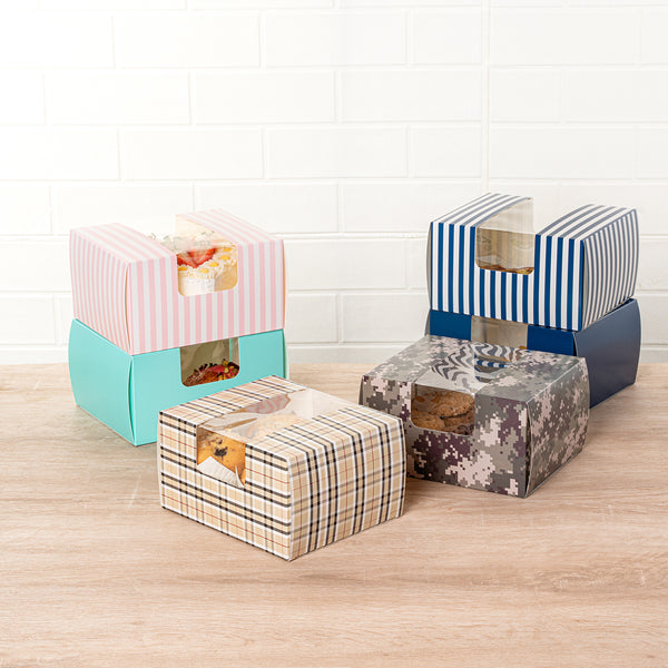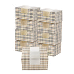 Demonstrate the appeal of your baked goods elegantly using our Pastry Tek Plaid Paper Pastry / Cake Boxes. Equipped with a clear see-through window, these unique bakery boxes provide excellent visibility, allowing efficient showcasing and easy identification of your baked delights. These plaid boxes are grease-resistant, designed to prevent oily residue from seeping through. These pastry boxes are recyclable, providing a straightforward way to decrease waste in your bakery. These treat boxes feature a classic plaid design, lending a refined aesthetic that brings attention to the encased treats. Shipped flat to minimize storage space, these disposable cake boxes are easy to assemble when needed. Each paper pastry box measures 7 inches in length by 6 inches in width by 4 inches in height. Sold in a 100 count box