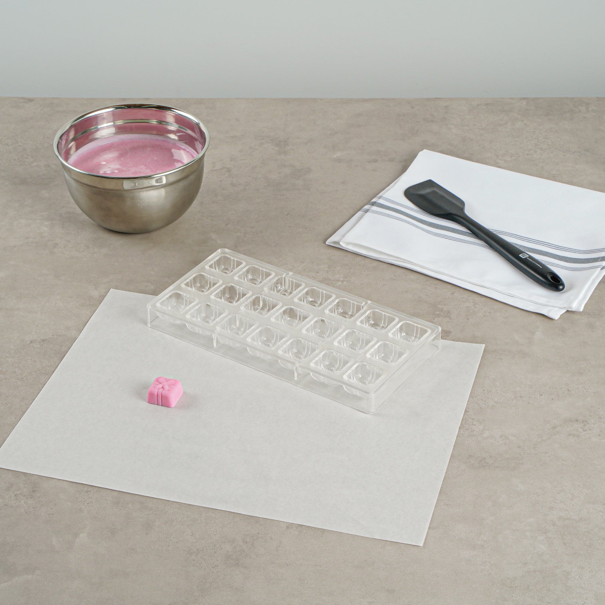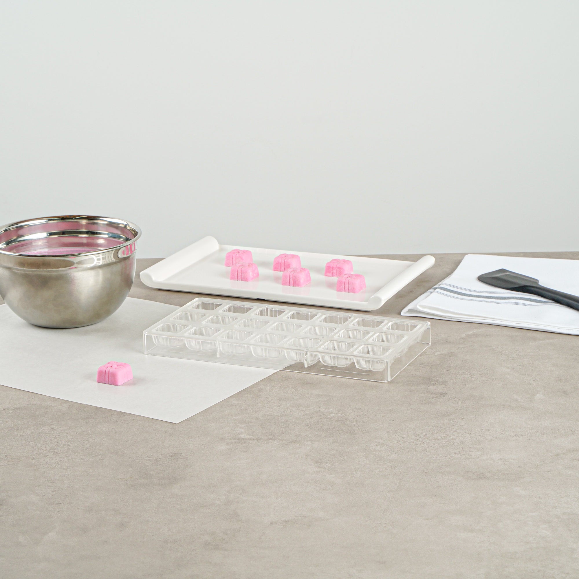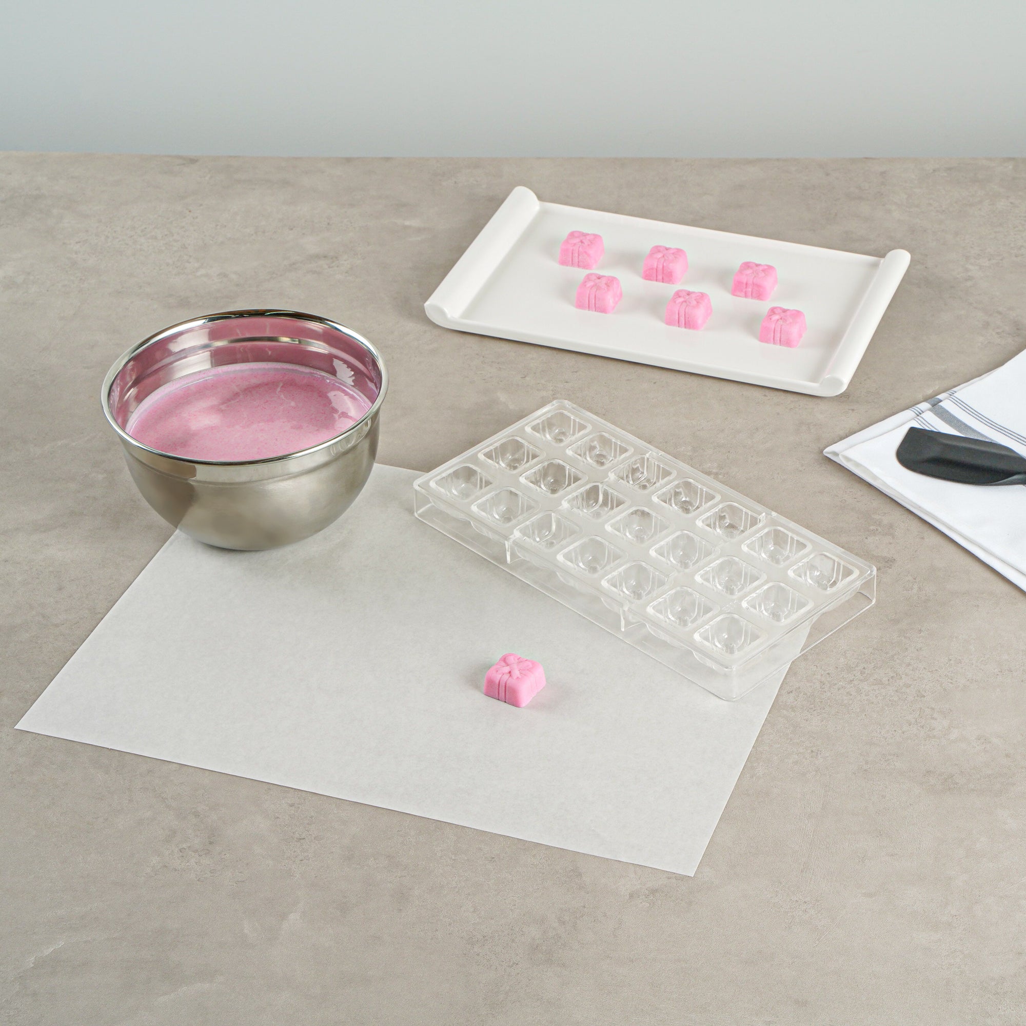 Create intricate and appealing confectioneries with our Pastry Tek Polycarbonate Gift Box Candy / Chocolate Molds. Crafted from durable polycarbonate, these clear molds are designed to withstand long-term use without cracking, making them a must-have for any commercial kitchen. With 21 compartments, these chocolate molds allow you to create a variety of chocolates and candies. The clear finish of these rectangle candy molds lets you easily monitor the molding process, ensuring that each candy or chocolate piece turns out perfectly. Ideal for busy bakeries, caterers, and restaurants, these polycarbonate chocolate molds are freezer-safe, allowing you to quickly cool and set your candies. These candy bar molds are dishwasher-safe, simplifying cleanup after a bustling day of candy creation. Measuring 10.75 inches in length by 5.25 inches in width, these clear candy molds ensure you have plenty of space to shape your sweet creations. Each cavity of these mold trays measures 1.1 inches in diameter by 0.6 inches in depth. Sold in a 10 count box.