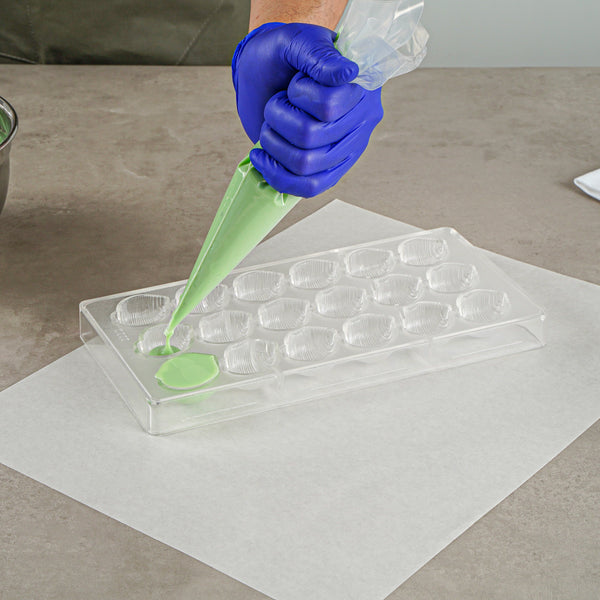 Add a touch of oceanic charm to your confections with our Pastry Tek Polycarbonate Sea Shell Candy / Chocolate Mold. Designed with 18 compartments, this rectangle chocolate mold allows you to craft intricate and realistic sea shell-shaped candies or chocolates with ease. The clear finish of this candy mold provides a sleek appearance and enables you to effortlessly monitor the molding process. This polycarbonate chocolate mold is freezer-safe and dishwasher-safe, making it a versatile and convenient addition to any bakery, restaurant, or bistro. Made from durable polycarbonate material, this clear mold is designed to withstand repeated use without cracking, ensuring its longevity in your commercial kitchen. This gummy mold is perfect for creating unique and eye-catching confections that will enthrall your customers. Each compartment in this candy mold measures 1.3 inches in length by 1.7 inches in width by 0.8 inches in height. Measuring 10.75 inches in length by 5.25 inches in width, this candy bar mold is compact enough to fit comfortably in your workspace while still producing a significant amount of product. Sold in a 1 count box.
