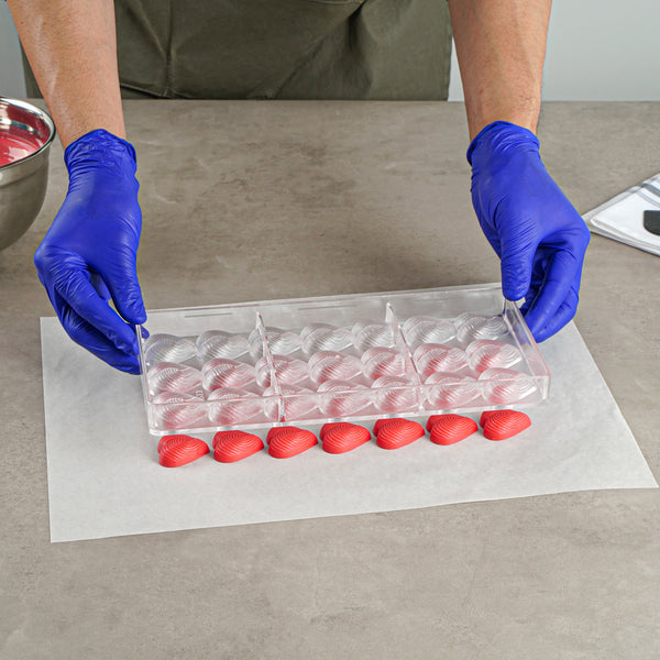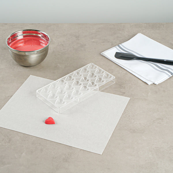 Experience the joy of creating delightful sweets with our Pastry Tek Polycarbonate Thread Heart Candy / Chocolate Mold. This 21-compartment rectangle chocolate mold is ideal for crafting delectable heart-shaped chocolates or candies, adding a touch of love and creativity to your culinary creations. The clear finish of this candy mold allows you to easily monitor the molding process, ensuring perfect results every time. This polycarbonate chocolate mold is freezer-safe, enabling you to create a variety of frozen treats effortlessly. For a hassle-free cleanup, this clear candy mold is dishwasher-safe. The durable construction of this candy bar mold is ideal for long-term use, resisting cracks and wear that can compromise your creations. Each compartment in these heart candy molds measures 1.3 inches in diameter by 0.5 inches in height. This polycarbonate candy mold measures 10.75 inches long by 5.25 inches wide. Sold in a 1 count box.
