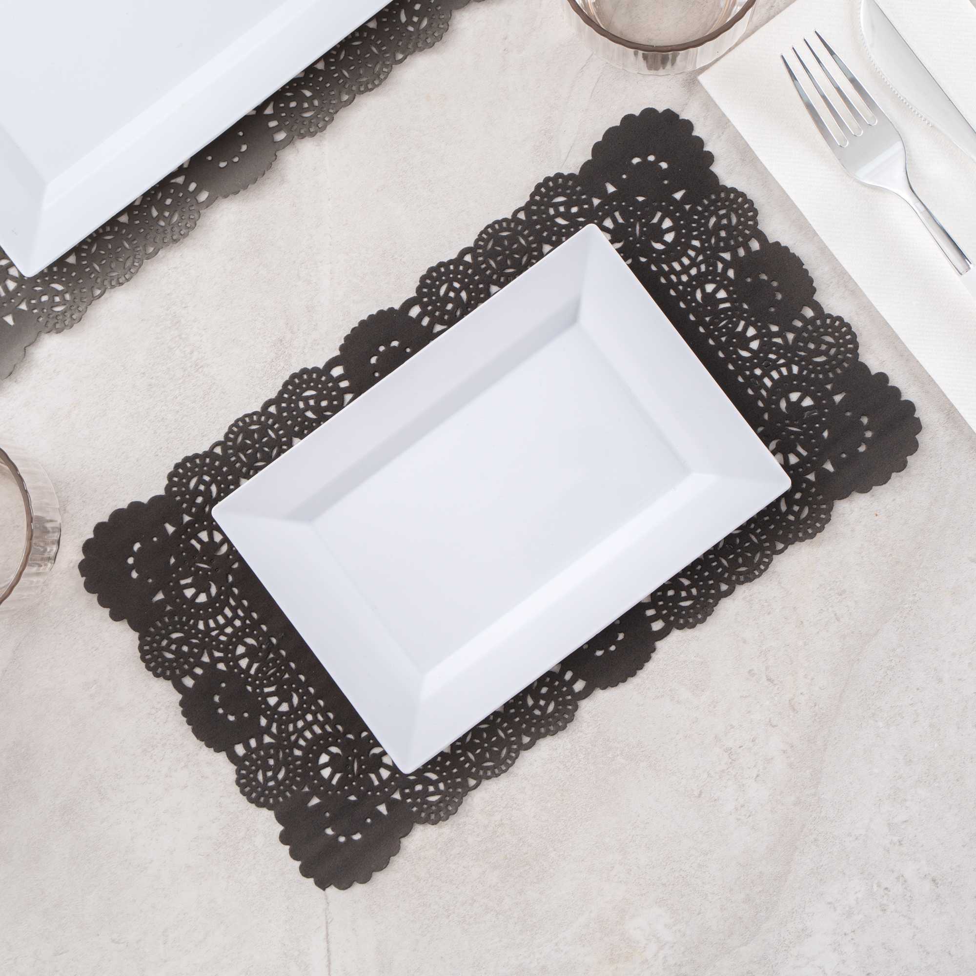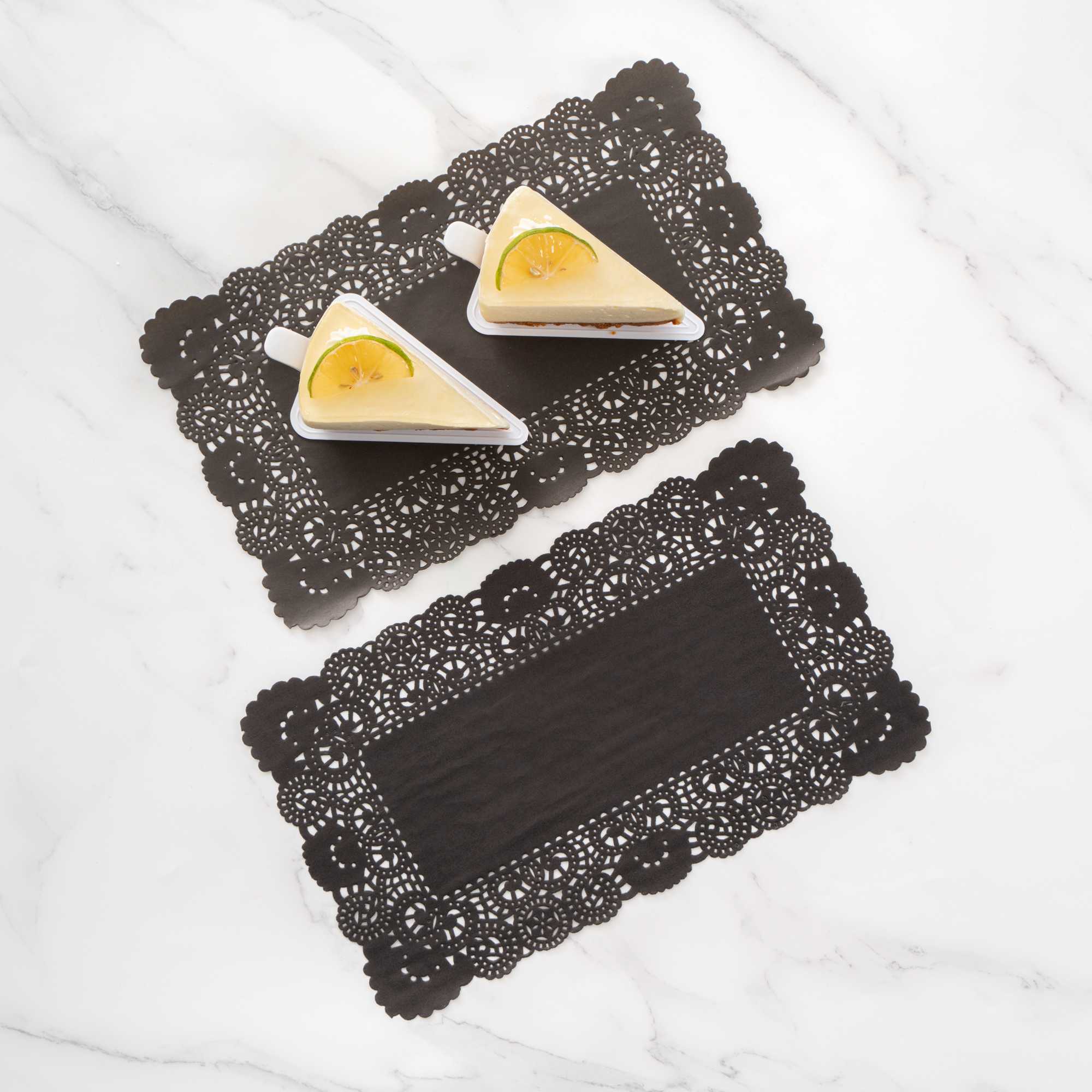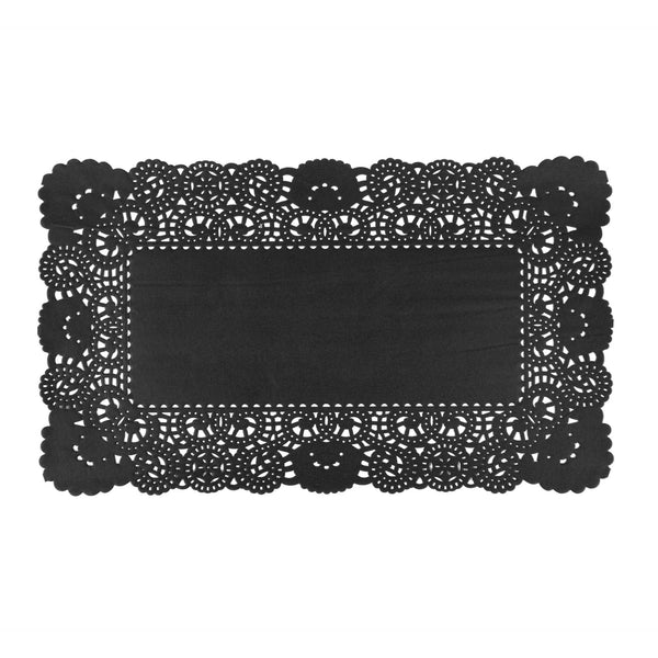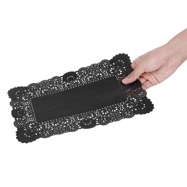 Elevate your dessert displays with our Pastry Tek Rectangle Black Paper Doilies, perfect for adding an elegant touch to any presentation. Crafted from high-quality paper, these durable lace doilies allow you to showcase desserts at bakeries or catered luncheons without tearing or losing their structural integrity. Featuring intricate lace-like details, these table doilies increase the visual appeal of food presentations while serving as functional barriers, protecting surfaces and absorbing moisture. The black colored finish of these paper doilies complements a wide range of table settings and themes, making them an ideal choice for various events and occasions. Designed for convenience, these disposable doilies eradicate the hassle of post-event cleanup, offering a time-saving solution for busy hosts and food establishments. These small doilies are perfect for placing under cupcakes, petit fours, macarons, and other small treats. Measuring 12 inches in length by 7 inches in width, these lace doilies fit seamlessly into any display setup. Sold in a 100 count box.