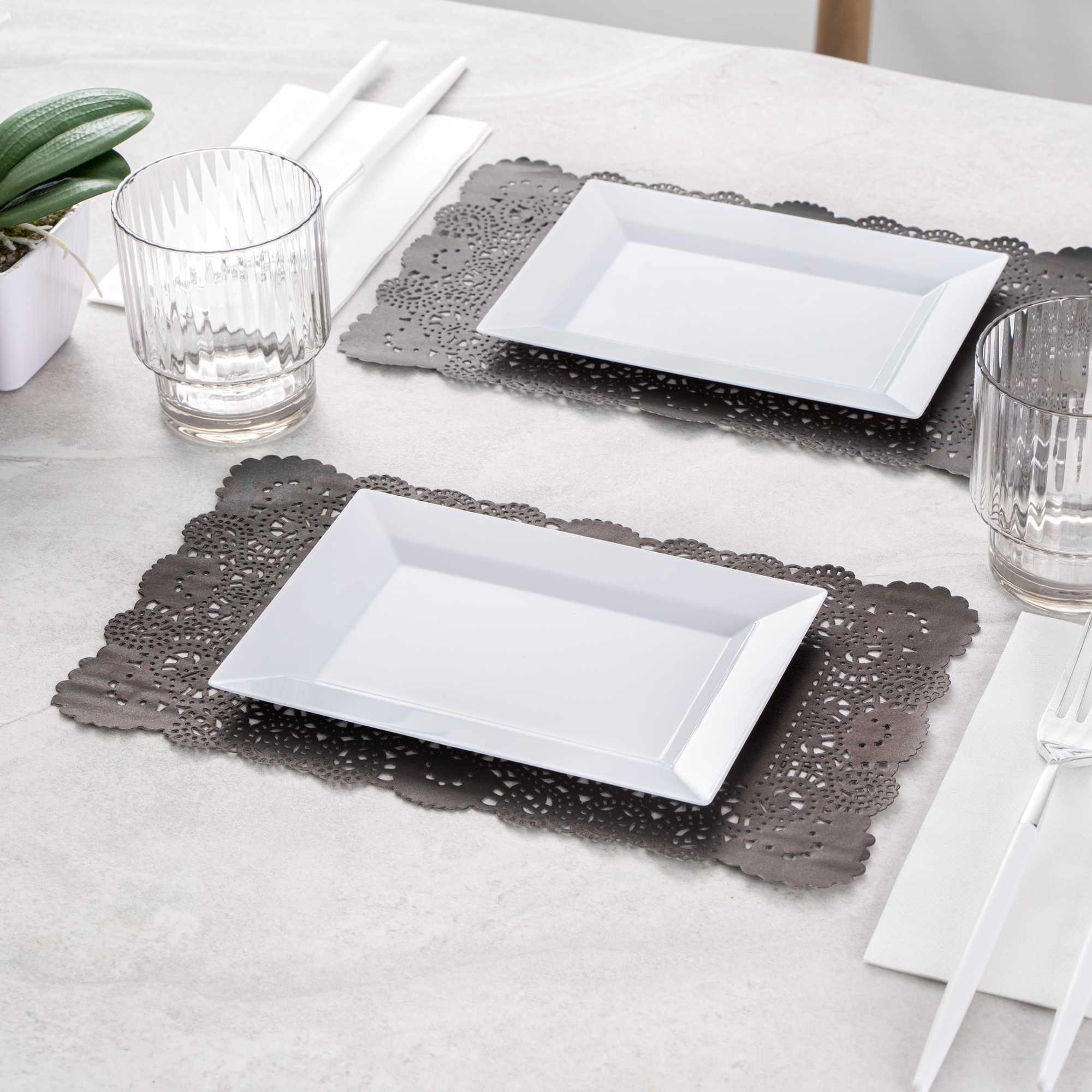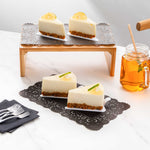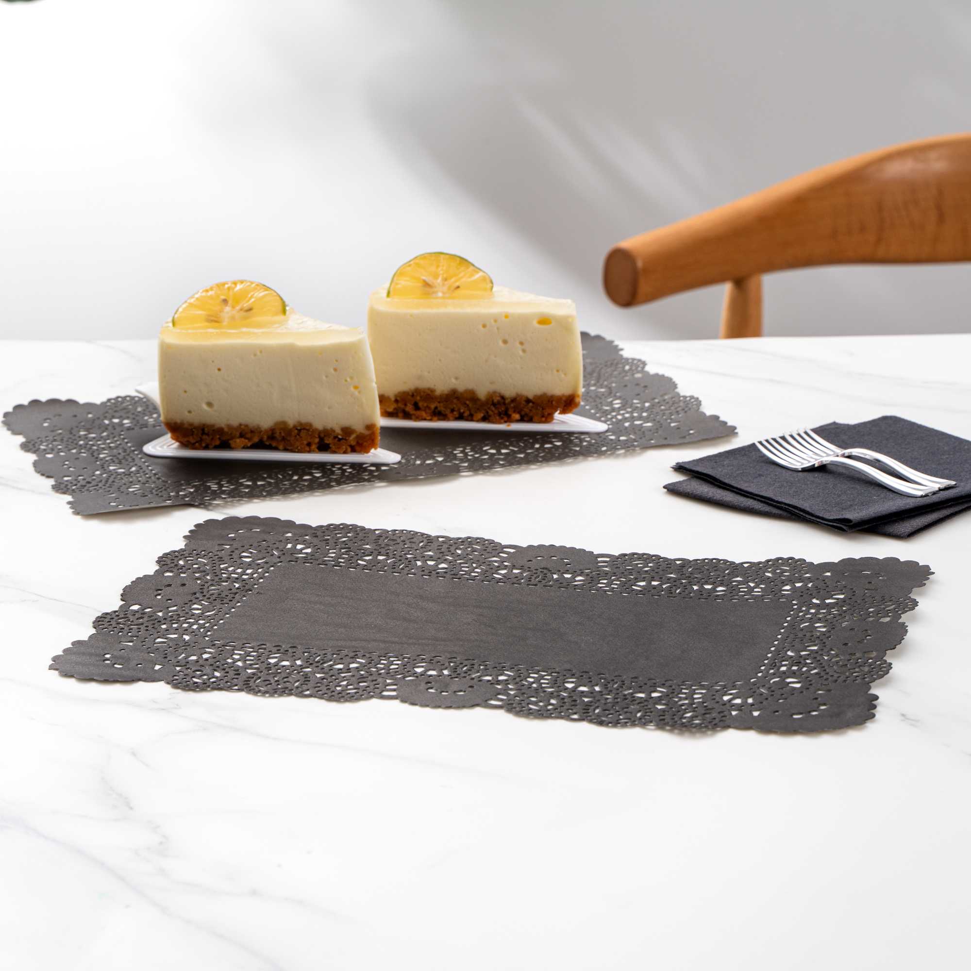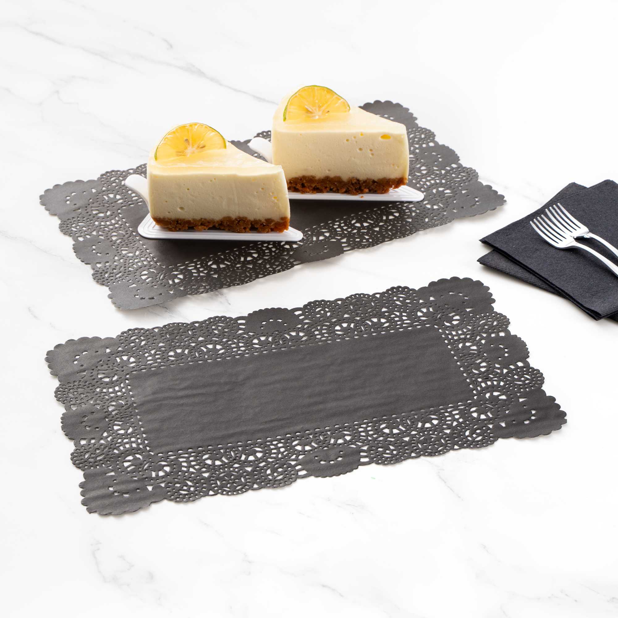 Elevate your dessert displays with our Pastry Tek Rectangle Black Paper Doilies, perfect for adding an elegant touch to any presentation. Crafted from high-quality paper, these durable lace doilies allow you to showcase desserts at bakeries or catered luncheons without tearing or losing their structural integrity. Featuring intricate lace-like details, these table doilies increase the visual appeal of food presentations while serving as functional barriers, protecting surfaces and absorbing moisture. The black colored finish of these paper doilies complements a wide range of table settings and themes, making them an ideal choice for various events and occasions. Designed for convenience, these disposable doilies eradicate the hassle of post-event cleanup, offering a time-saving solution for busy hosts and food establishments. These small doilies are perfect for placing under cupcakes, petit fours, macarons, and other small treats. Measuring 12 inches in length by 7 inches in width, these lace doilies fit seamlessly into any display setup. Sold in a 100 count box.
