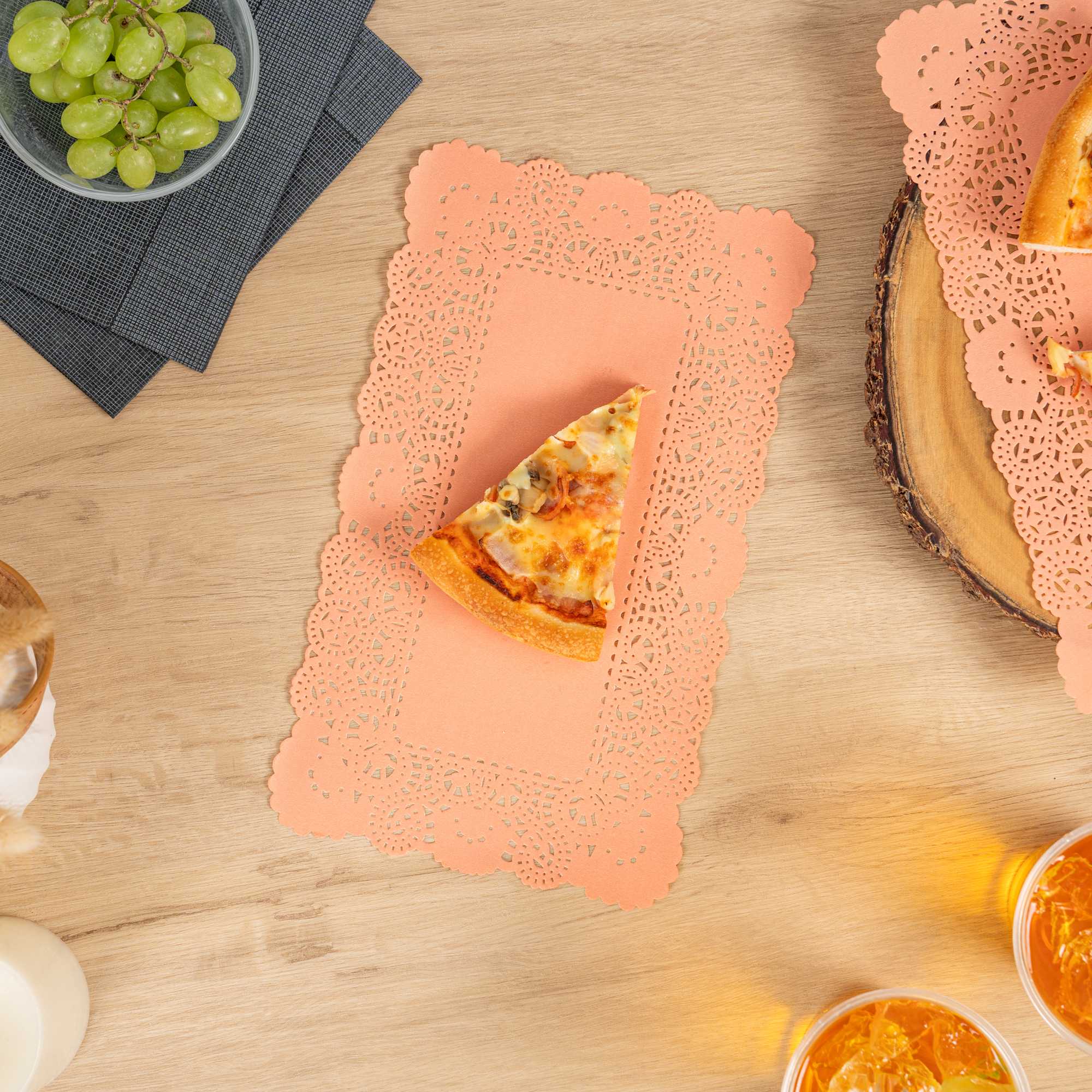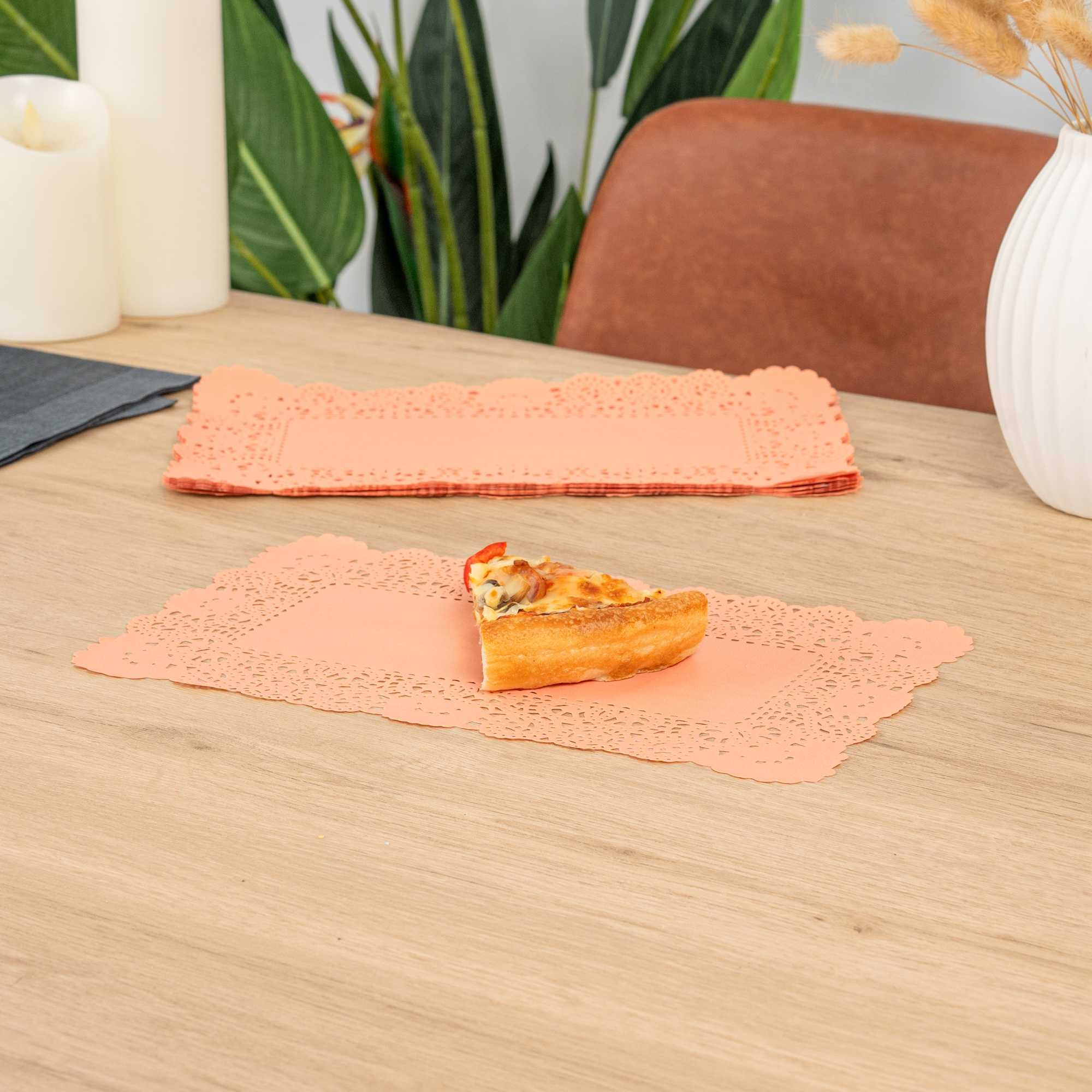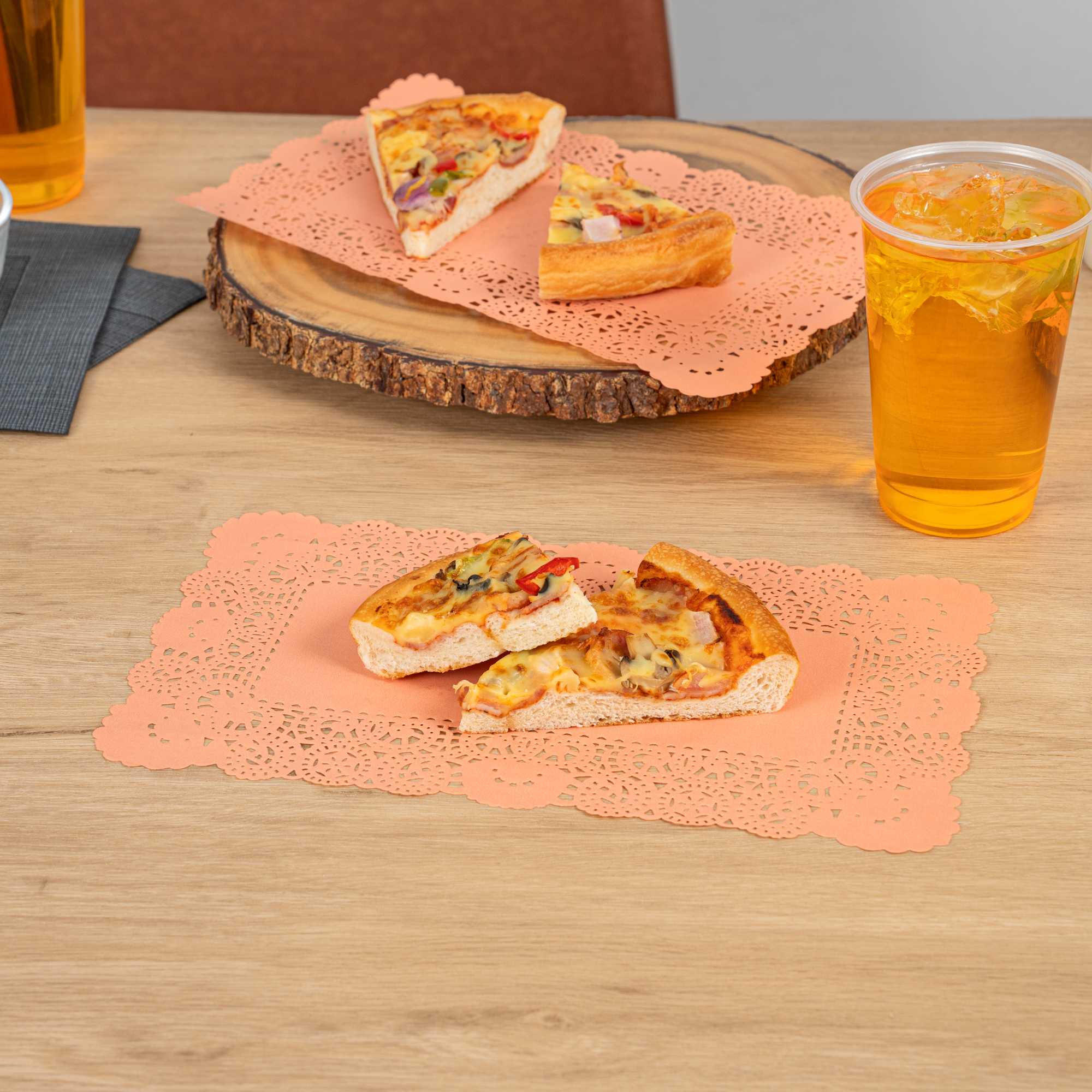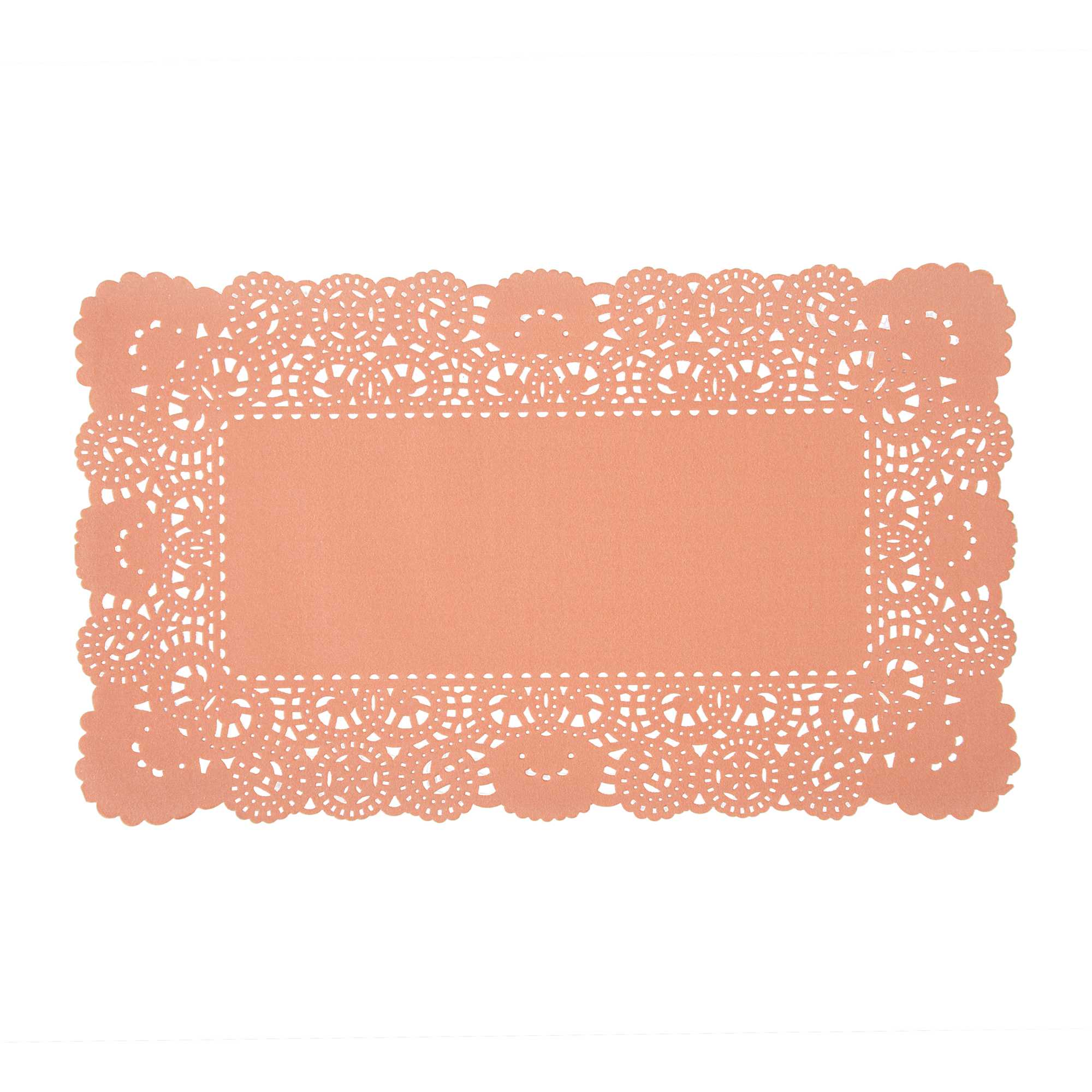 Elevate your dessert displays with our Pastry Tek Rectangle Coral Paper Doilies. Crafted from high-quality paper, these lace doilies provide durability while showcasing desserts at bakeries or catered luncheons without tearing or losing their structural integrity. Additionally, these paper doilies feature intricate lace-like details that enhance the visual appeal of your food presentations while serving as functional barriers, protecting surfaces and absorbing moisture. The coral colored finish of these table doilies allows them to complement a wide range of table settings and themes, making them an ideal choice for various events and occasions. Conveniently, these small doilies are disposable to eradicate the hassle of post-event cleanup, offering a time-saving solution for busy hosts and food establishments. Perfect for use under cupcakes, petit fours, macarons, and other small treats, these colored paper doilies measure 12 inches in length by 7 inches in width. Sold in a 100 count box.