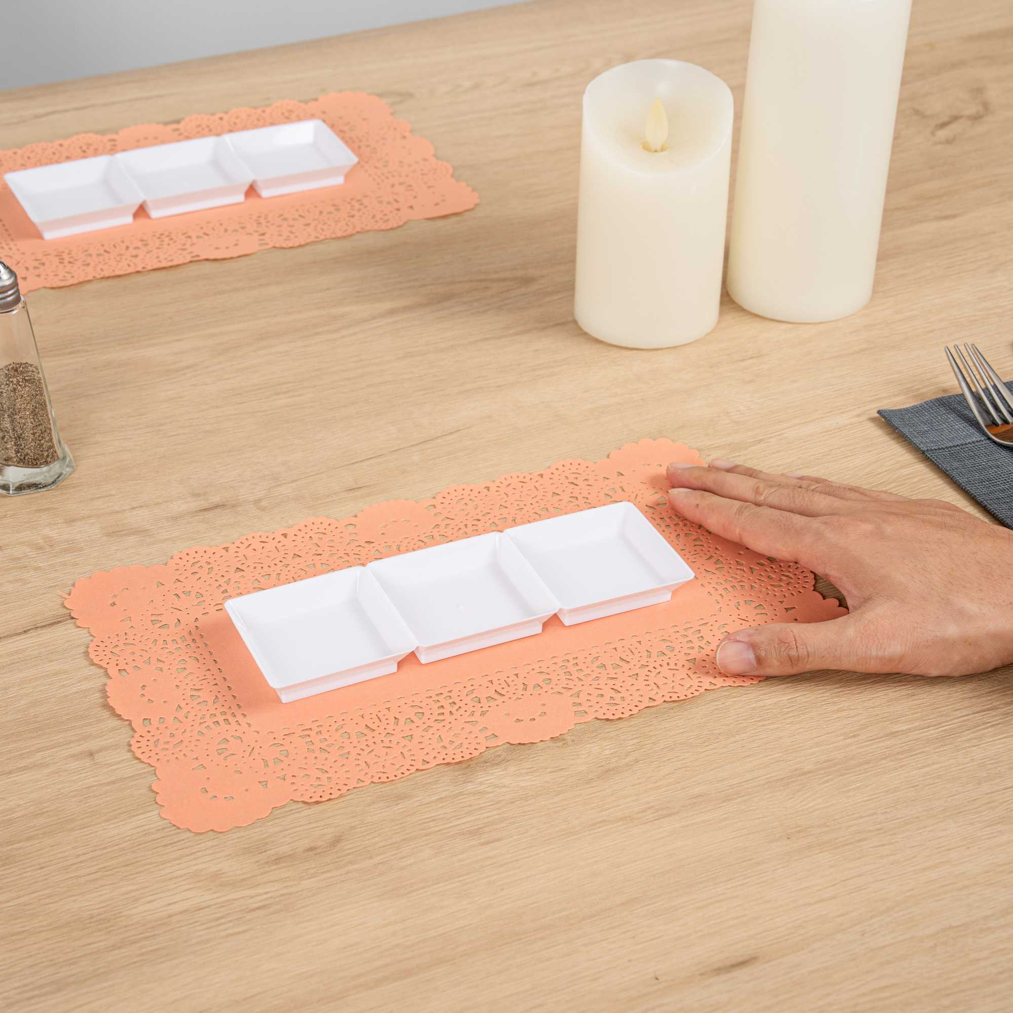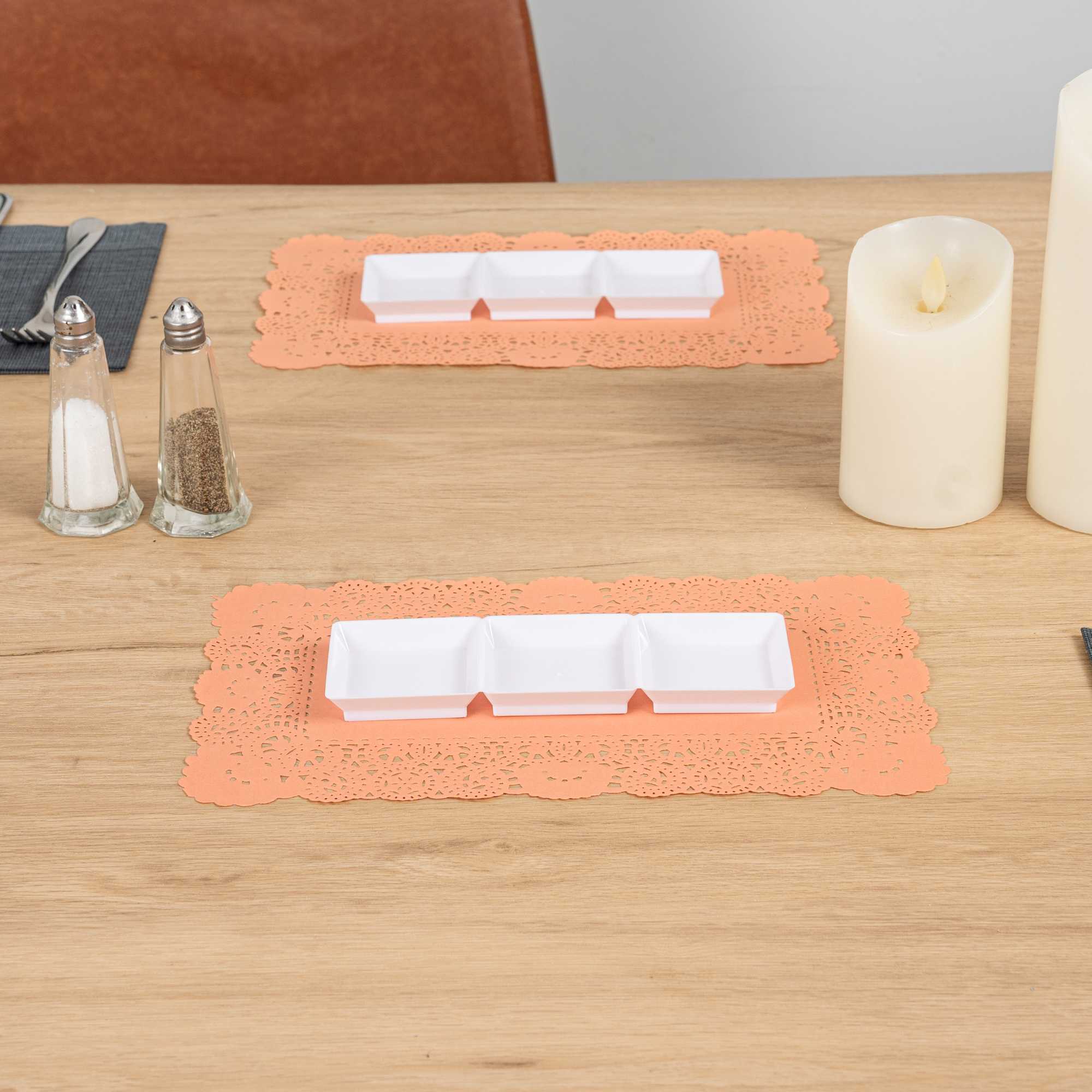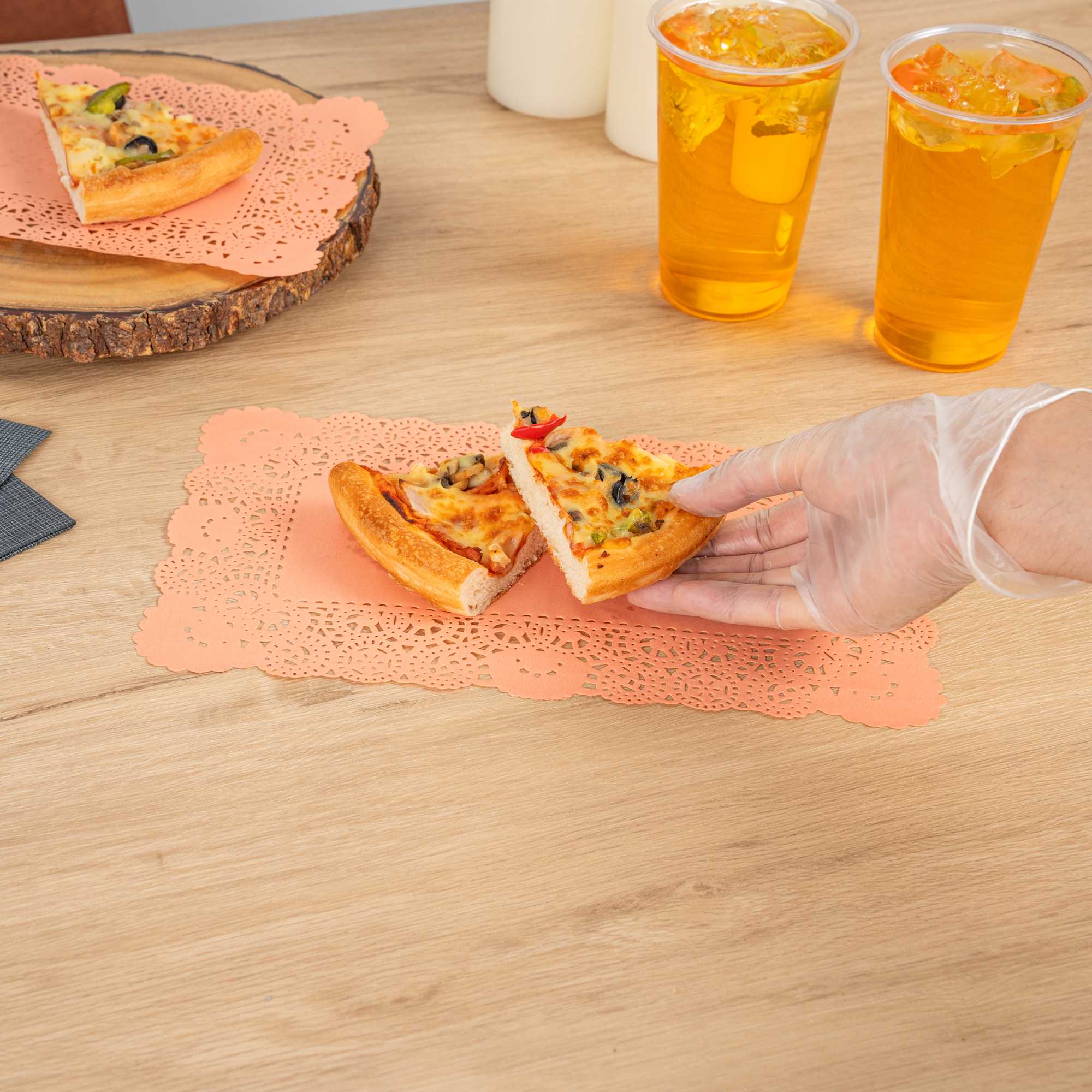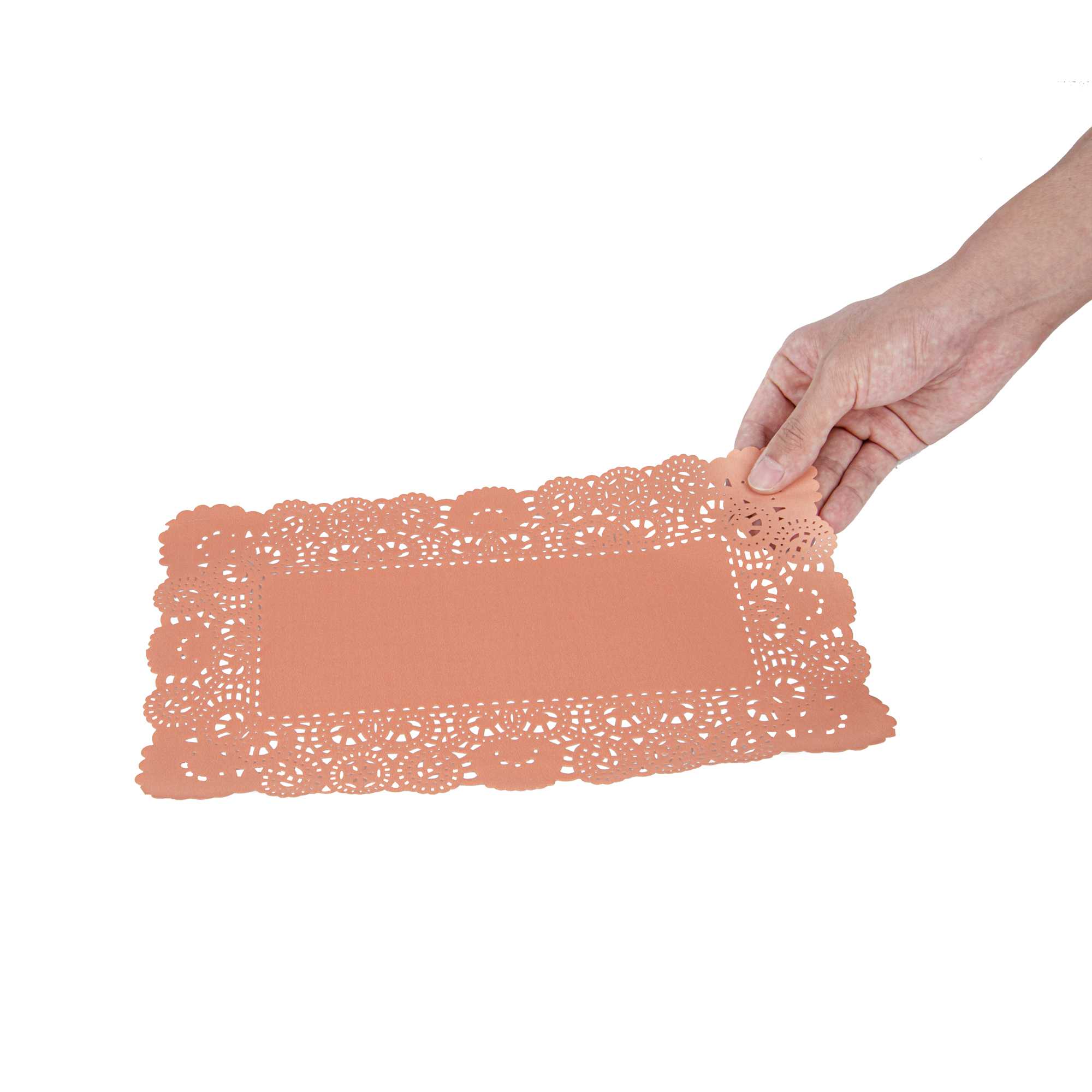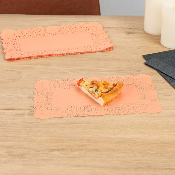 Elevate your dessert displays with our Pastry Tek Rectangle Coral Paper Doilies. Crafted from high-quality paper, these lace doilies provide durability while showcasing desserts at bakeries or catered luncheons without tearing or losing their structural integrity. Additionally, these paper doilies feature intricate lace-like details that enhance the visual appeal of your food presentations while serving as functional barriers, protecting surfaces and absorbing moisture. The coral colored finish of these table doilies allows them to complement a wide range of table settings and themes, making them an ideal choice for various events and occasions. Conveniently, these small doilies are disposable to eradicate the hassle of post-event cleanup, offering a time-saving solution for busy hosts and food establishments. Perfect for use under cupcakes, petit fours, macarons, and other small treats, these colored paper doilies measure 12 inches in length by 7 inches in width. Sold in a 100 count box.