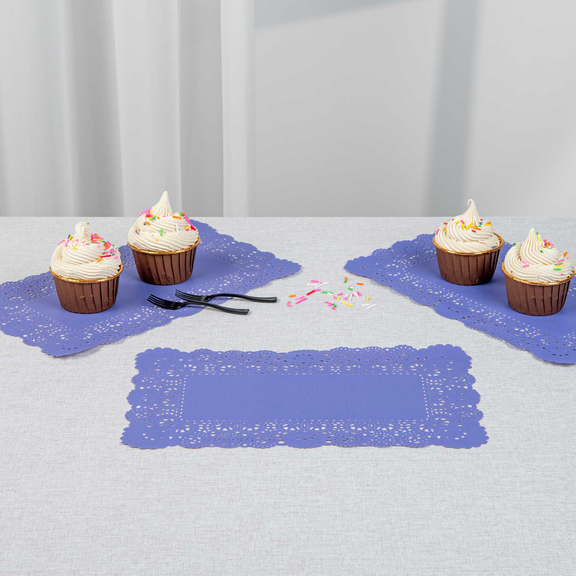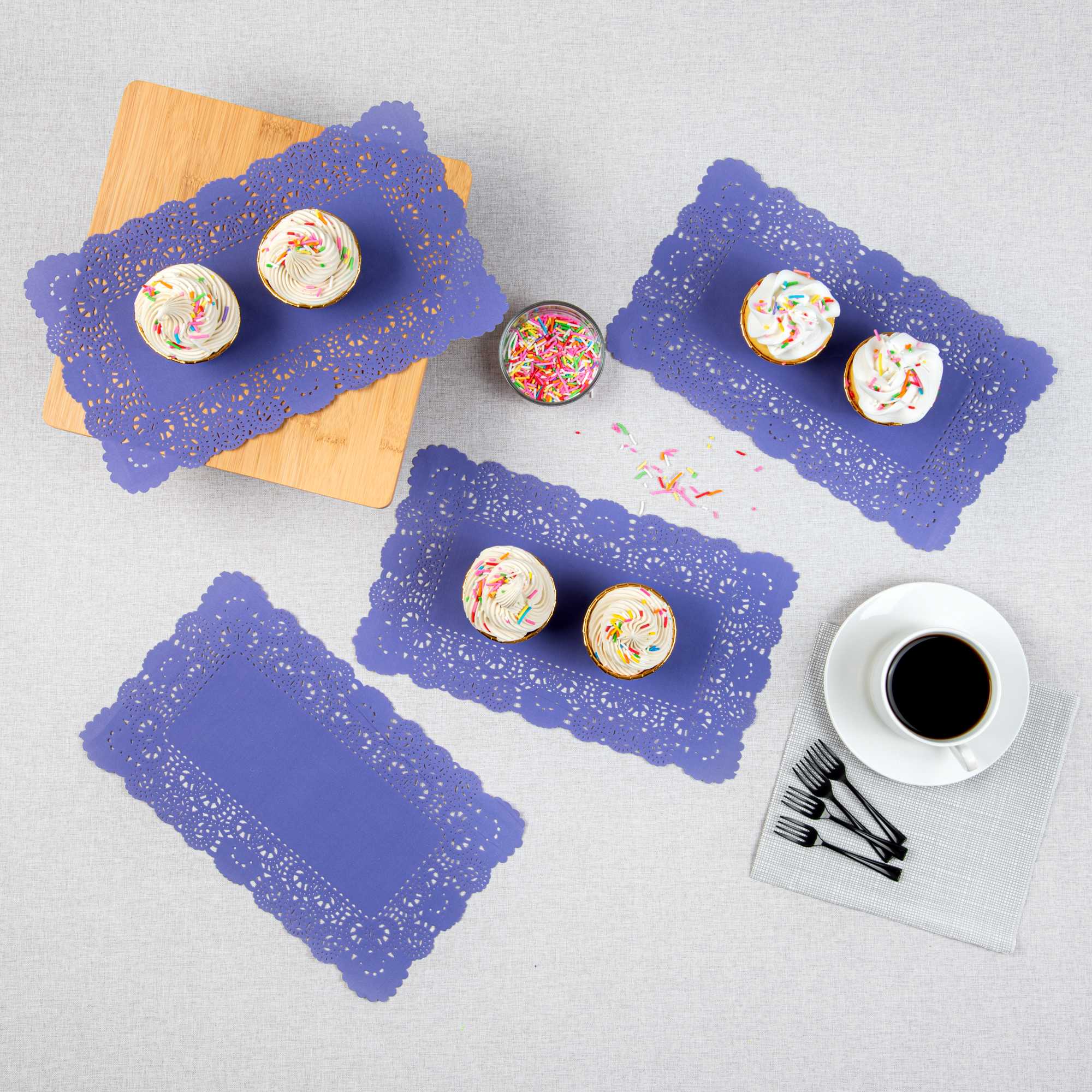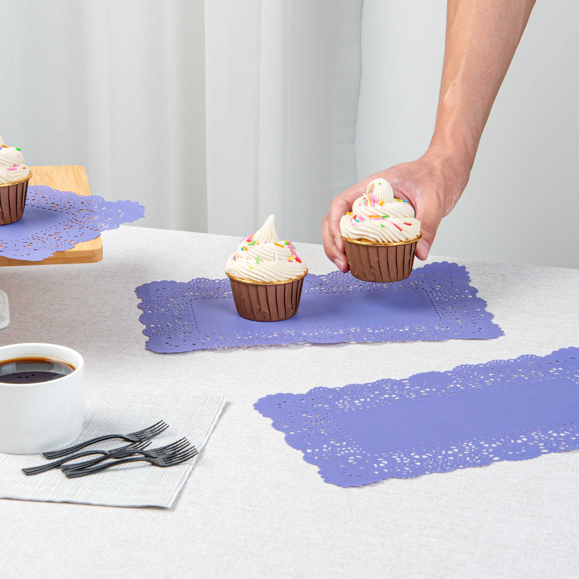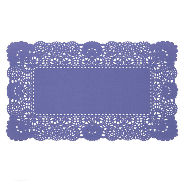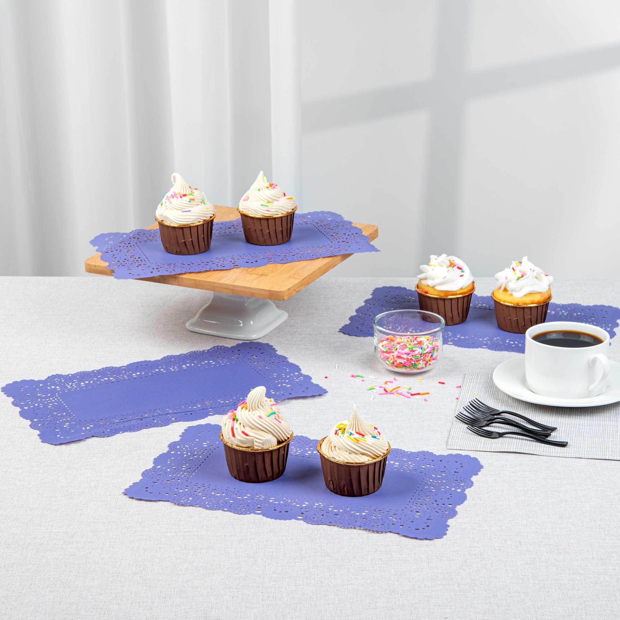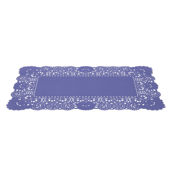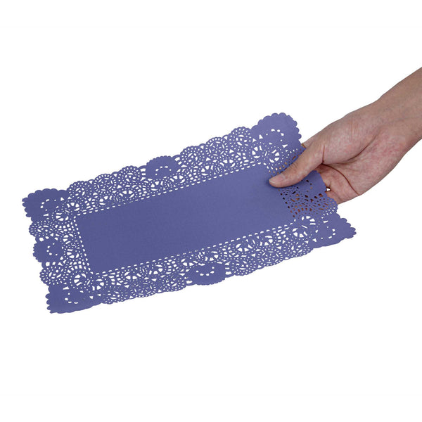 Elevate your dessert displays with our Pastry Tek Rectangle Purple Paper Doilies, designed to add an elegant touch to any setting. Crafted from high-quality paper, these durable lace doilies ensure your desserts and other desserts remain beautifully presented without tearing. Featuring intricate lace-like details, these table doilies enhance the visual appeal of food presentations while serving as functional barriers that protect surfaces and absorb moisture. The purple finish of these colored paper doilies adds versatility, allowing them to complement a wide range of table settings and themes, making them ideal for various events and occasions. These disposable paper doilies eradicate the hassle of post-event cleanup, offering a convenient and time-saving solution for busy hosts and food establishments. Perfect for use under cupcakes, petit fours, macarons, and other small treats, these small doilies measure 12 inches in length by 7 inches in width. Sold in a 100 count box.
