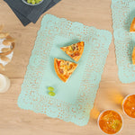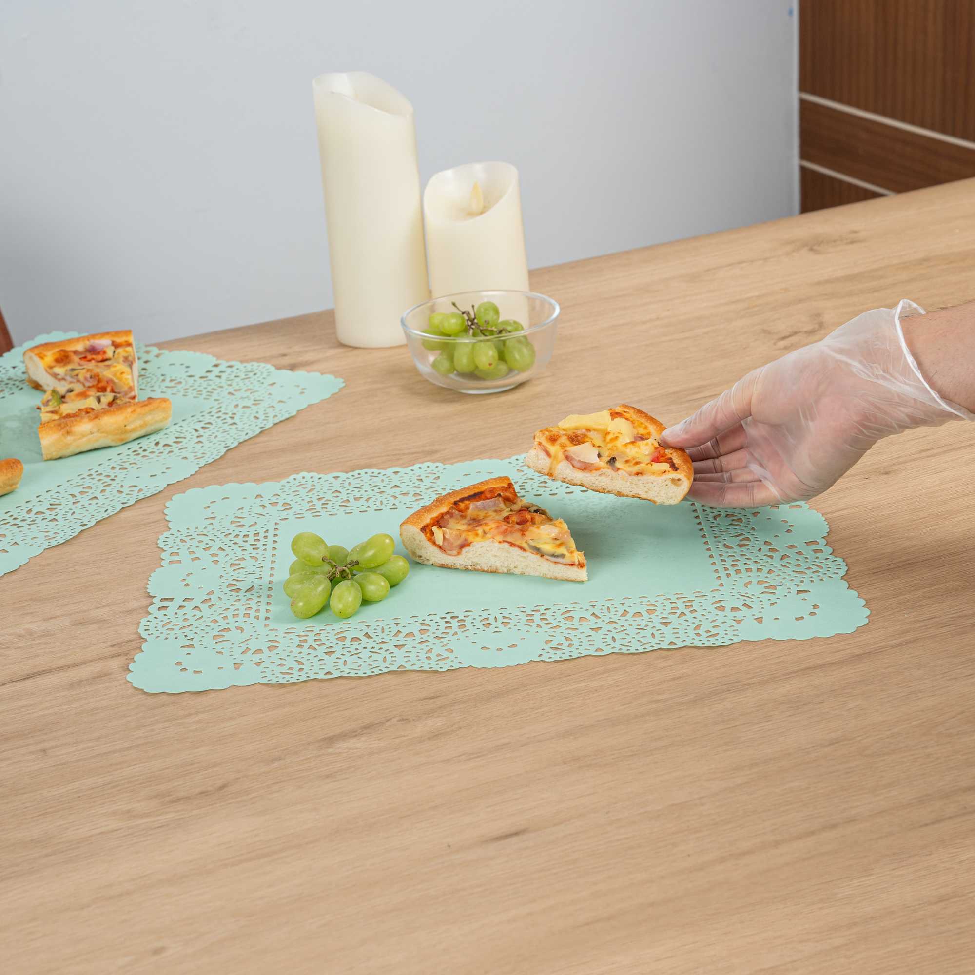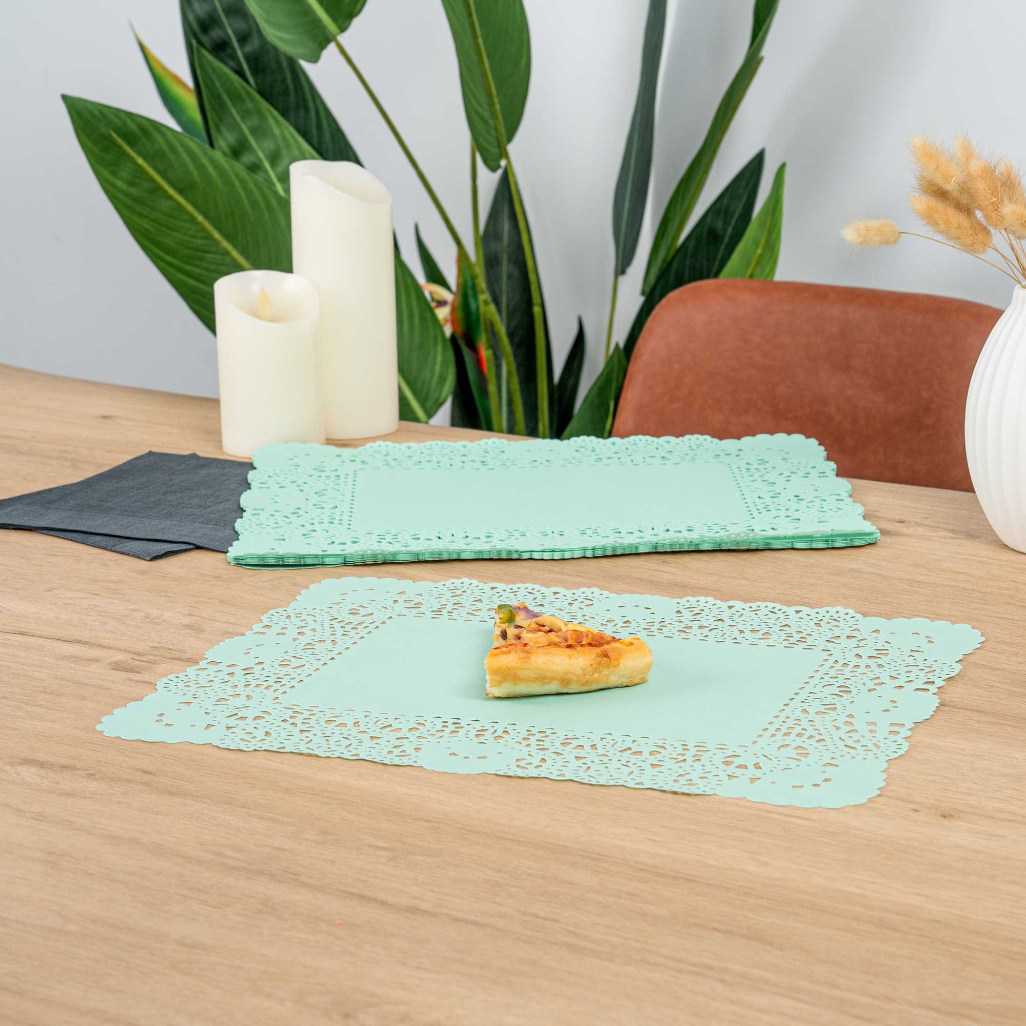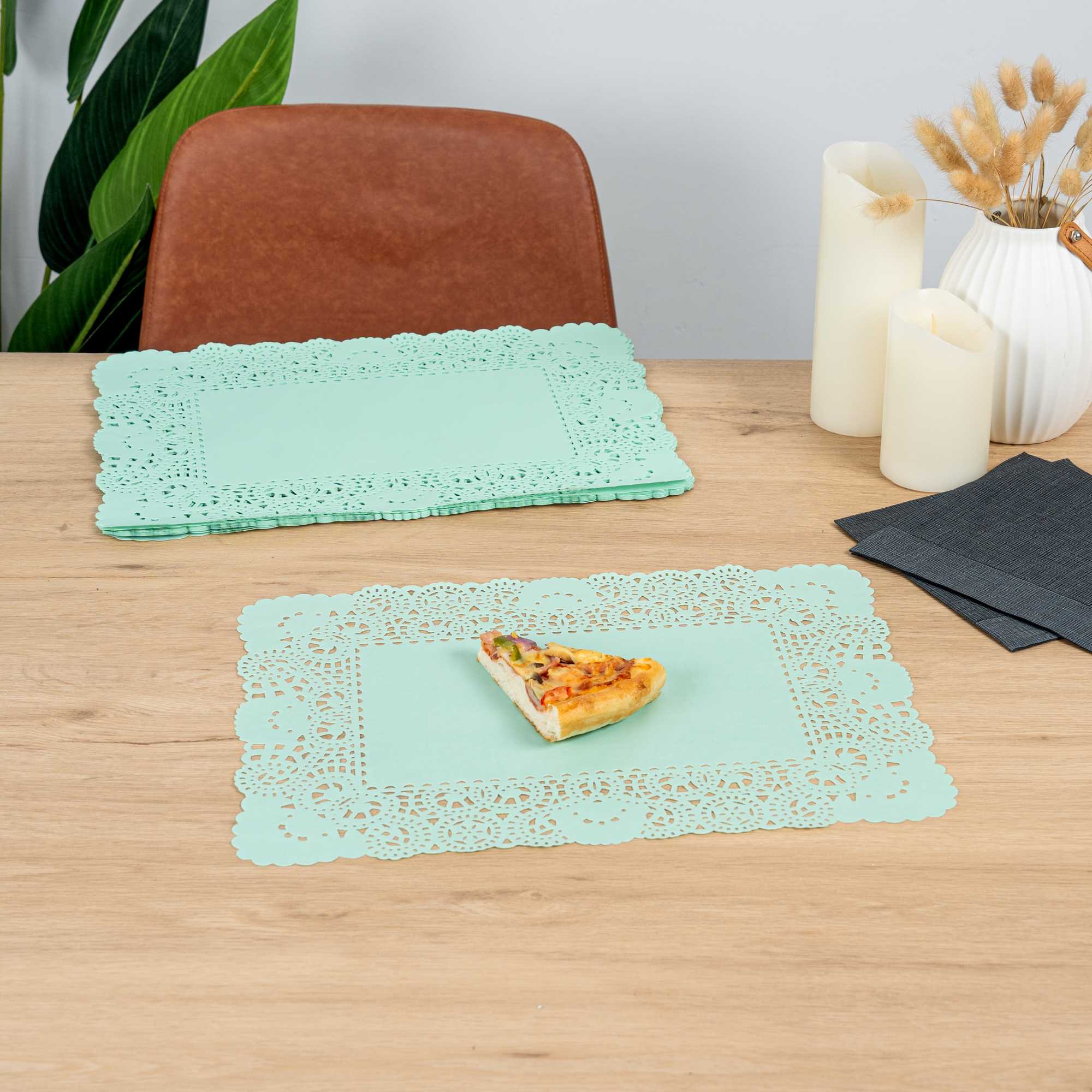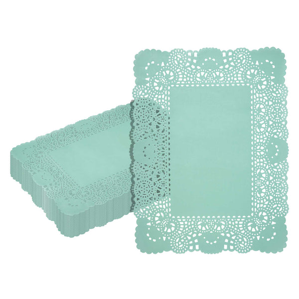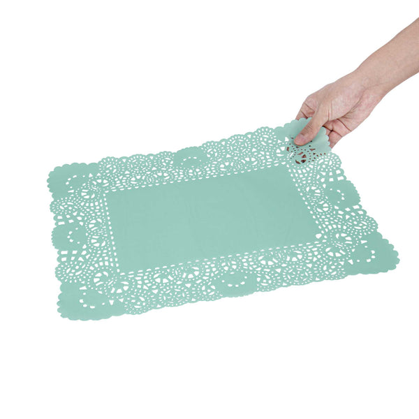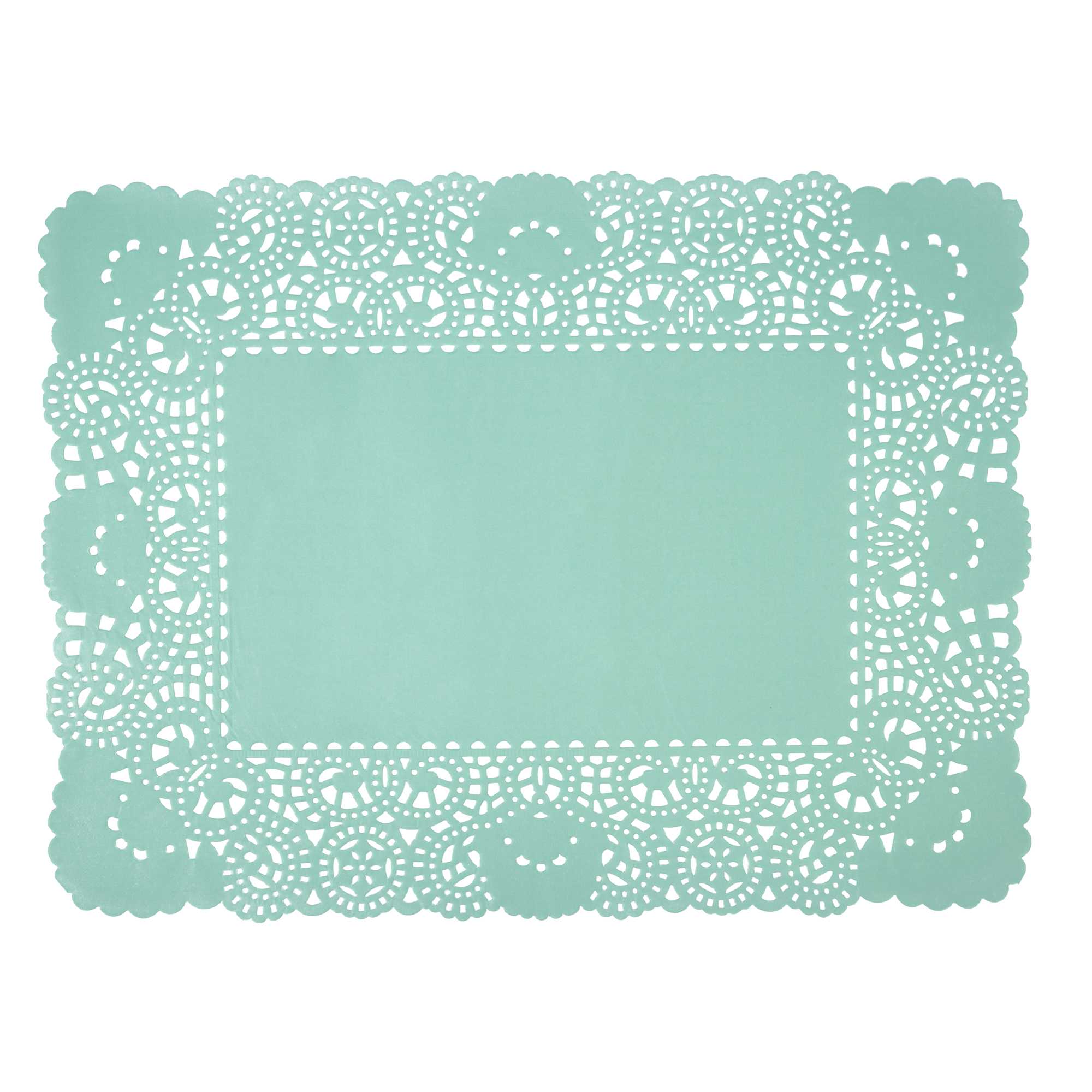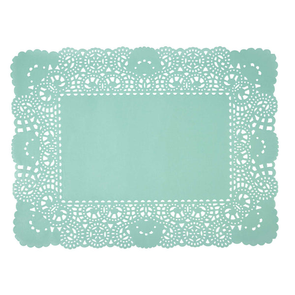 Enhance your dessert displays with our Pastry Tek Rectangle Teal Paper Doilies, perfect for adding an elegant touch to any presentation. Crafted from high-quality paper, these lace doilies provide exceptional durability, ensuring that desserts at bakeries or catered luncheons remain beautifully showcased without tearing. Designed with intricate lace-like details, these table doilies not only elevate the visual appeal of food presentations but also serve as functional barriers, protecting surfaces and absorbing moisture. With a teal finish finish, these colored paper doilies seamlessly complement a wide range of table settings and themes, making them an excellent choice for various events and occasions. Disposable by design, these small doilies eradicate the hassle of post-event cleanup, offering a convenient and time-saving solution for busy hosts and food establishments. Perfect for use under cupcakes, dessert platter, finger foods, and small treats, these table doilies measure 15.75 inches in length by 12 inches in width. Sold in a 100 count box.