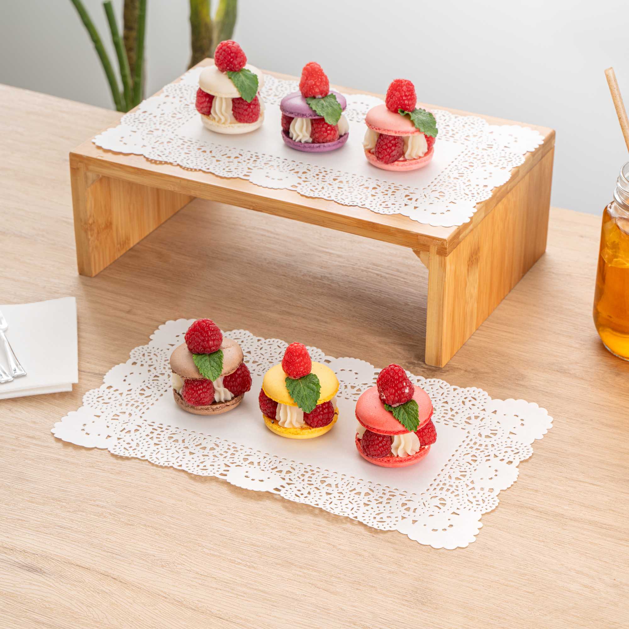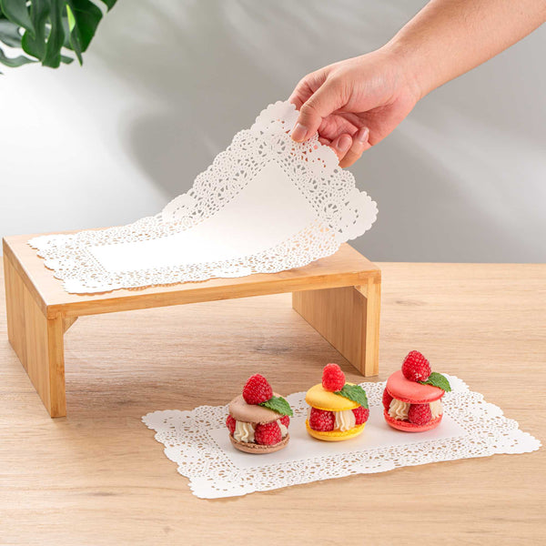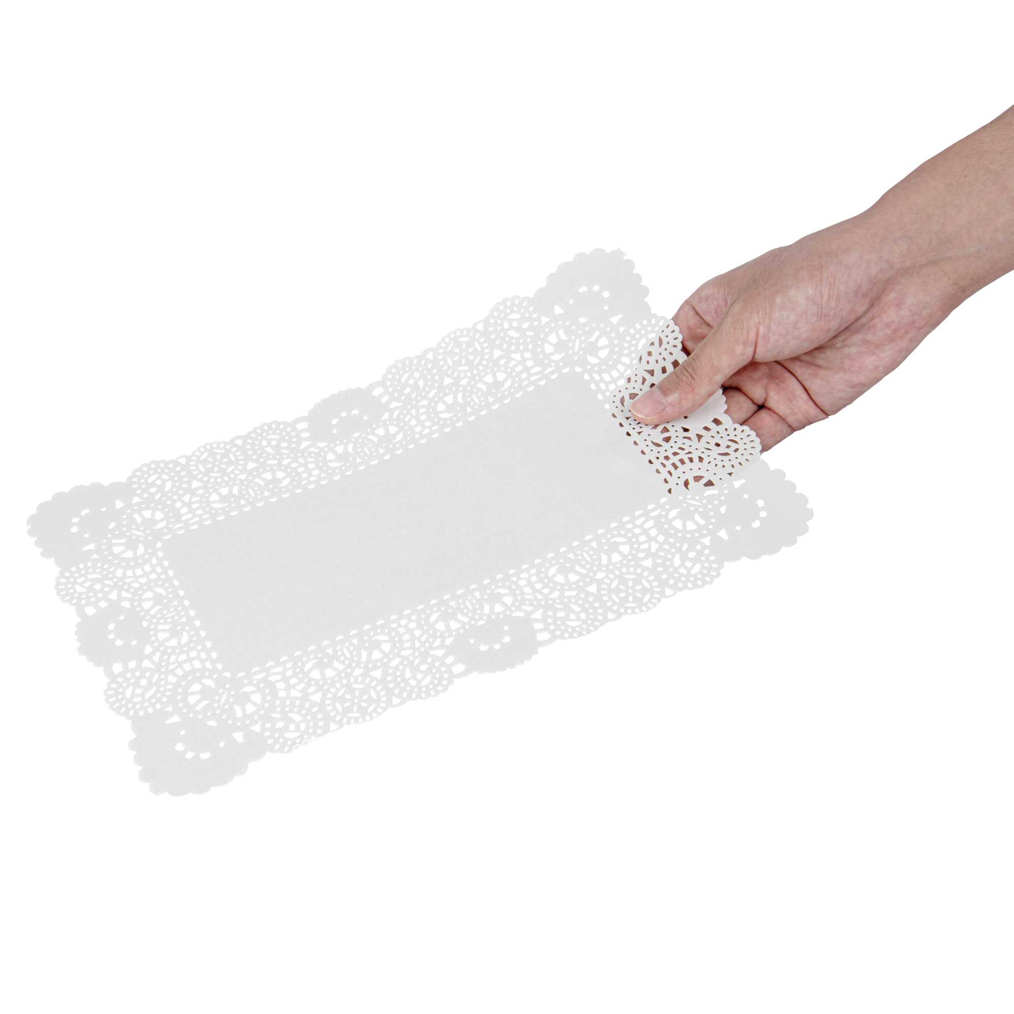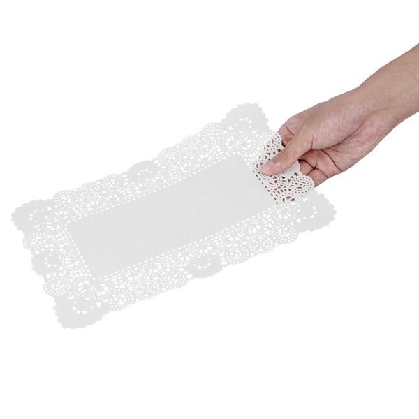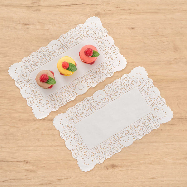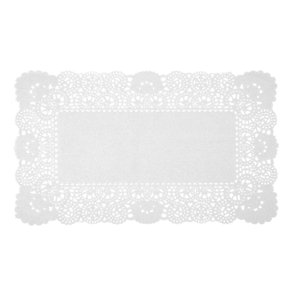Enhance the elegance of your dessert displays with our Pastry Tek Rectangle White Paper Doilies. Crafted from high-quality paper, these durable lace doilies ensure that desserts at bakeries or catered luncheons remain intact without tearing or losing their structural integrity. Designed with intricate lace-like details, these table doilies not only increase the visual appeal of food presentations but also serve as functional barriers, protecting surfaces and absorbing moisture. The white colored paper doilies complement a wide range of table settings and themes, making them an ideal choice for various events and occasions. These disposable doilies eradicate the hassle of post-event cleanup, offering a convenient and time-saving solution for busy hosts and food establishments. Perfect for use under cupcakes, petit fours, macarons, and other small treats, these small paper doilies measure 12 inches in length by 7 inches in width. Sold in a 4,000 count box.