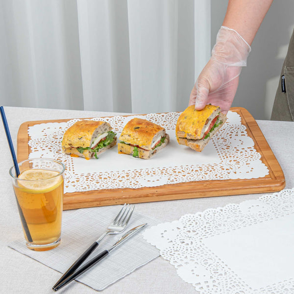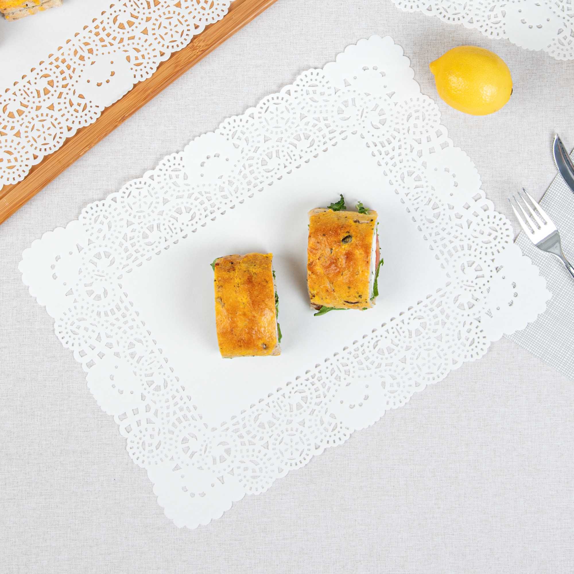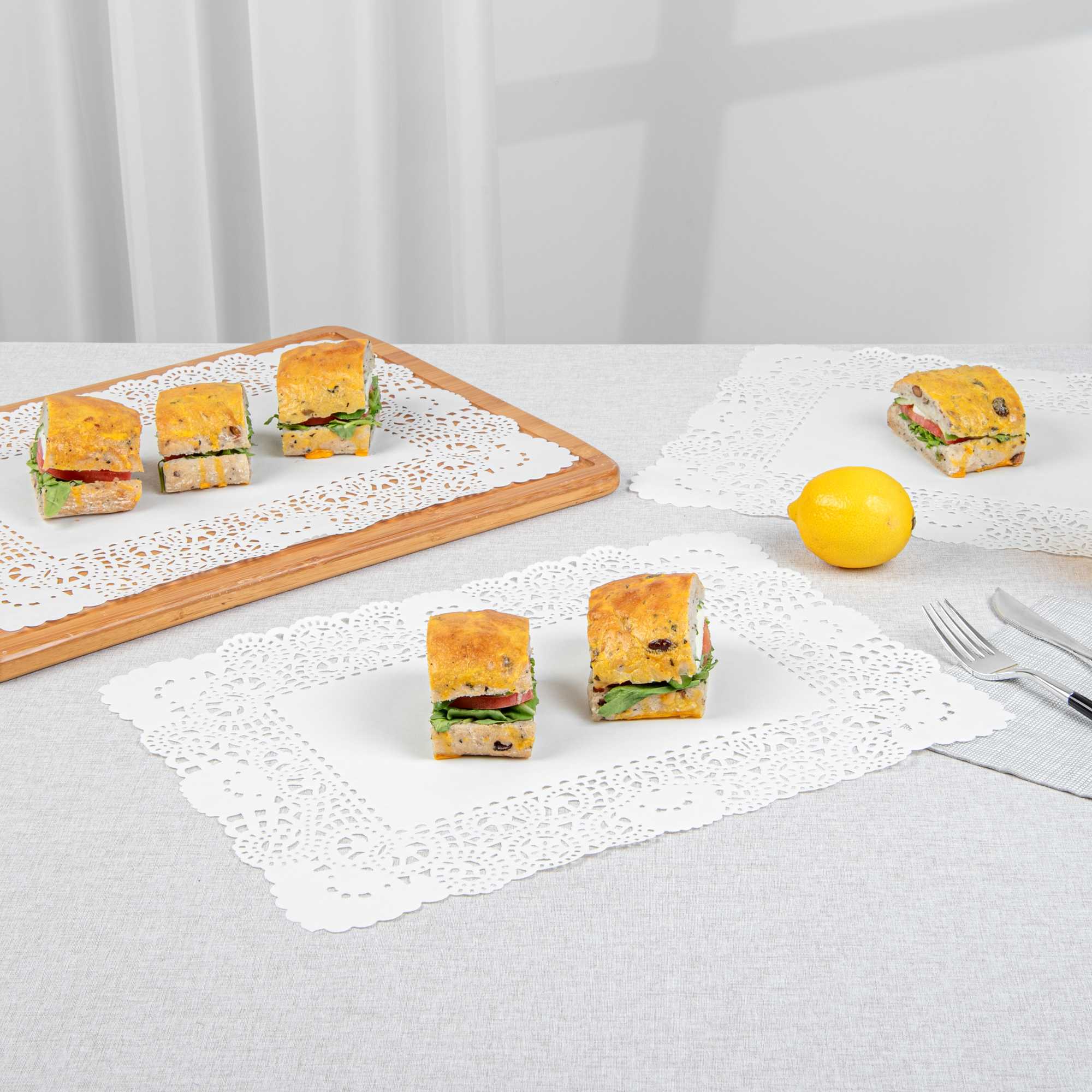 Elevate your dessert presentations with our Pastry Tek Rectangle White Paper Doilies, designed to add an elegant touch to any display. Crafted from high-quality paper, these lace doilies provide exceptional durability, ensuring that desserts and other treats at bakeries or catered luncheons remain perfectly presented without tearing or losing their structural integrity. Featuring intricate lace-like details, these table doilies not only enhance the visual appeal of your food presentations but also serve as functional barriers by protecting surfaces and absorbing moisture. The versatile white finish of these paper doilies allows them to complement a wide range of table settings and themes, making them an ideal choice for various events and occasions. Disposable by design, these small doilies offer a convenient and time-saving solution for busy hosts and food establishments, eliminating the hassle of post-event cleanup. Perfect for use under cupcakes, dessert platter, finger foods, and small treats, these paper doilies measure 15.75 inches in length by 12 inches in width. Sold in a 4,000 count box.