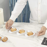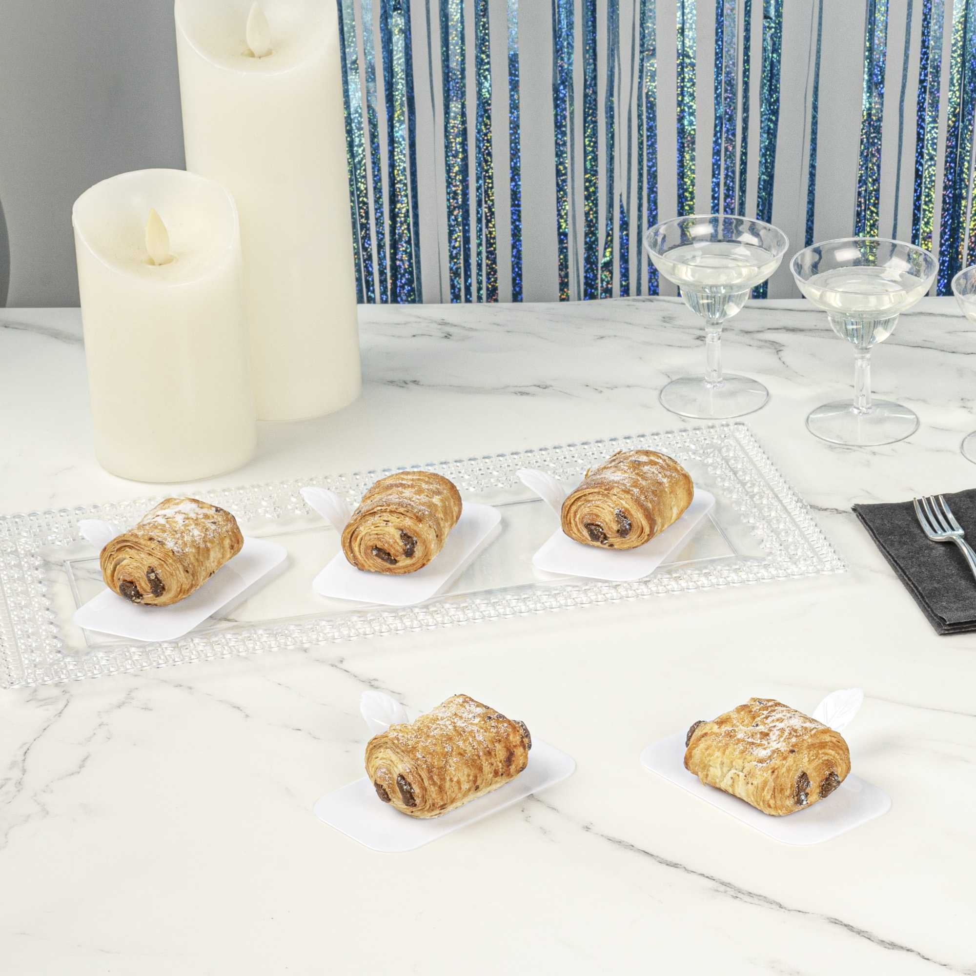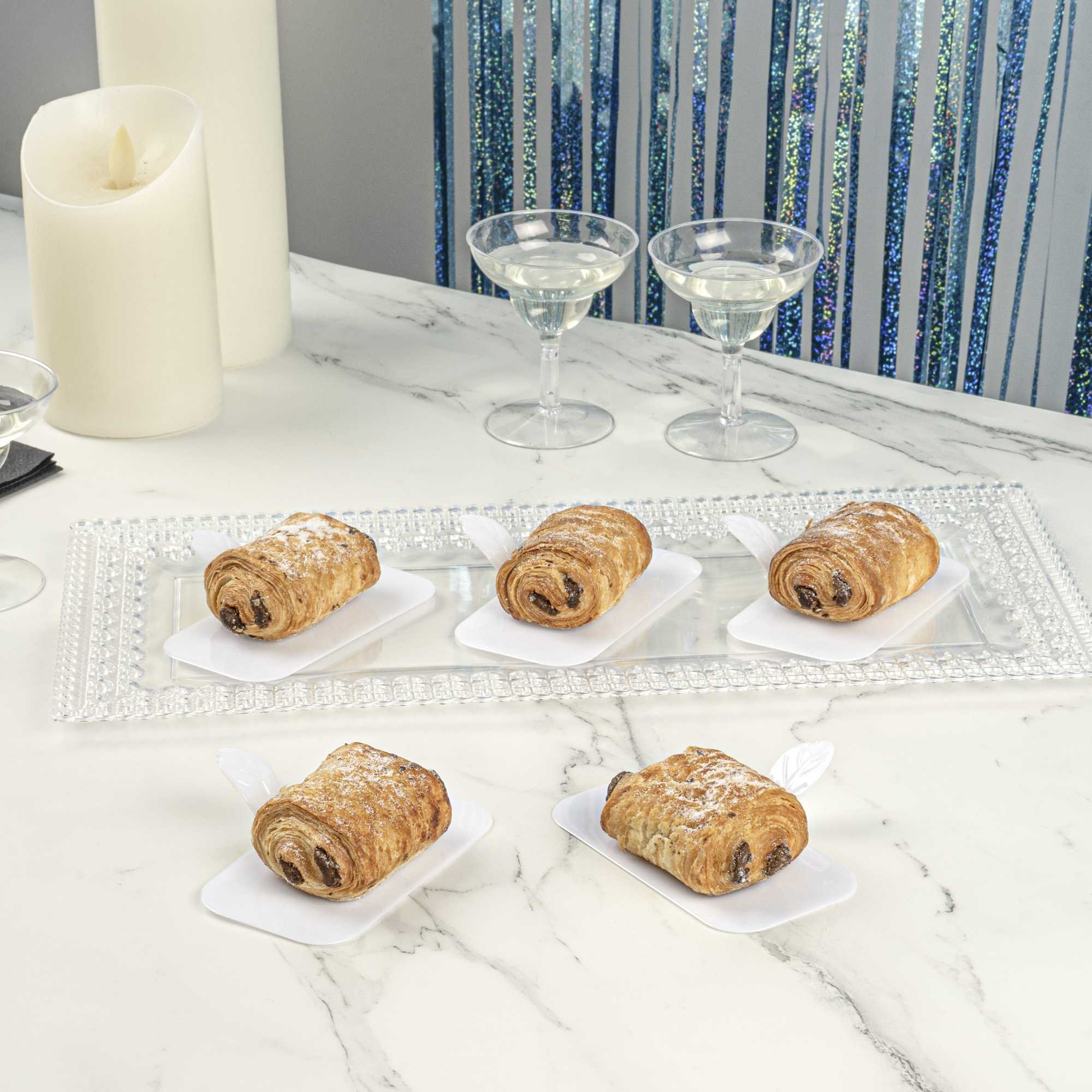 Serve your delightful pastries using our Pastry Tek Rectangle White Plastic Pastry Pallets. Manufactured from premium plastic, these rectangle plastic plates incorporate an ergonomic handle, enabling a mess-free and beautiful serving of your delightful treats. With a charming leaf-patterned handle, these disposable cake plates will elegantly enhance your sweet offerings.These white plastic plates complement various tablescapes. Each pastry dish is disposable, enabling an easy cleanup. These dessert serving trays measure 4 inches in length by 2.25 inches in width by 1 inch in height. Sold in a 100 count box.