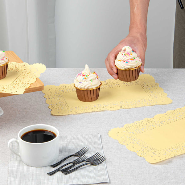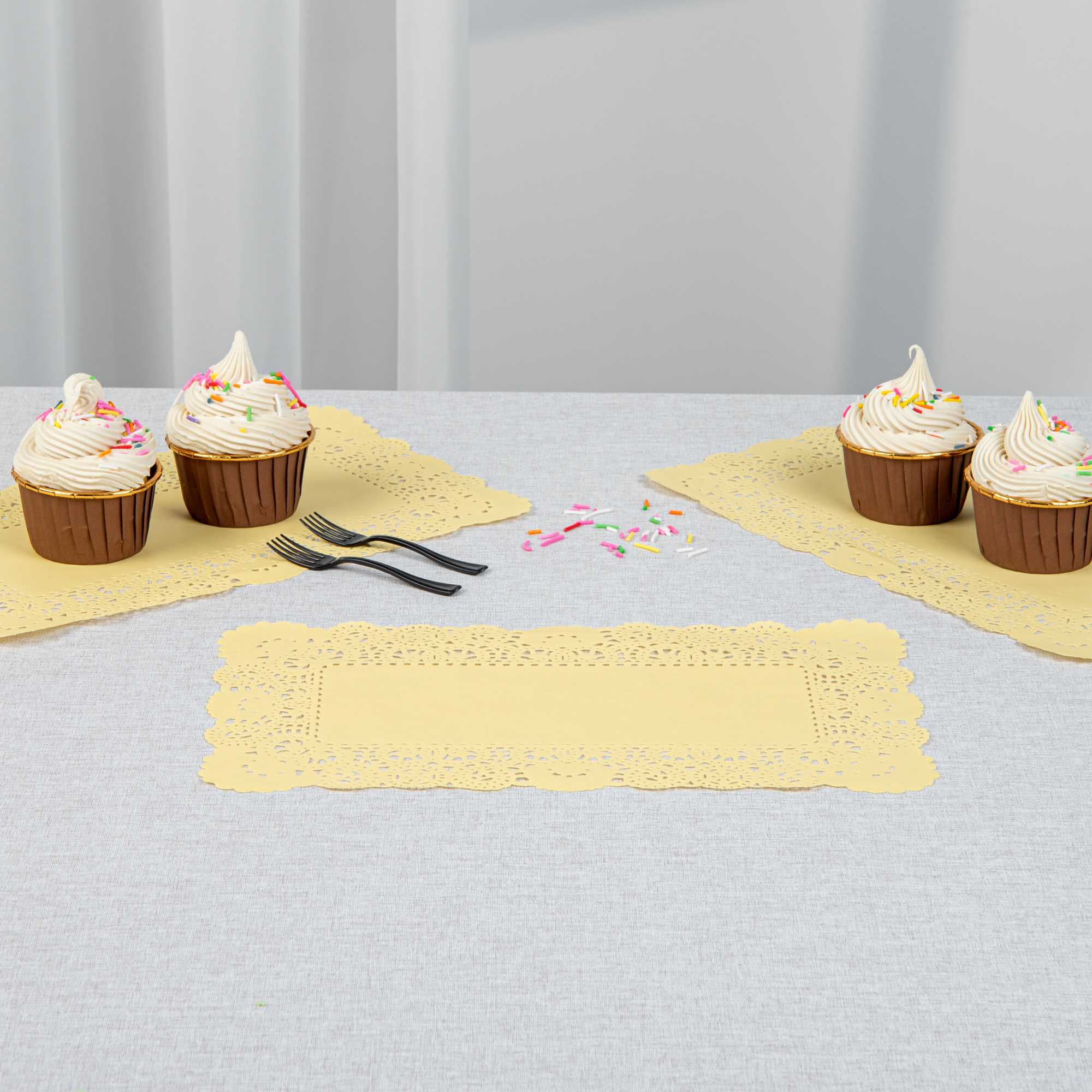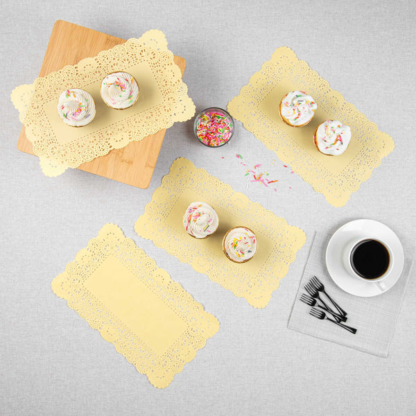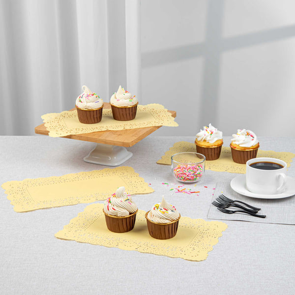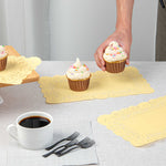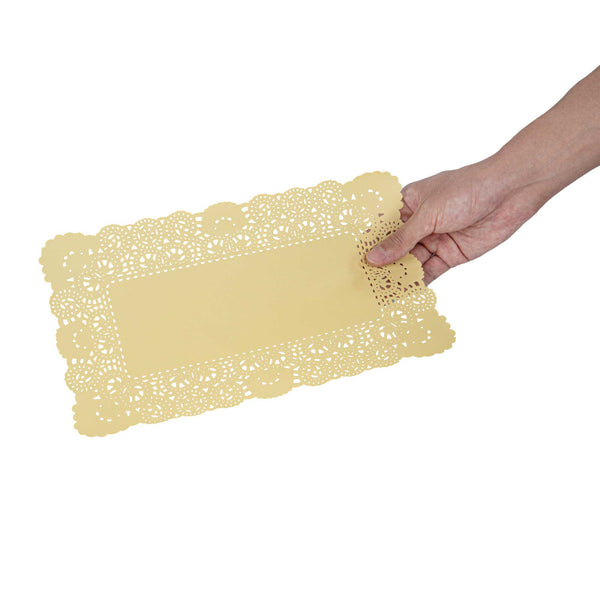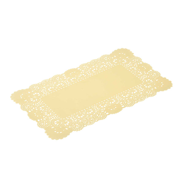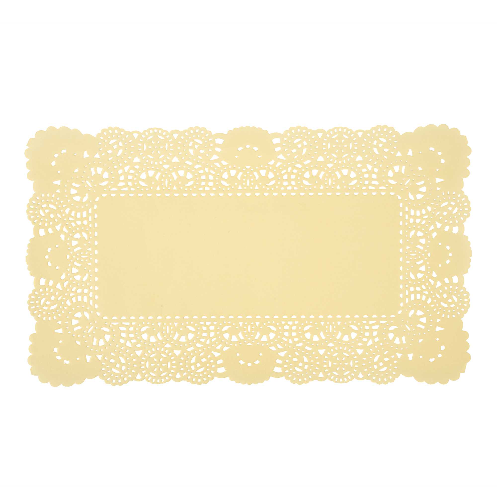 Enhance your dessert displays with our Pastry Tek Rectangle Yellow Paper Doilies. Crafted from high-quality paper, these lace doilies provide durability, ensuring your desserts remain intact whether at bakeries or catered luncheons. With intricate lace-like details, these table doilies not only boost the visual appeal of food presentations but also serve as functional barriers, protecting surfaces and absorbing moisture. The yellow colored finish of these paper doilies is versatile, allowing them to seamlessly complement a wide range of table settings. These lace doilies are disposable, eliminating the hassle of post-event cleanup and offering a convenient, time-saving solution for busy hosts and food establishments. Ideal for use under cupcakes, petit fours, macarons, and other small treats, these small doilies add an elegant touch to any presentation. Measuring 12 inches in length by 7 inches in width, these colored paper doilies are the perfect size for a variety of uses. Sold in a 100 count box.